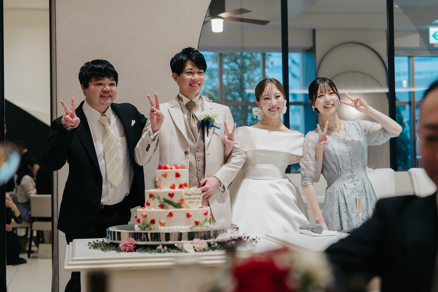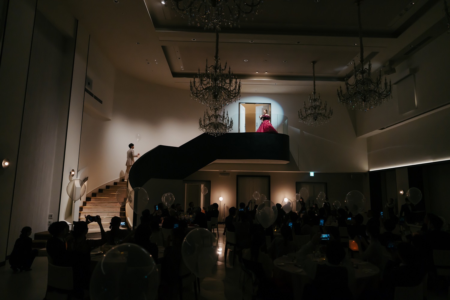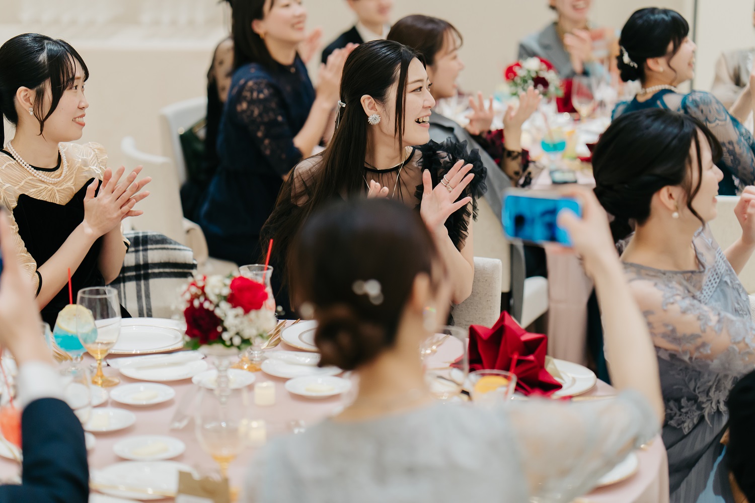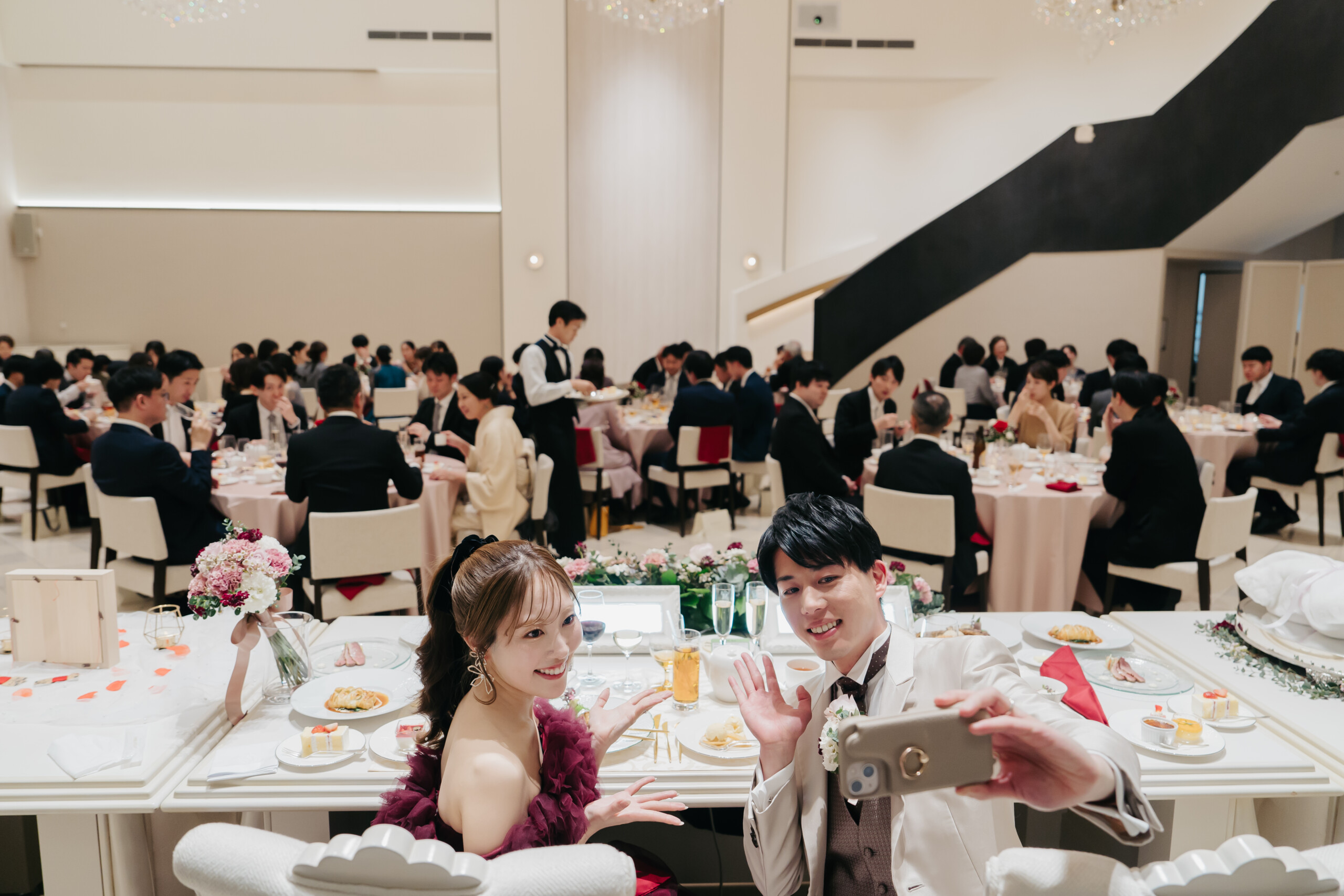 おふたりが選ばれたのは、こだわりのコーディネートが映える白を基調としたパーティ会場「グラス」。ご新婦様の夢であった階段入場が実現できる華やかな空間で、ピンクや赤を中心に、テーブルクロスやお花、ウェディングケーキまでおふたりの個性が光る素敵なコーディネートが施されていました。ゲスト想いのおふたりは席札へのサプライズメッセージや開宴前の時間もおもてなしができるウェルカムパーティ、ファーストバイトの後にはゲストへのサプライズバイトを行い、ゲストの皆様からも大好評。お色直しのエスコート役はおふたりともに弟様をサプライズでご指名され、親御様にご兄弟が揃った姿をお見せできる素敵なシーンとなりました。