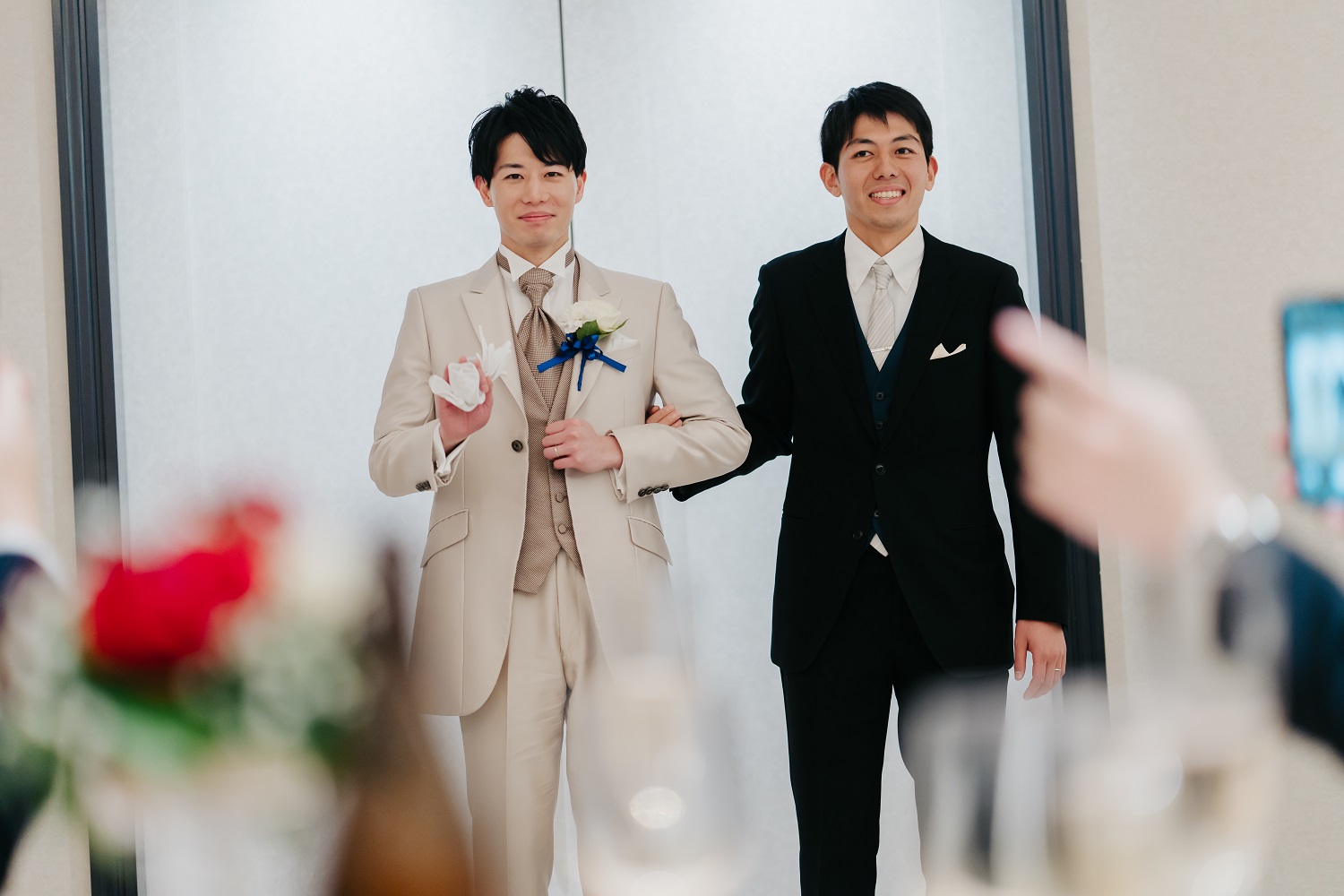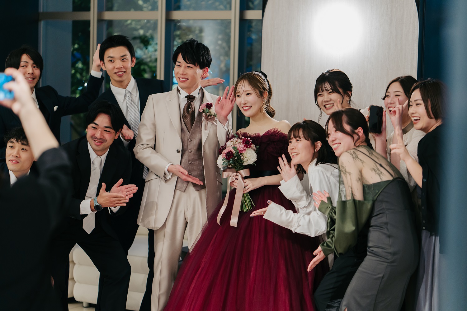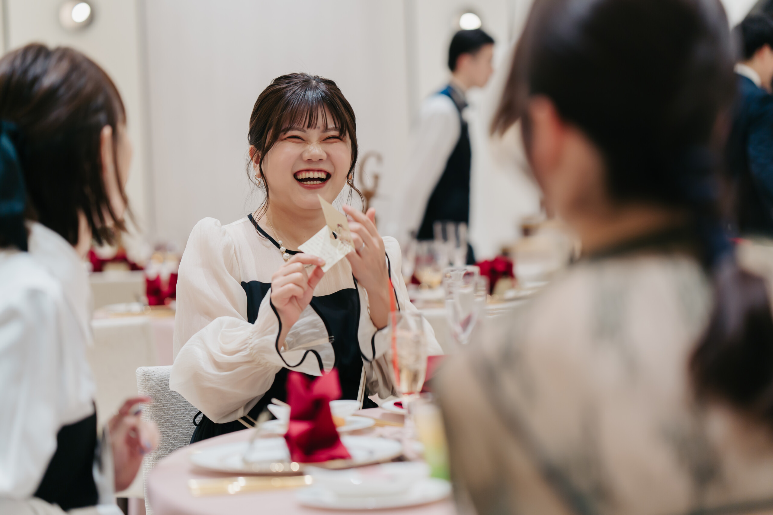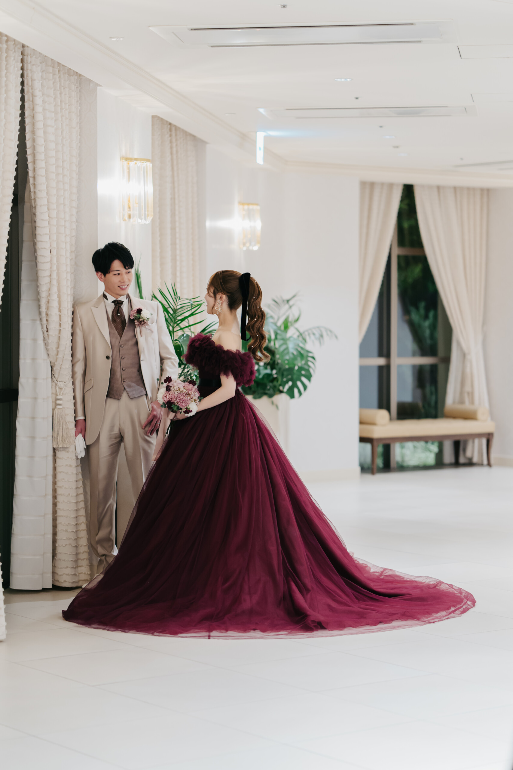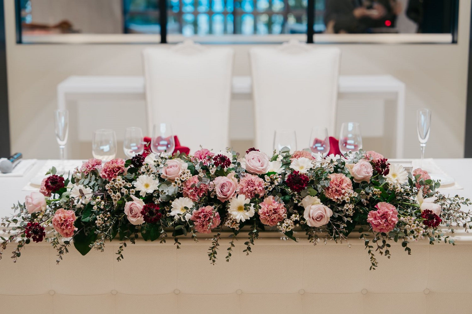 おふたりが選ばれたのは、こだわりのコーディネートが映える白を基調としたパーティ会場「グラス」。ご新婦様の夢であった階段入場が実現できる華やかな空間で、ピンクや赤を中心に、テーブルクロスやお花、ウェディングケーキまでおふたりの個性が光る素敵なコーディネートが施されていました。ゲスト想いのおふたりは席札へのサプライズメッセージや開宴前の時間もおもてなしができるウェルカムパーティ、ファーストバイトの後にはゲストへのサプライズバイトを行い、ゲストの皆様からも大好評。お色直しのエスコート役はおふたりともに弟様をサプライズでご指名され、親御様にご兄弟が揃った姿をお見せできる素敵なシーンとなりました。