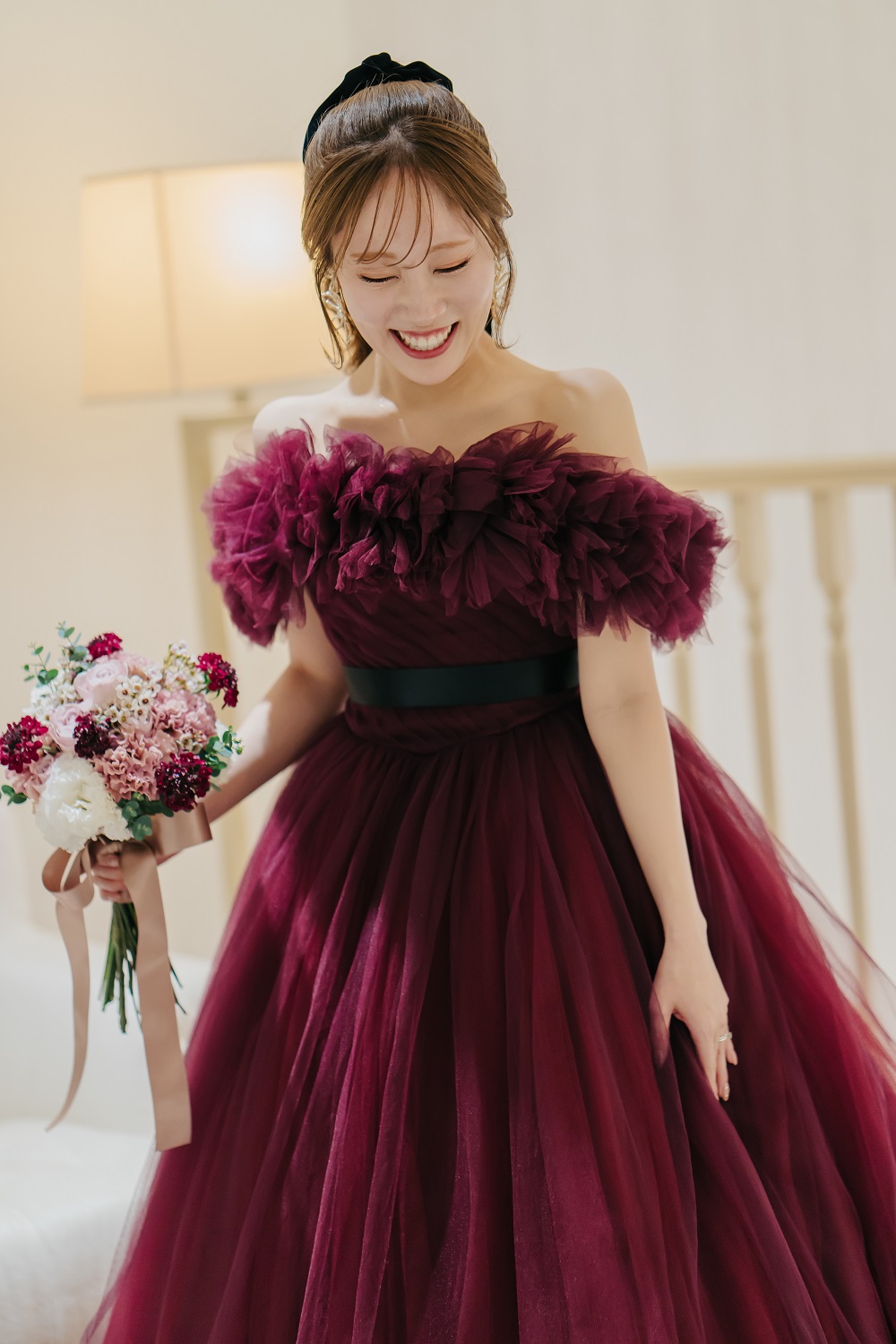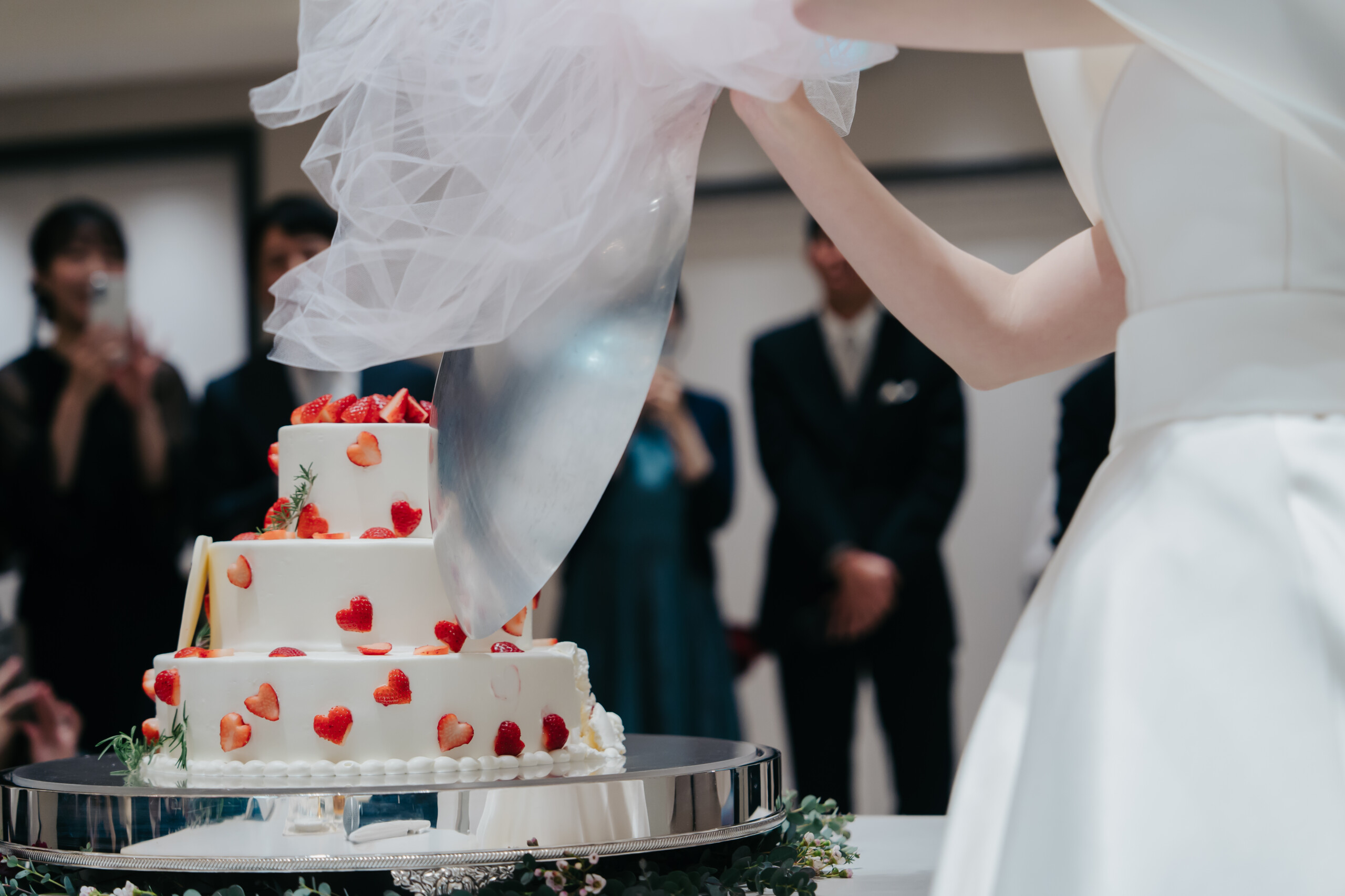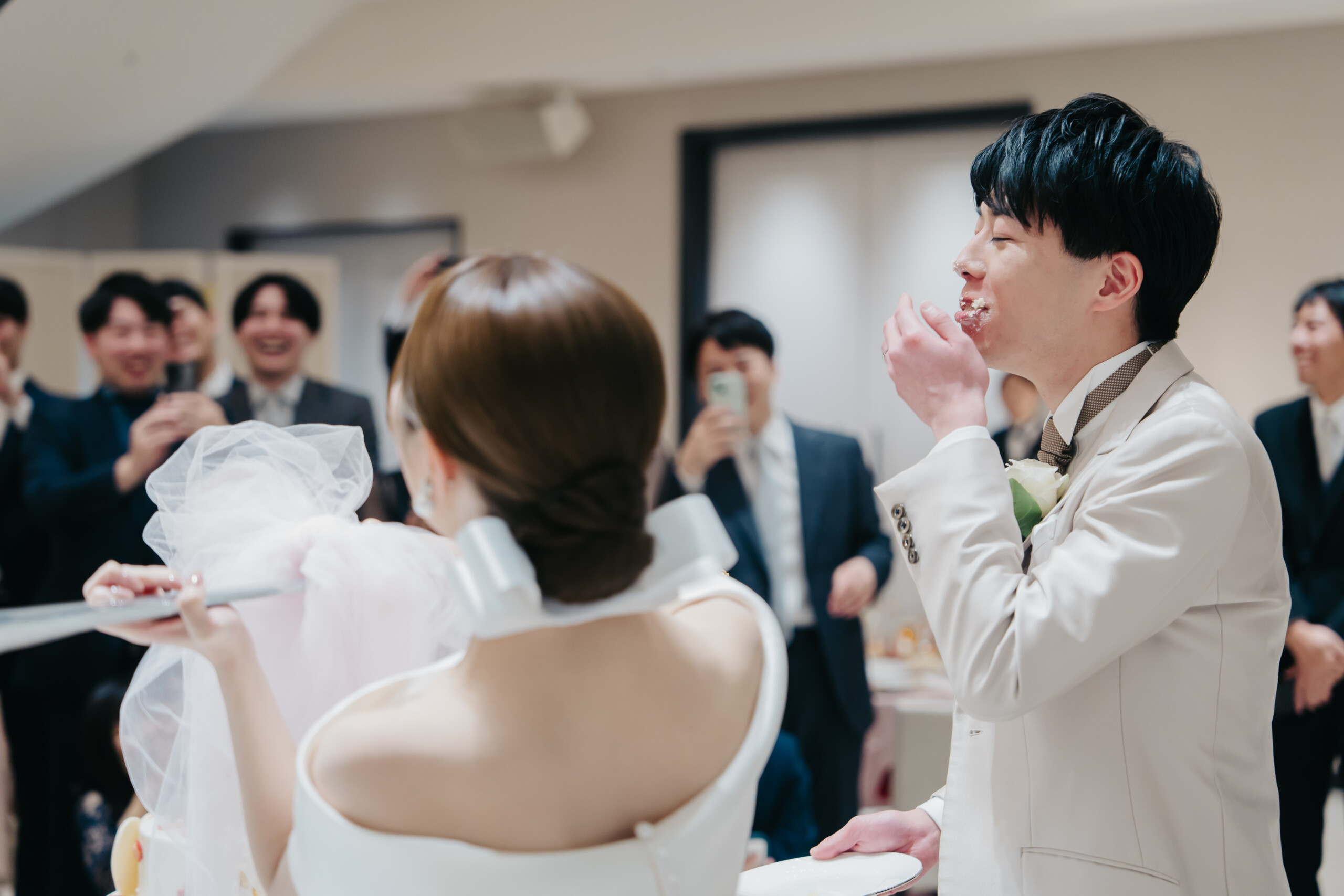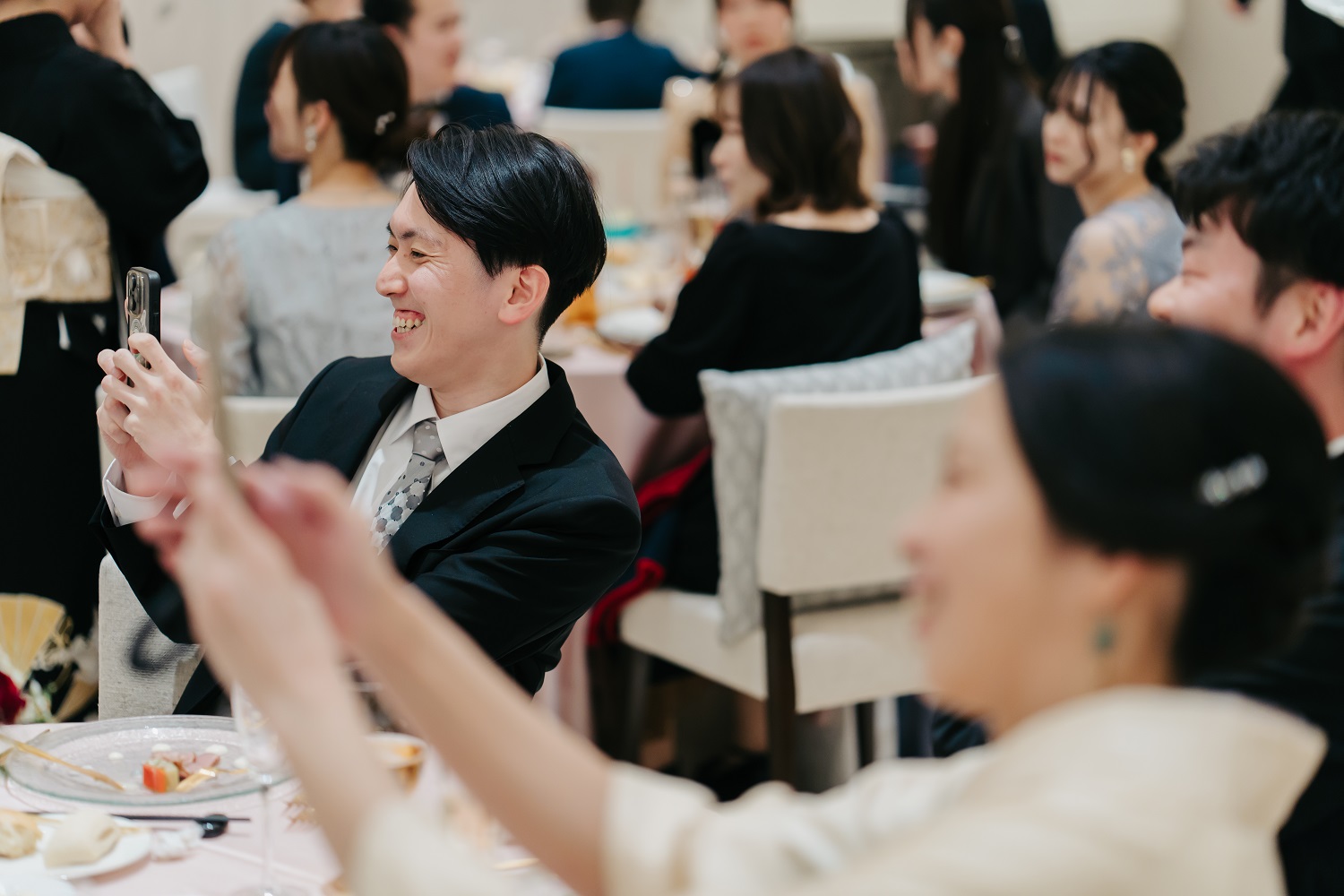 おふたりが選ばれたのは、こだわりのコーディネートが映える白を基調としたパーティ会場「グラス」。ご新婦様の夢であった階段入場が実現できる華やかな空間で、ピンクや赤を中心に、テーブルクロスやお花、ウェディングケーキまでおふたりの個性が光る素敵なコーディネートが施されていました。ゲスト想いのおふたりは席札へのサプライズメッセージや開宴前の時間もおもてなしができるウェルカムパーティ、ファーストバイトの後にはゲストへのサプライズバイトを行い、ゲストの皆様からも大好評。お色直しのエスコート役はおふたりともに弟様をサプライズでご指名され、親御様にご兄弟が揃った姿をお見せできる素敵なシーンとなりました。