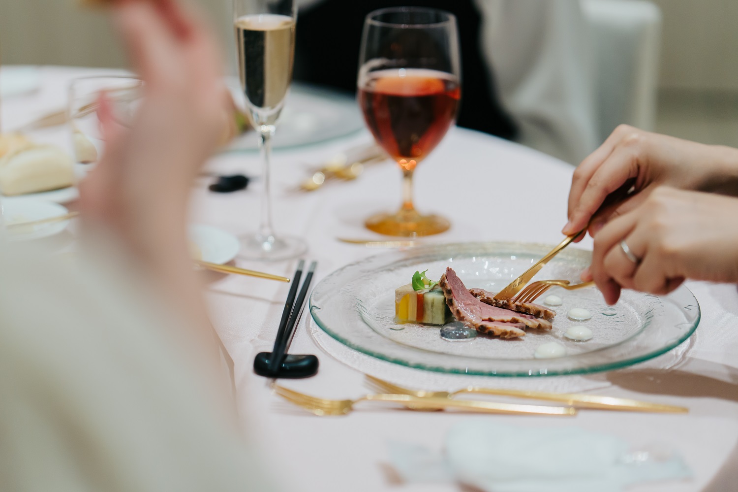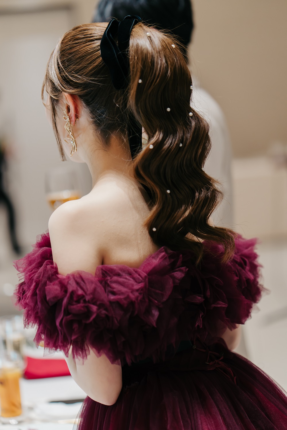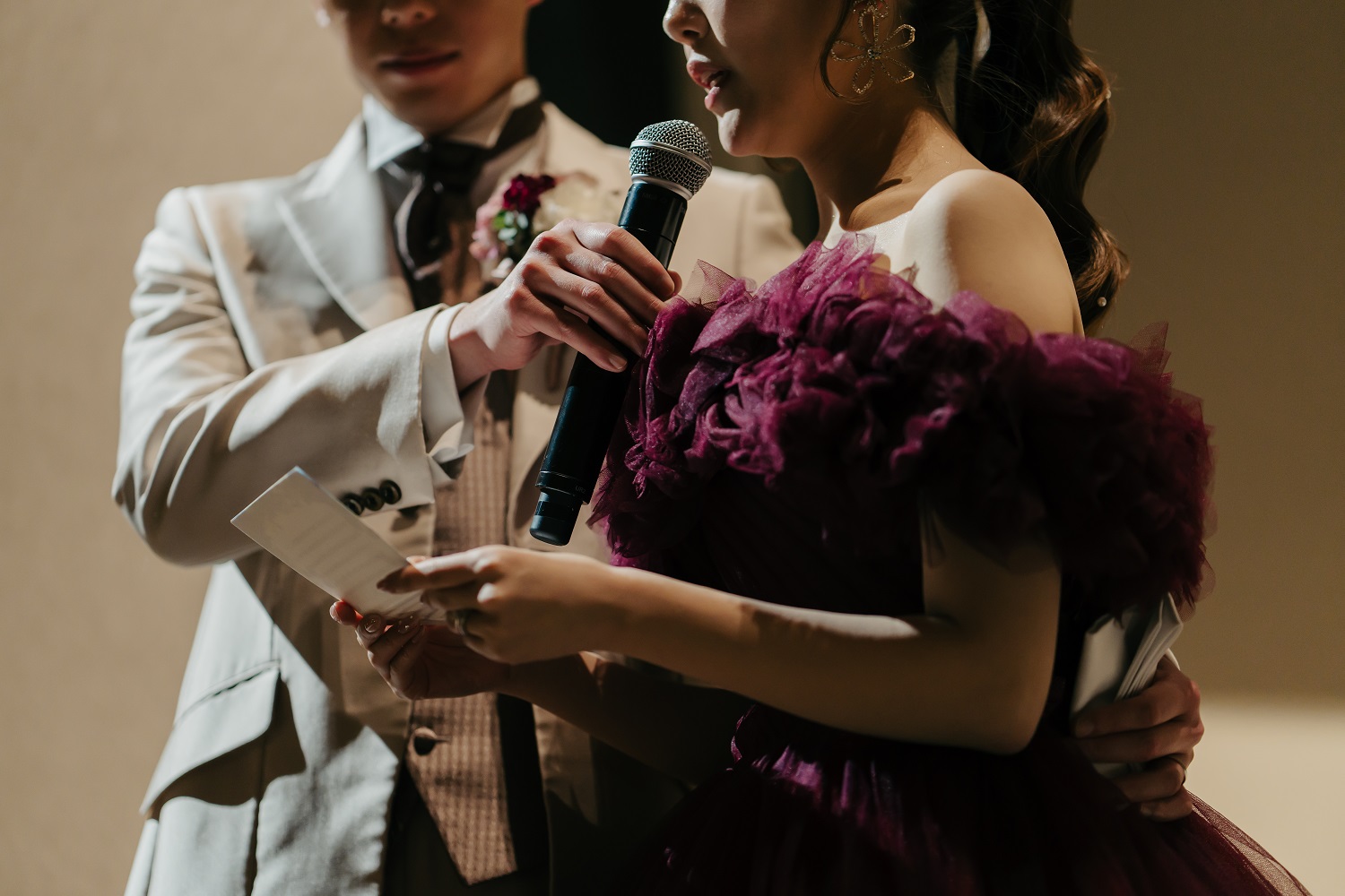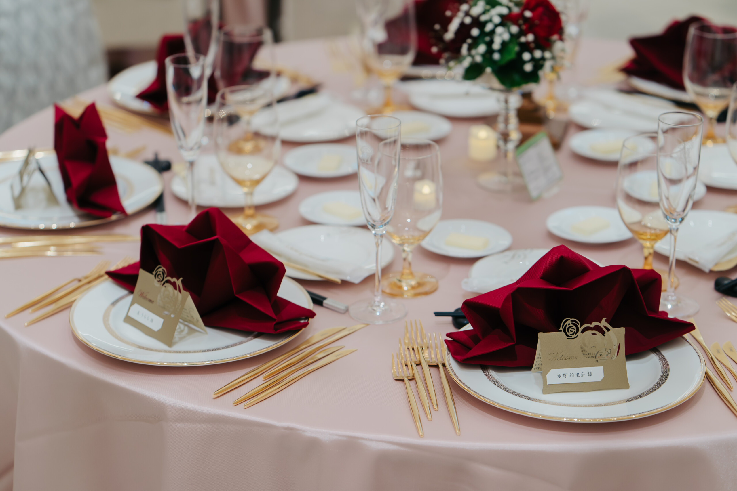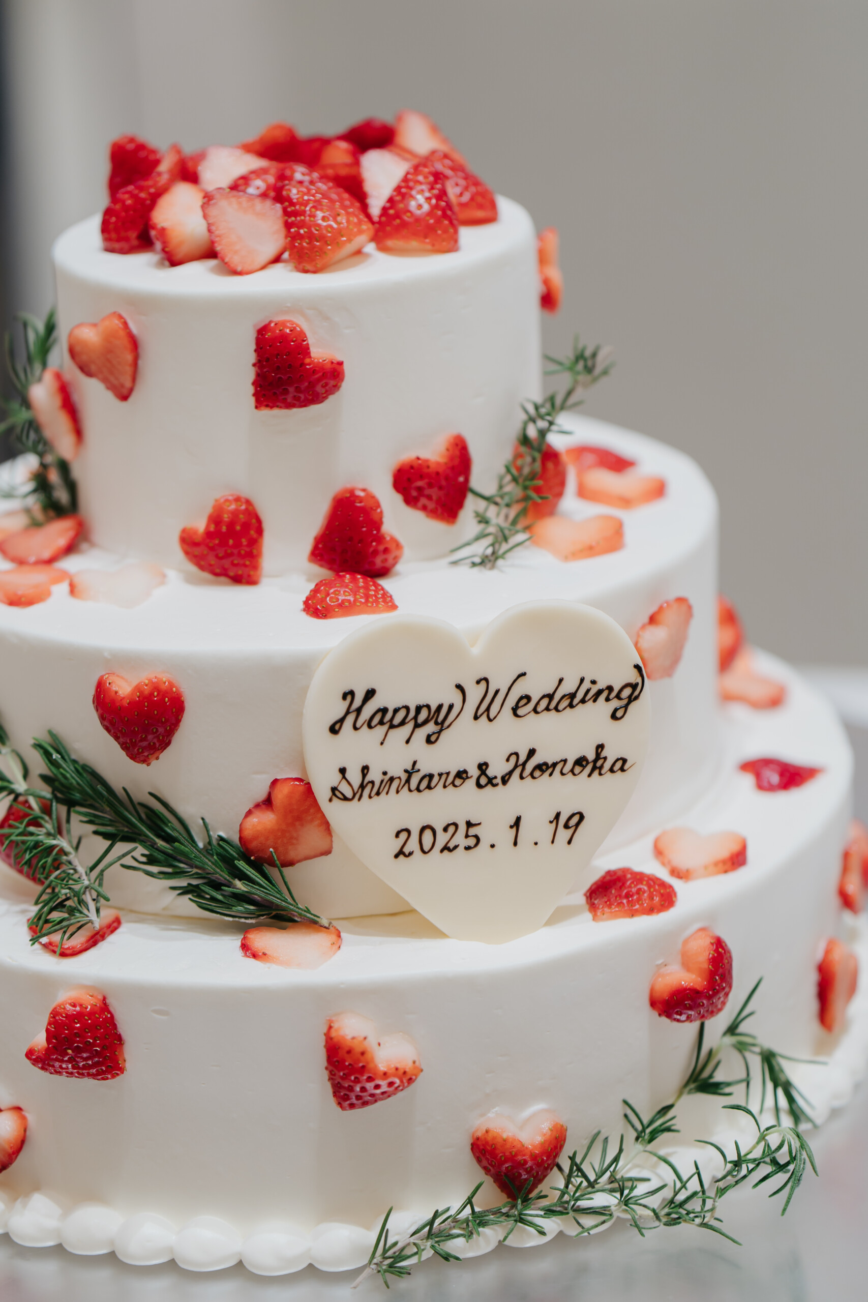 おふたりが選ばれたのは、こだわりのコーディネートが映える白を基調としたパーティ会場「グラス」。ご新婦様の夢であった階段入場が実現できる華やかな空間で、ピンクや赤を中心に、テーブルクロスやお花、ウェディングケーキまでおふたりの個性が光る素敵なコーディネートが施されていました。ゲスト想いのおふたりは席札へのサプライズメッセージや開宴前の時間もおもてなしができるウェルカムパーティ、ファーストバイトの後にはゲストへのサプライズバイトを行い、ゲストの皆様からも大好評。お色直しのエスコート役はおふたりともに弟様をサプライズでご指名され、親御様にご兄弟が揃った姿をお見せできる素敵なシーンとなりました。