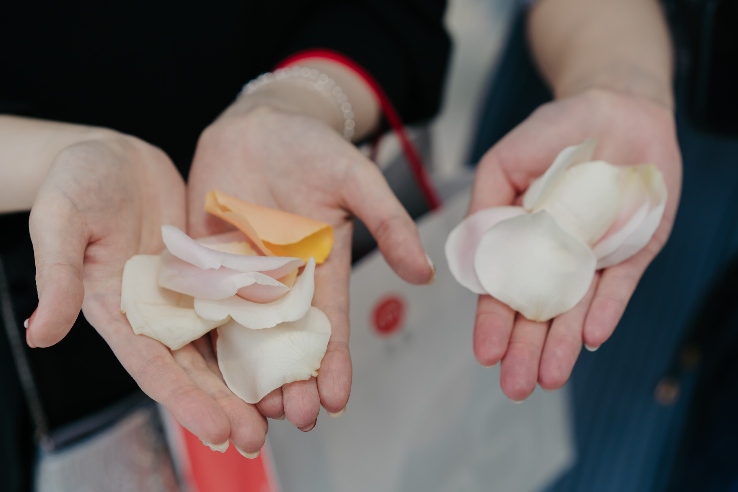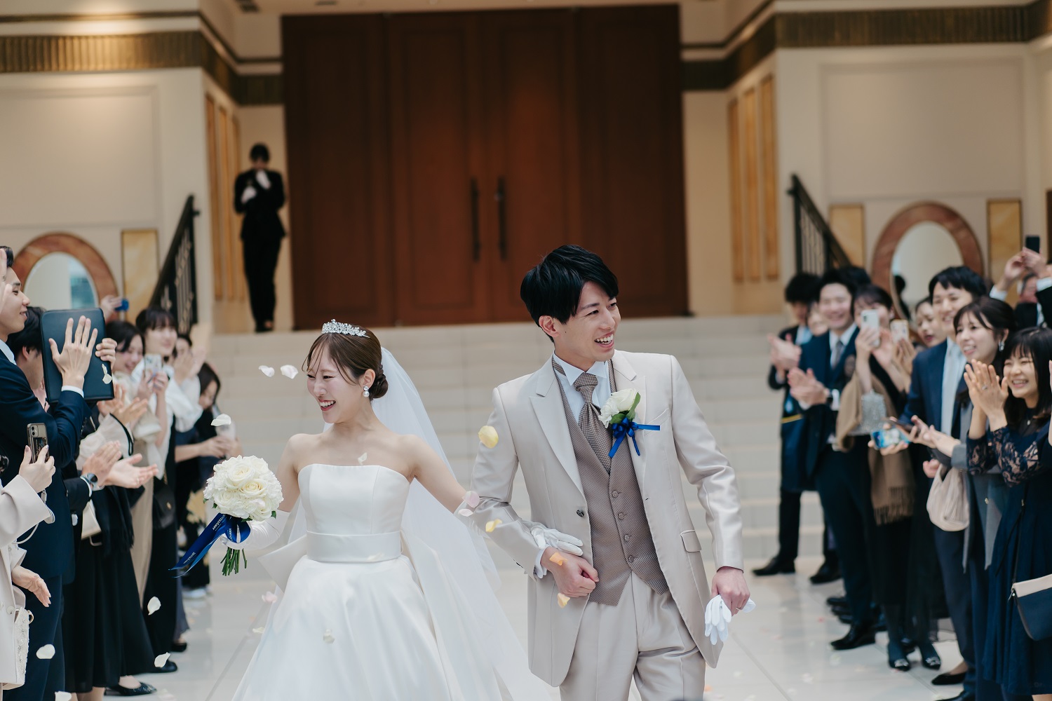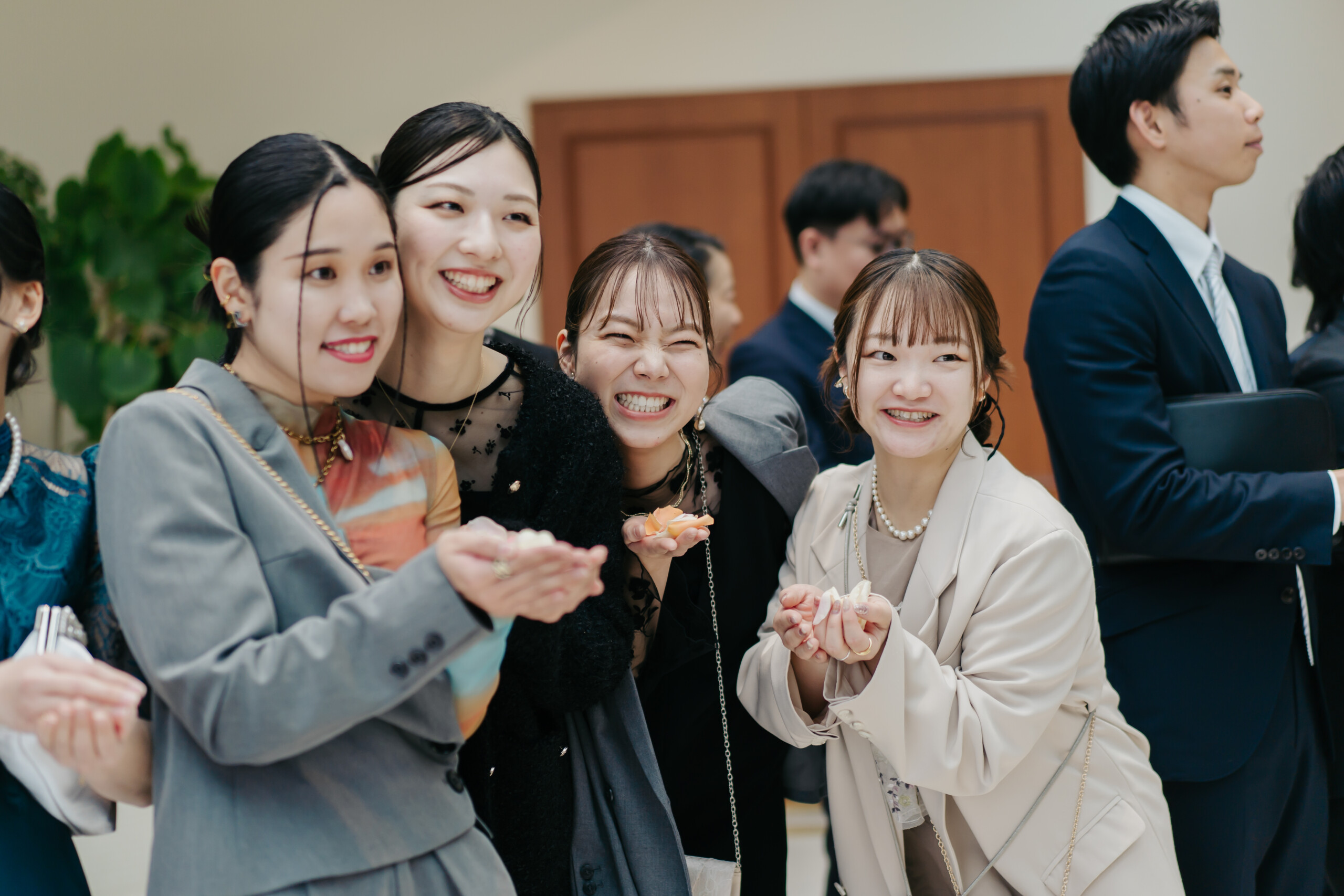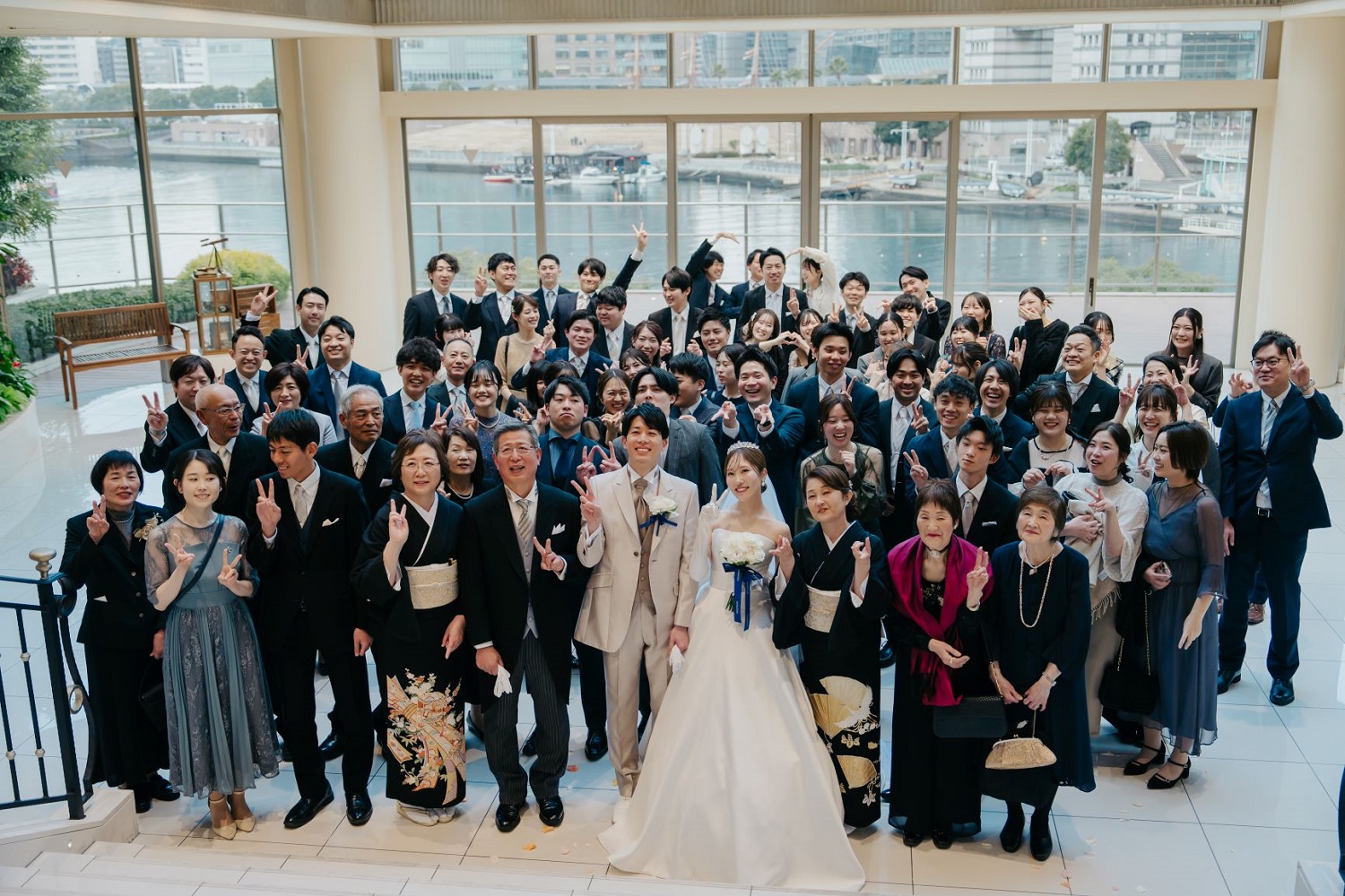 おふたりが大好きなみなとみらいの街を一望できるガラス張りのアトリウムで行われたのは、憧れのフラワーシャワー。挙式後の緊張がほぐれたおふたりとゲストの皆様のたくさん笑顔があふれ、「おめでとう」「ありがとう」と温かな想いが交わるひとときとなりました。