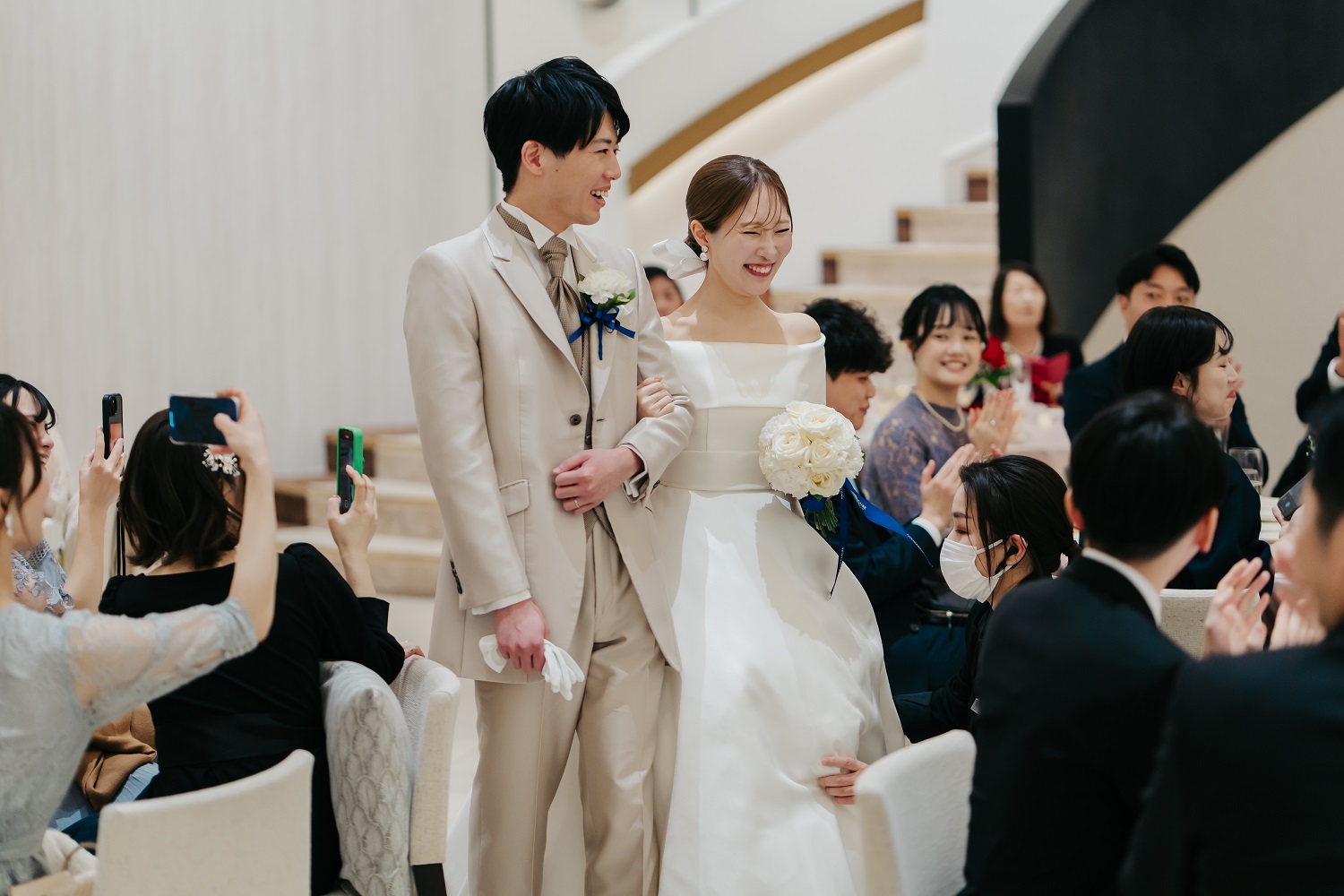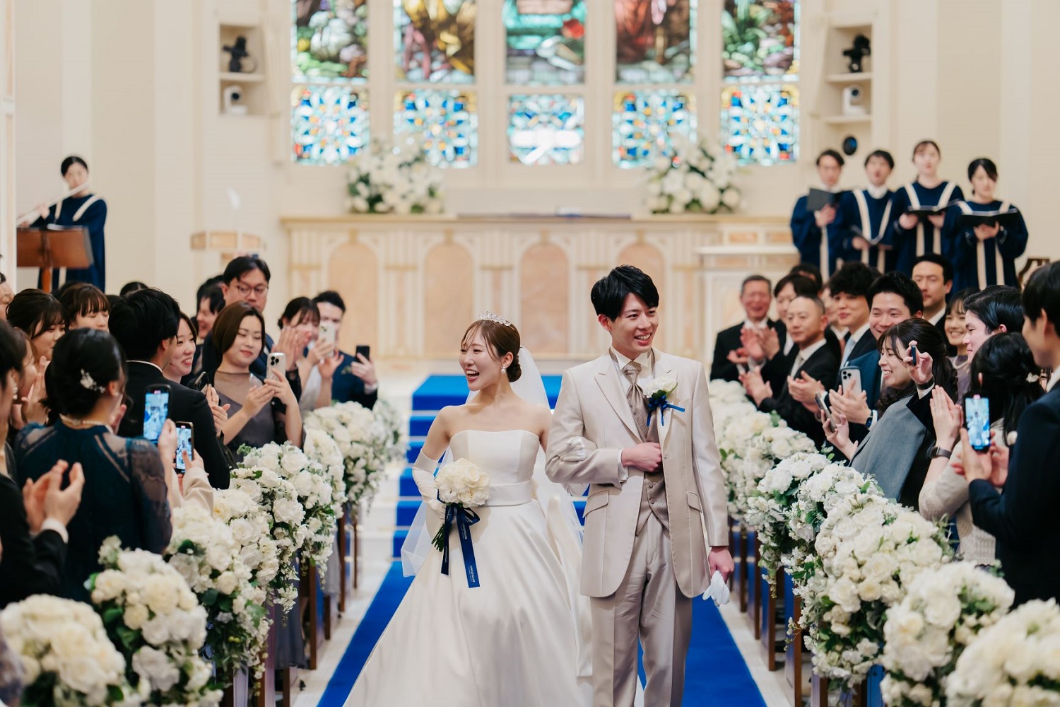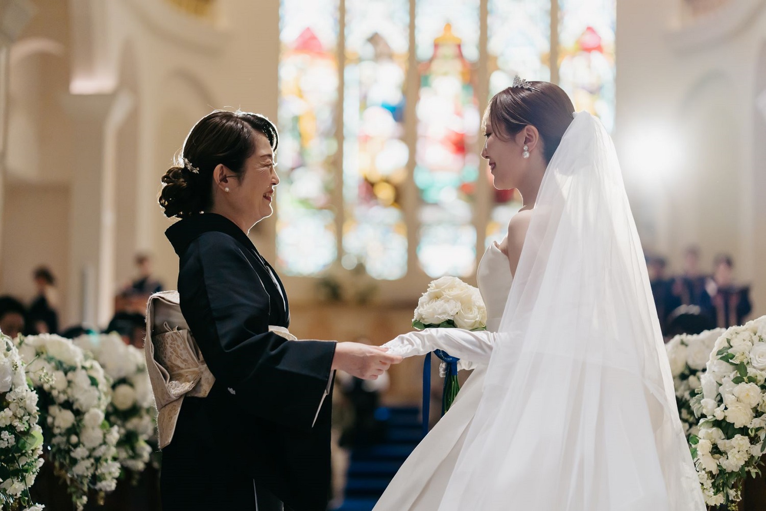 おふたりが選ばれたのは、美しいステンドグラスが輝く大聖堂チャペル。チャペルの雰囲気にぴったりのドレスを、心を込めてお選びいただきました。挙式では、親御様が新郎様の背中をそっと押すような「ジャケットセレモニー」や、手書きの文字で綴られたご新婦様の想いが込められたオリジナルのチャペルムービーの上映、ご新婦様の入場後「子育ての卒業式」としてお母様からのベールダウンが行われ、その温かな想いが感じられるひとときに。また、お母様からおふたりへ、当日まで内容がサプライズだった誓いの言葉が贈られ、愛に包まれた、心に深く残る挙式となりました。