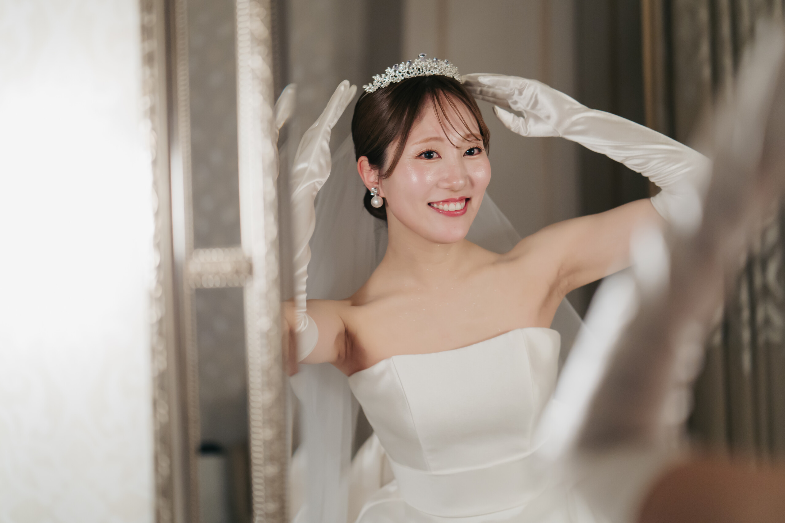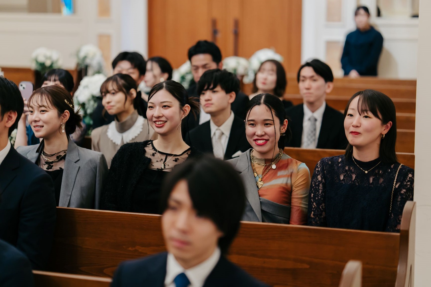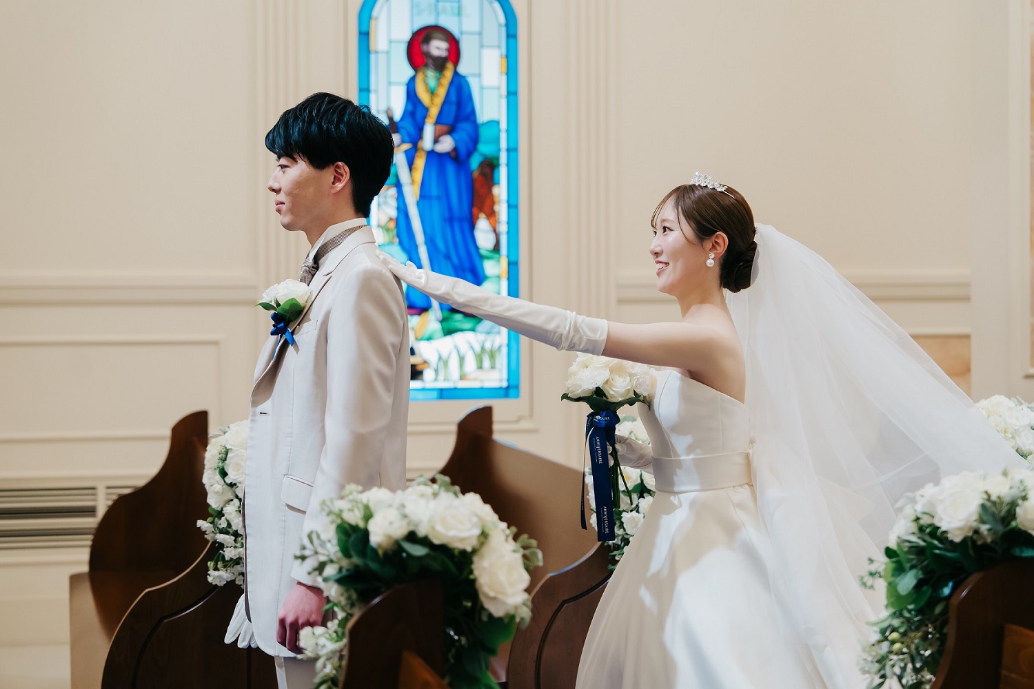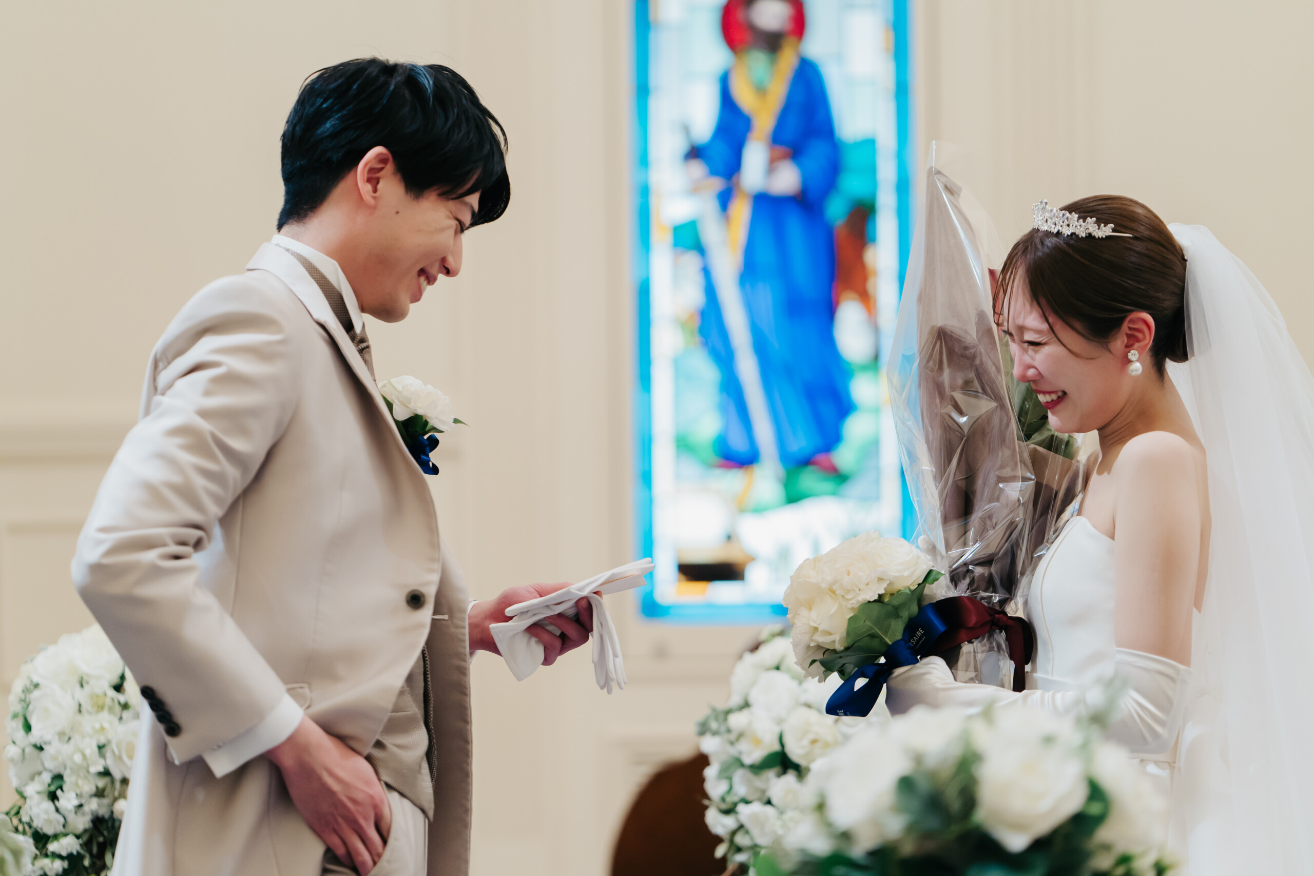 おふたりが選ばれたのは、美しいステンドグラスが輝く大聖堂チャペル。チャペルの雰囲気にぴったりのドレスを、心を込めてお選びいただきました。挙式では、親御様が新郎様の背中をそっと押すような「ジャケットセレモニー」や、手書きの文字で綴られたご新婦様の想いが込められたオリジナルのチャペルムービーの上映、ご新婦様の入場後「子育ての卒業式」としてお母様からのベールダウンが行われ、その温かな想いが感じられるひとときに。また、お母様からおふたりへ、当日まで内容がサプライズだった誓いの言葉が贈られ、愛に包まれた、心に深く残る挙式となりました。
