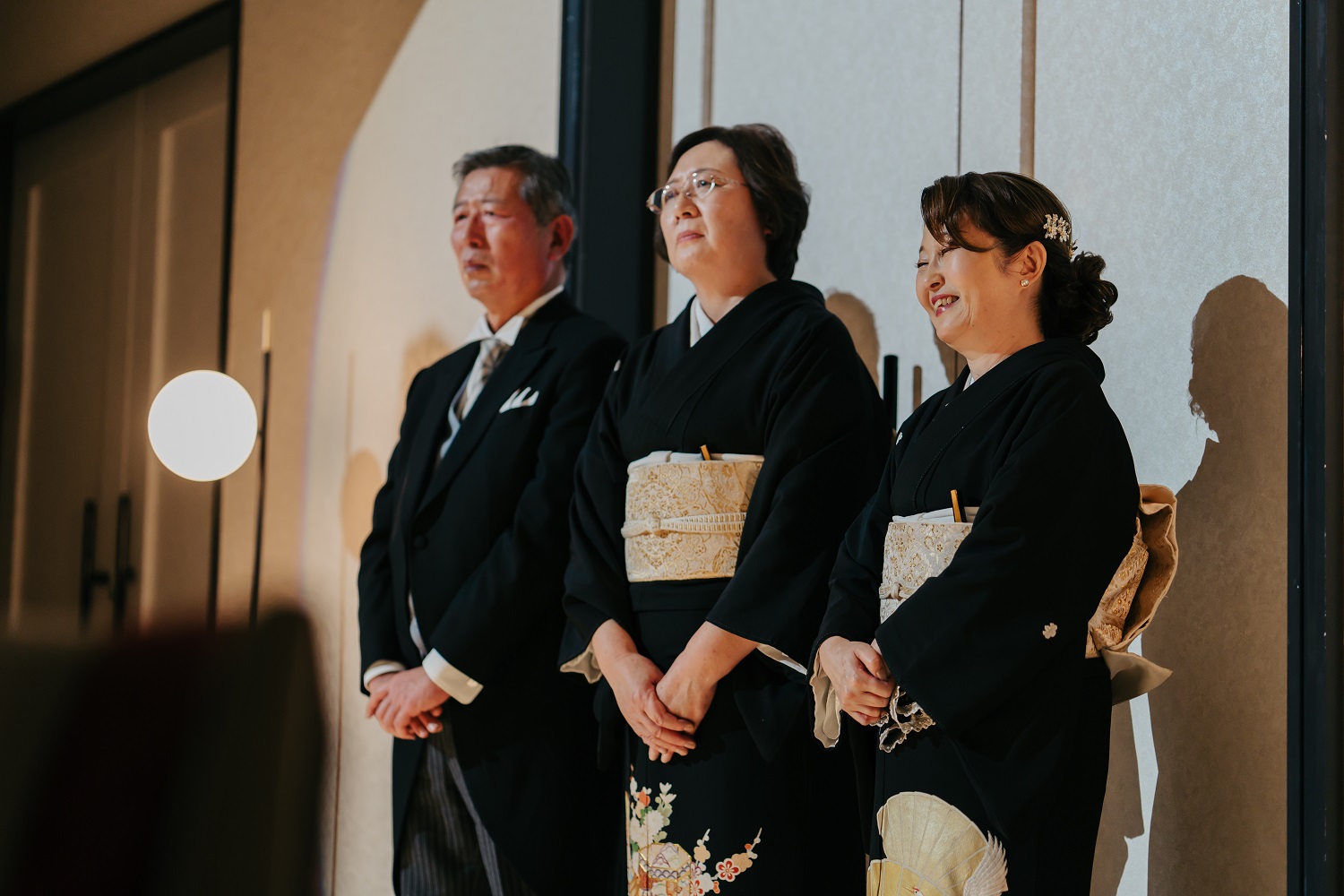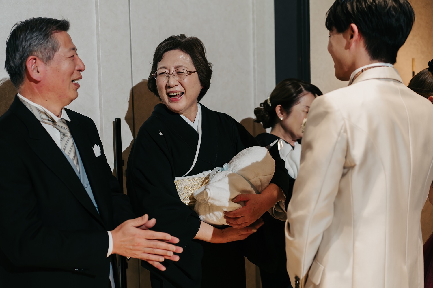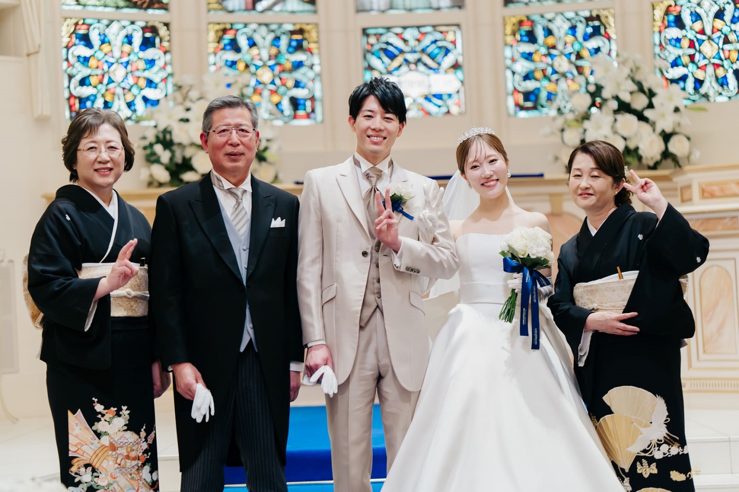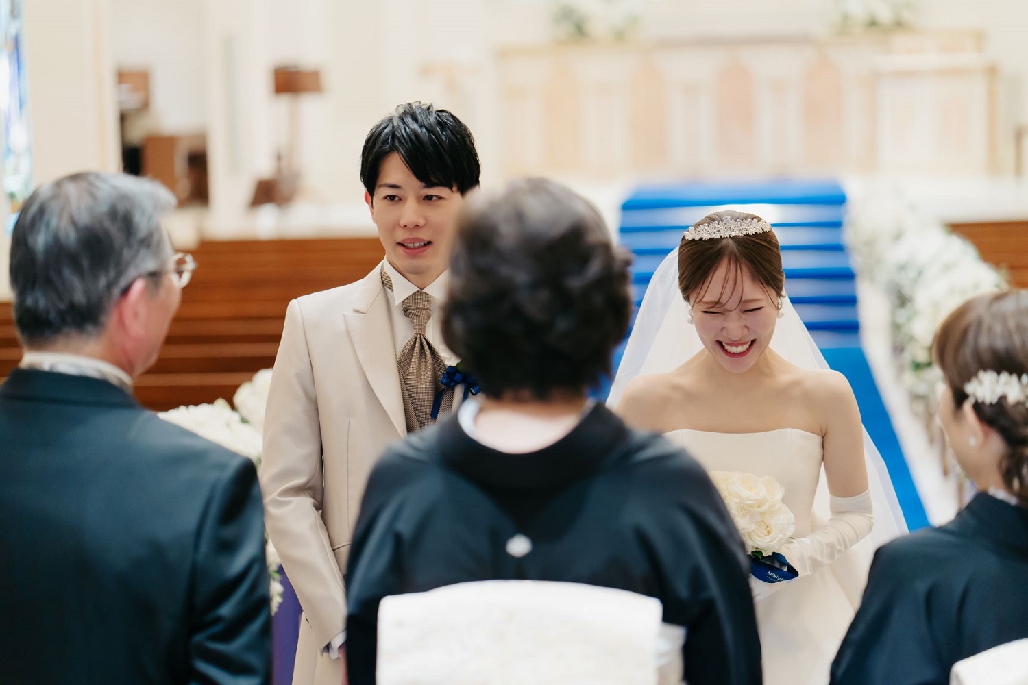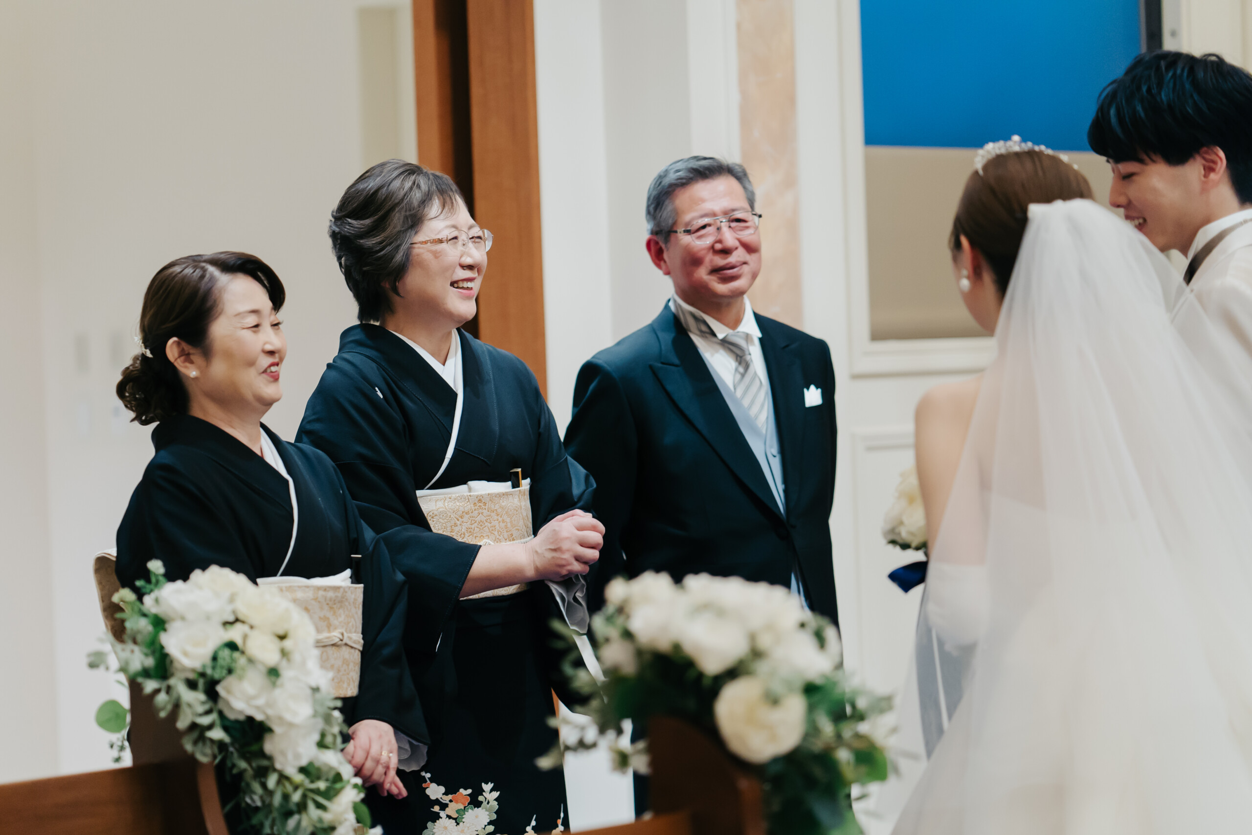 お支度が整うと、ファーストミートから特別な一日が始まります。チャペルでのふたりだけのひとときに、新郎様が新婦様へ心を込めてサプライズのお手紙を贈られました。喜びの笑顔と涙であふれる想いが伝わります。晴れ姿を最初に披露するのは、この日を心待ちにしていた親御様。ご家族皆様の温かな笑顔は、これまでの歩みを物語っているかのようで、心温まるファミリーミートとなりました。