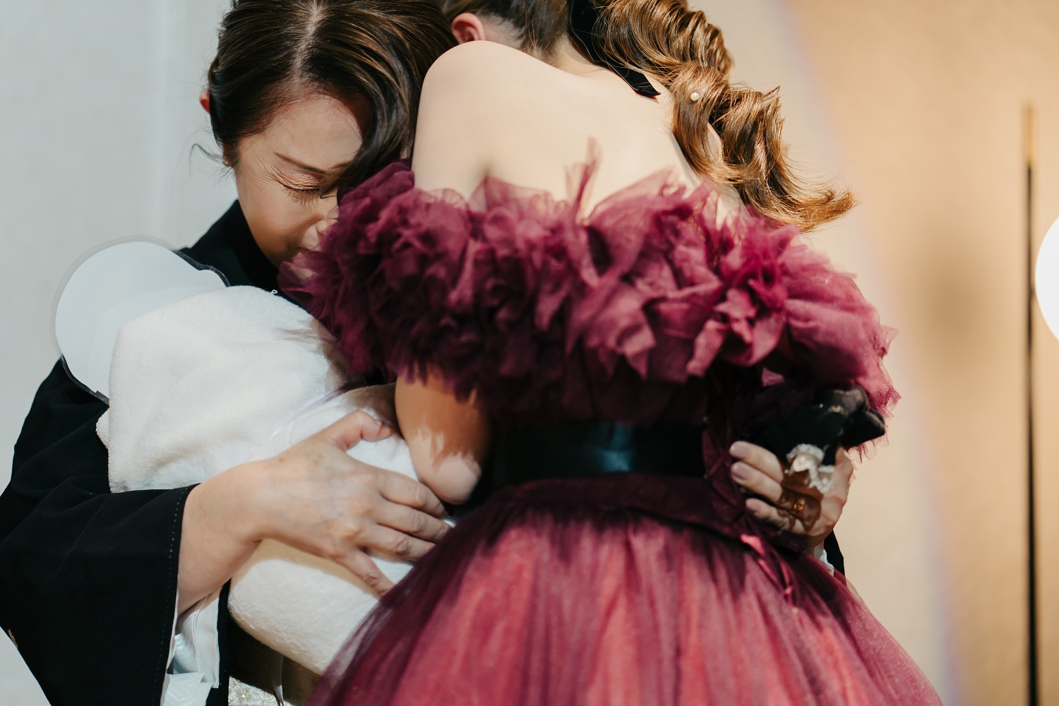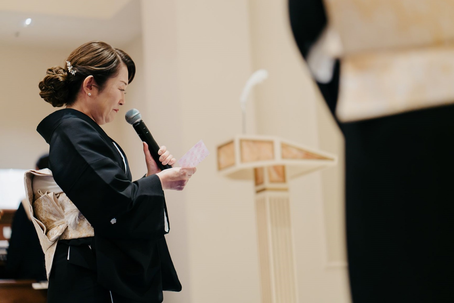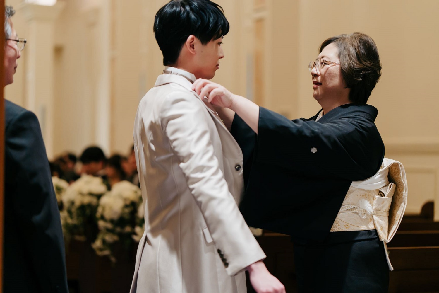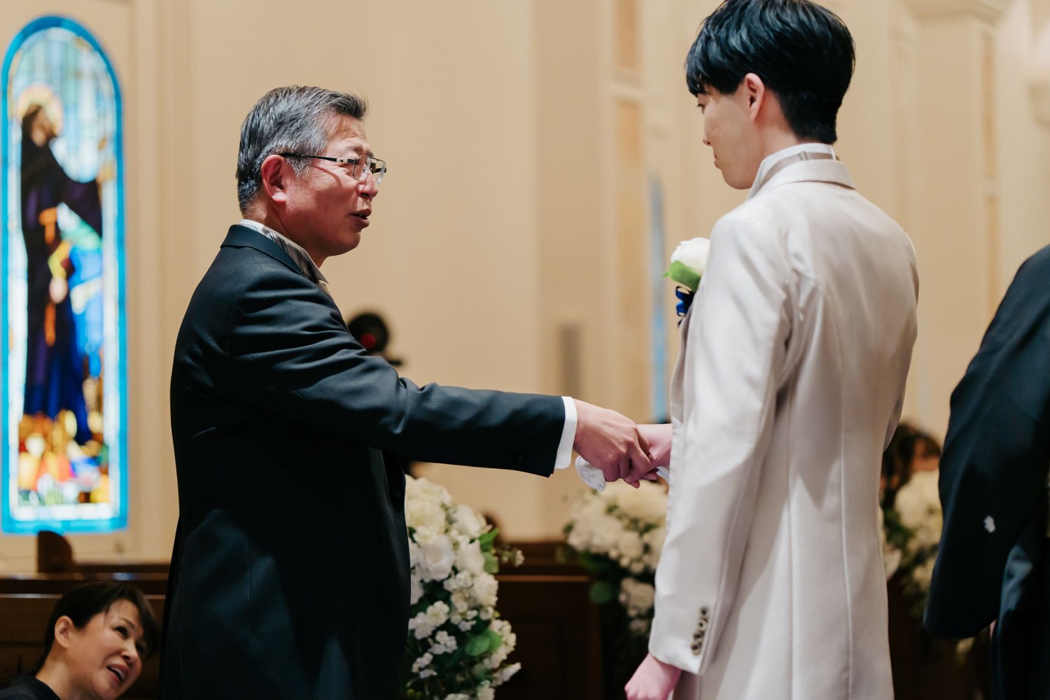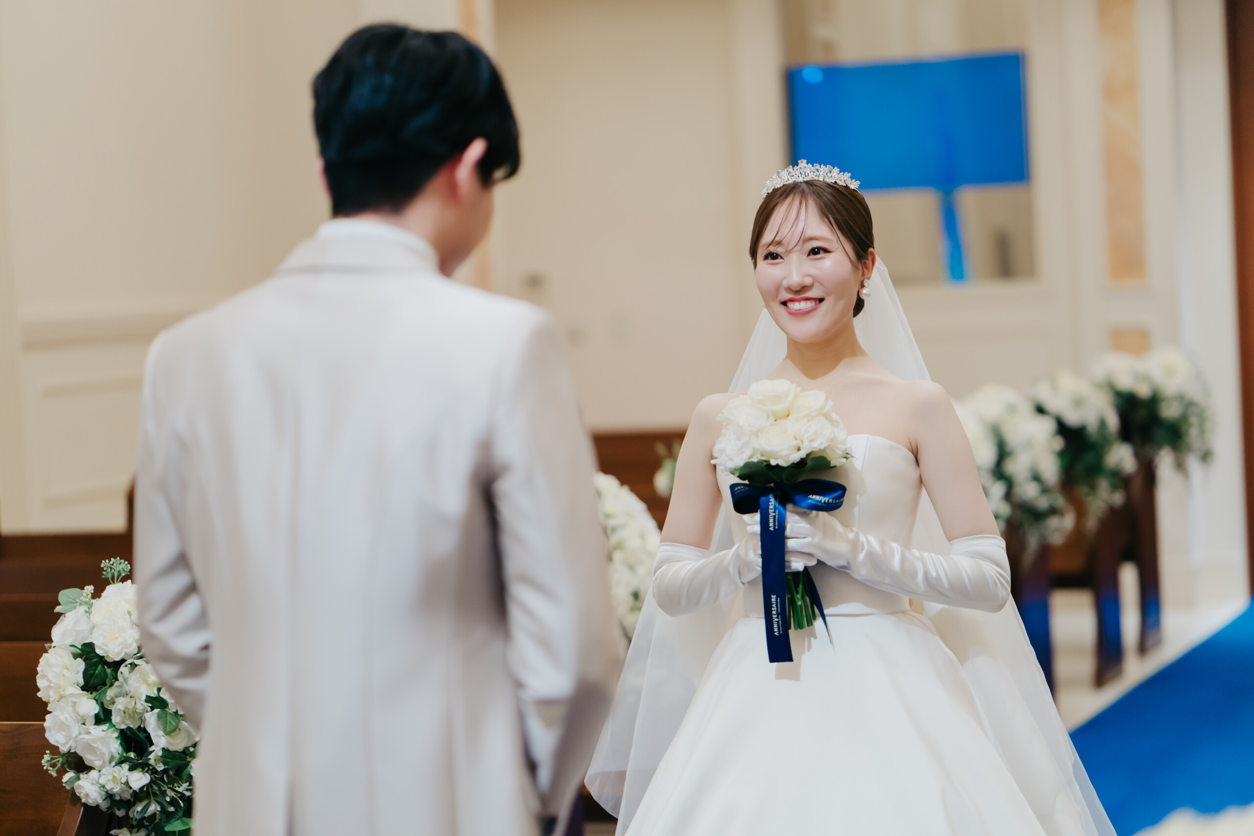 お支度が整うと、ファーストミートから特別な一日が始まります。チャペルでのふたりだけのひとときに、新郎様が新婦様へ心を込めてサプライズのお手紙を贈られました。喜びの笑顔と涙であふれる想いが伝わります。晴れ姿を最初に披露するのは、この日を心待ちにしていた親御様。ご家族皆様の温かな笑顔は、これまでの歩みを物語っているかのようで、心温まるファミリーミートとなりました。