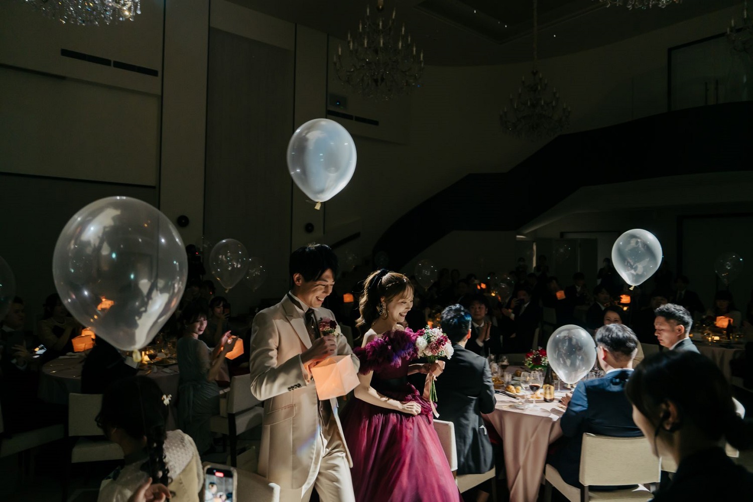お色直し後のご登場は、ご新婦様の憧れであった階段からの入場。さらに、おふたりが思い入れのある映画をイメージしたバルーンランタンの演出は、ゲストと一緒につくりあげたロマンティックなシーンとなりました。受付からご用意いただいていたおふたりの幼少期の写真当てクイズはゲスト参加型で行われ、大盛り上がり。さらに、ゲストへのサプライズとしてデザートビュッフェもご用意され、皆様と一緒にたくさんのお写真を撮ることができる嬉しい時間となりました。結びには、ご新婦様からお母様へ向けて、これまでの感謝の気持ちを込めたお手紙が贈られ親子の絆を感じる感動的なシーンに。大切なゲストと過ごした一日は、おふたりらしさがたくさん詰まった温かくてアットホームな時間となりました。