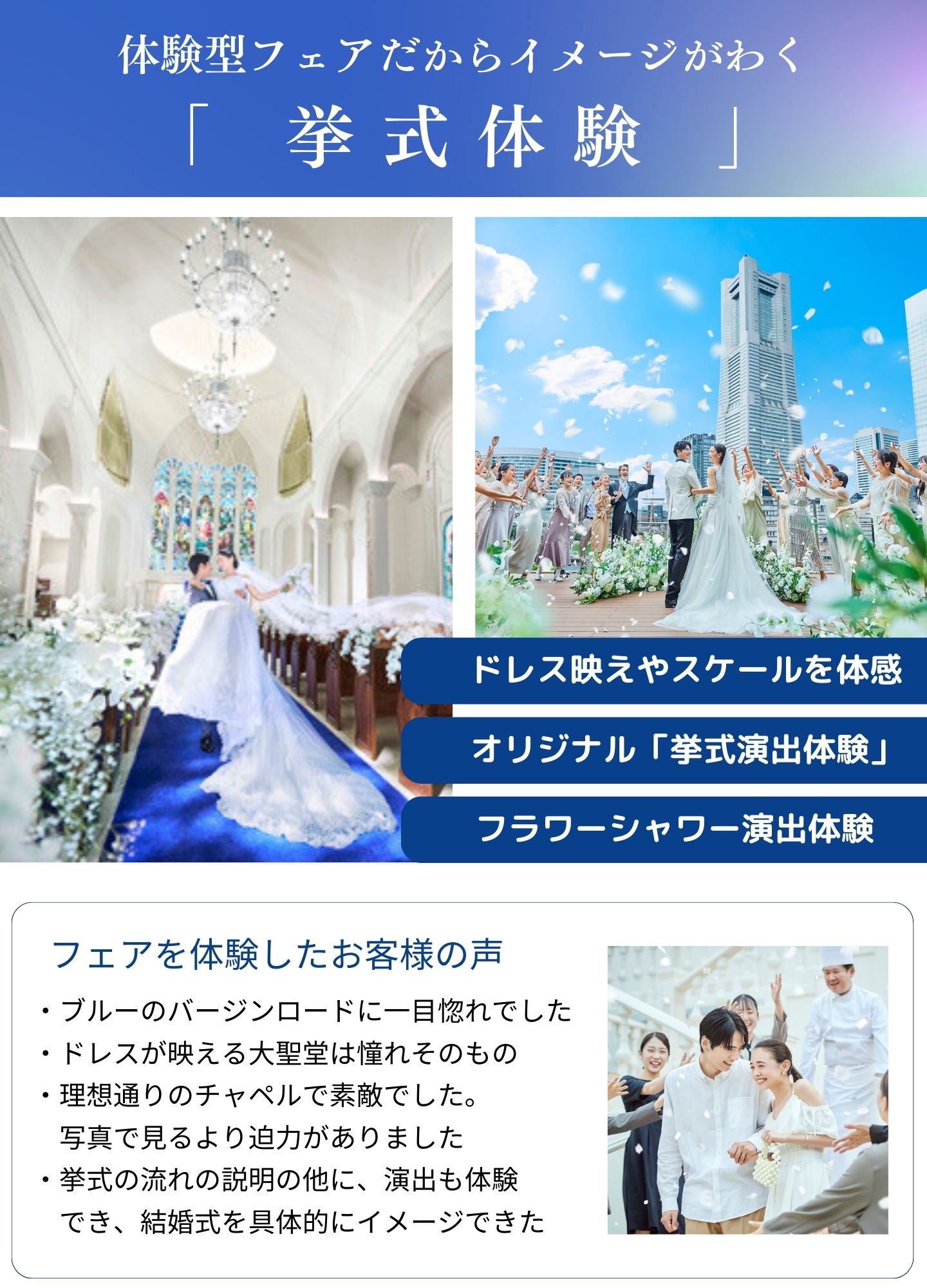 詳しい詳細や実際のチャペル・会場をご覧になることで、おふたりのご希望が明確になる方が多いので、迷われている場合はぜひフェアにご参加くださいませ。