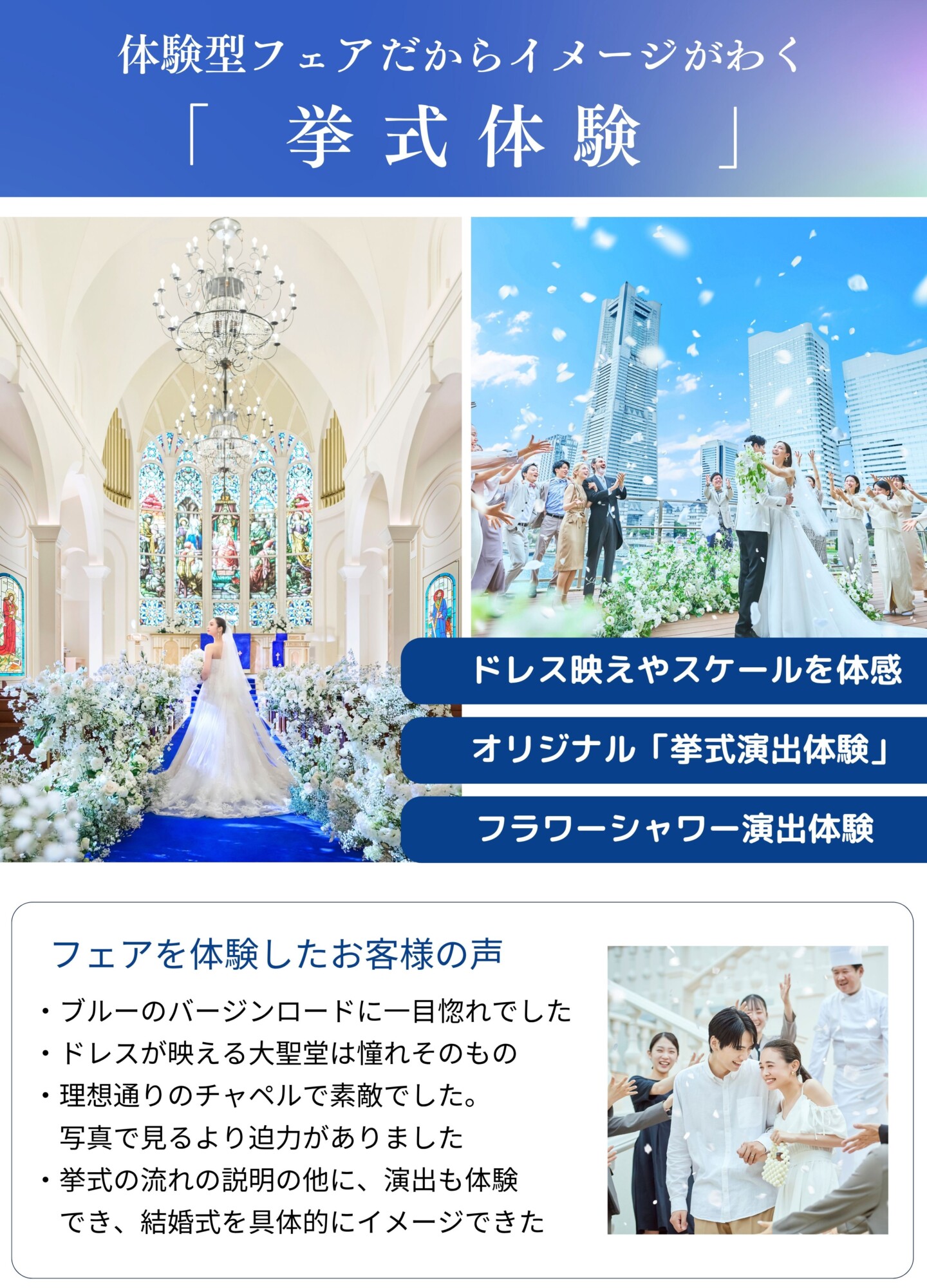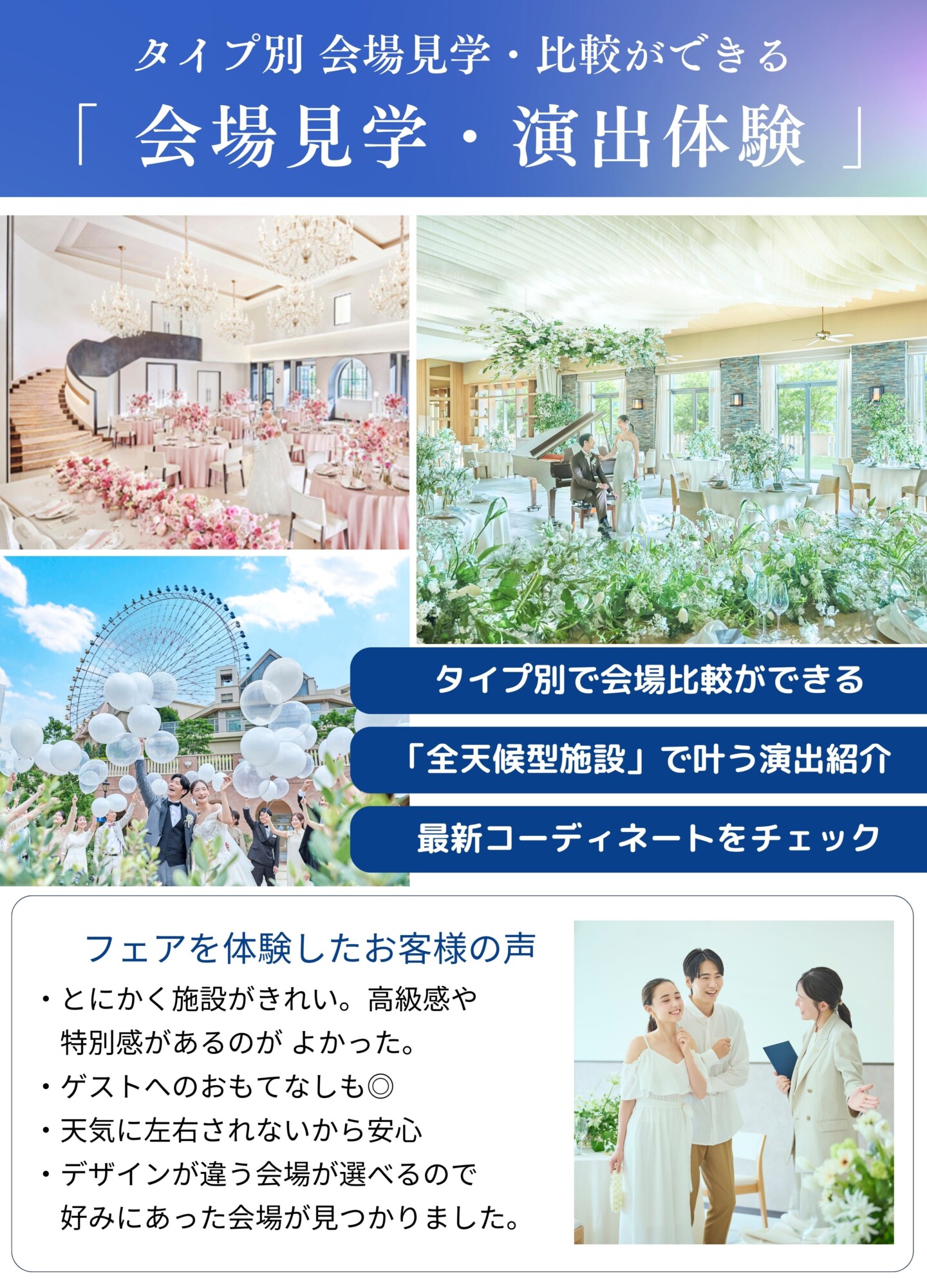 詳しい詳細や実際のチャペル・会場をご覧になることで、おふたりのご希望が明確になる方が多いので、迷われている場合はぜひフェアにご参加くださいませ。