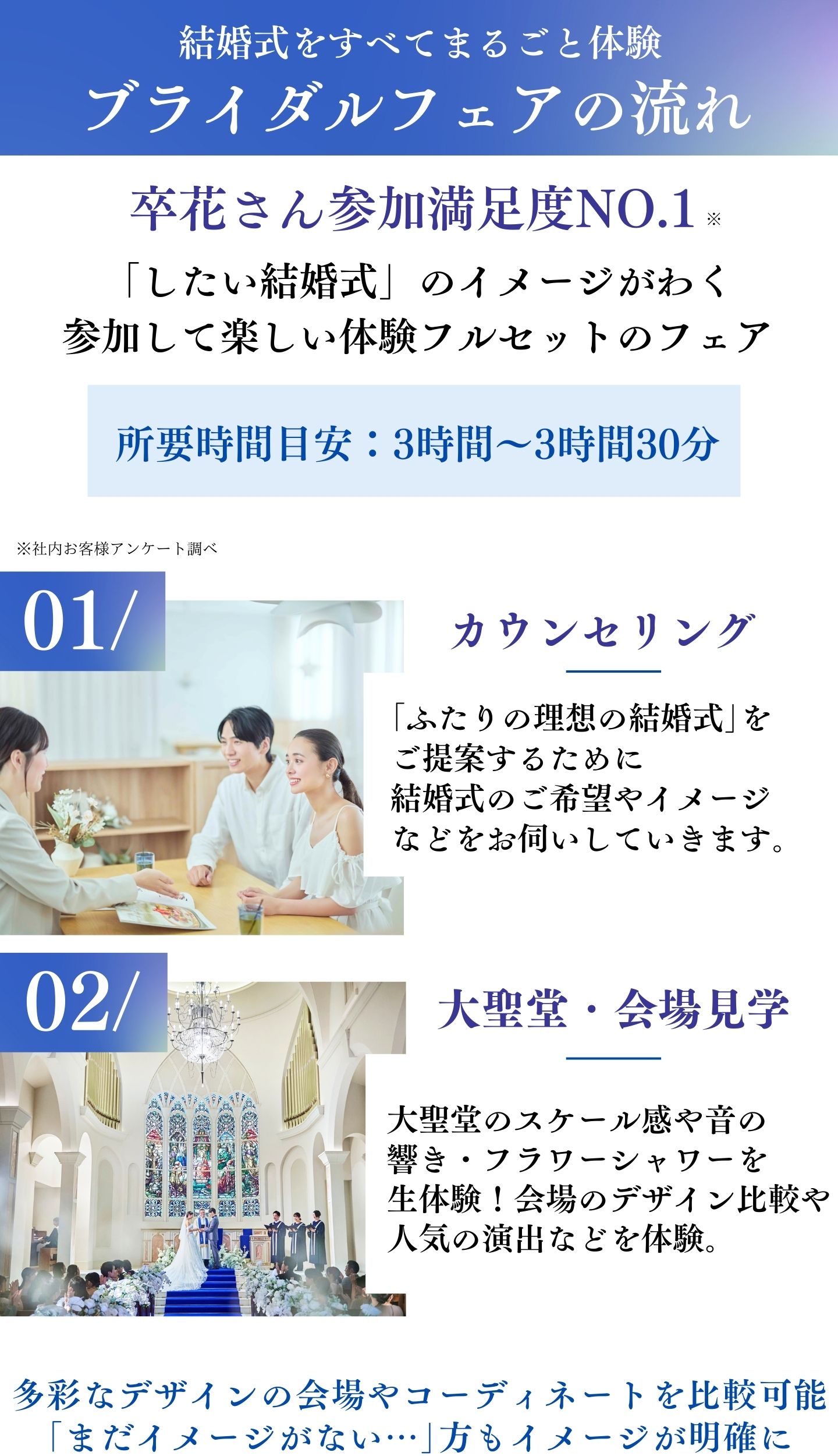 詳しい詳細や実際のチャペル・会場をご覧になることで、おふたりのご希望が明確になる方が多いので、迷われている場合はぜひフェアにご参加くださいませ。