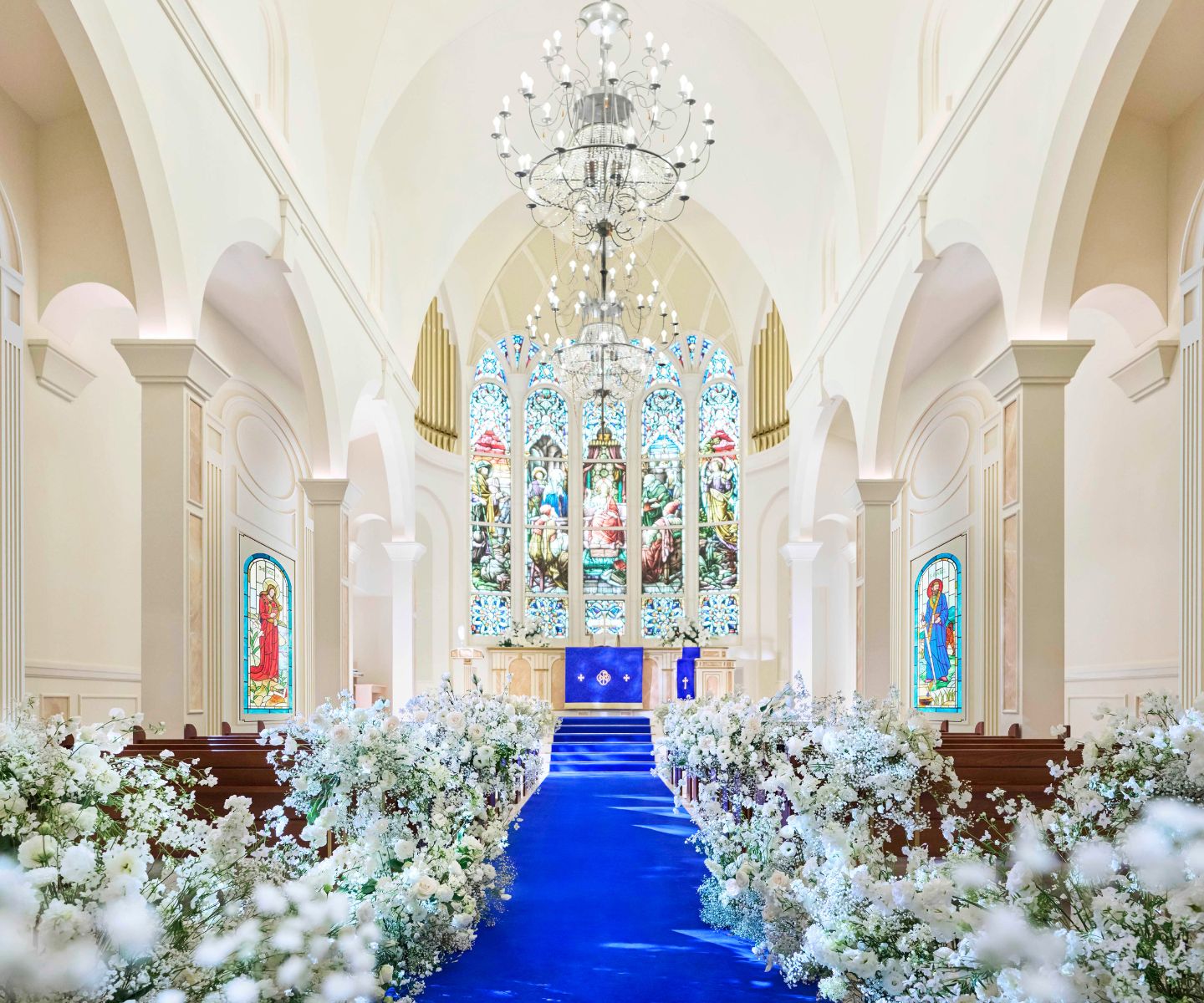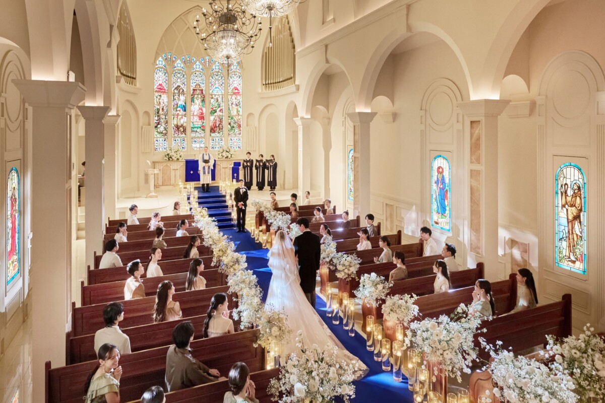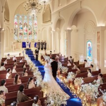 ドレスが美しく映えるブルーのバージンロード