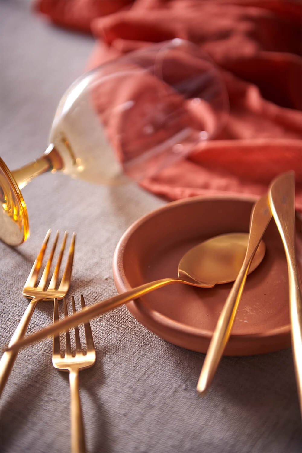 テラコッタなど赤茶色のさまざまなニュアンスがベースの、 まるで夏の夕陽のような色合いのコーディネート。