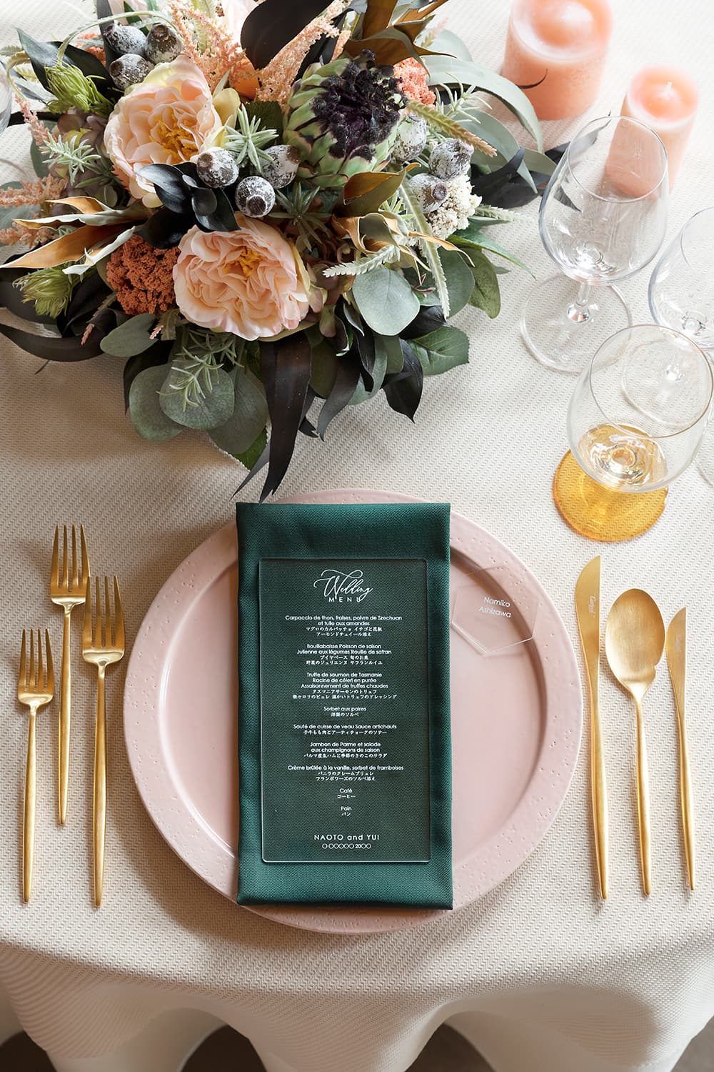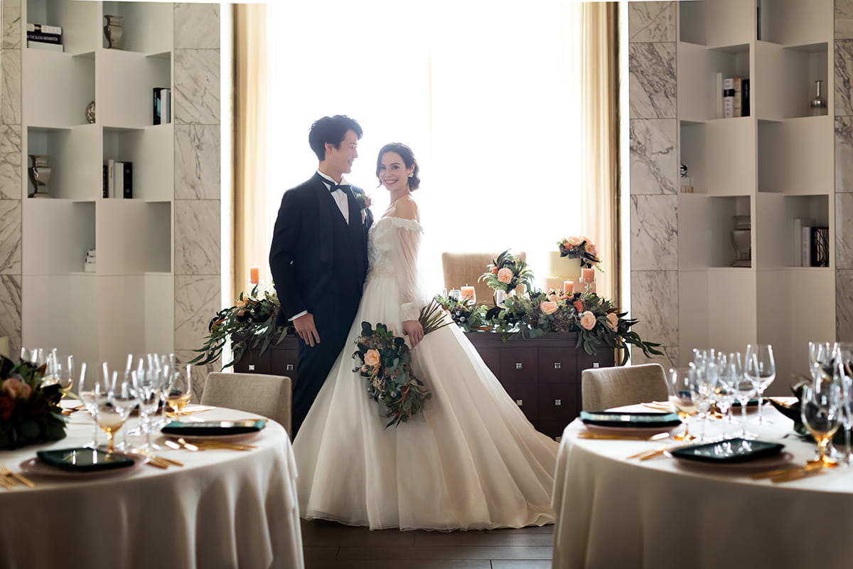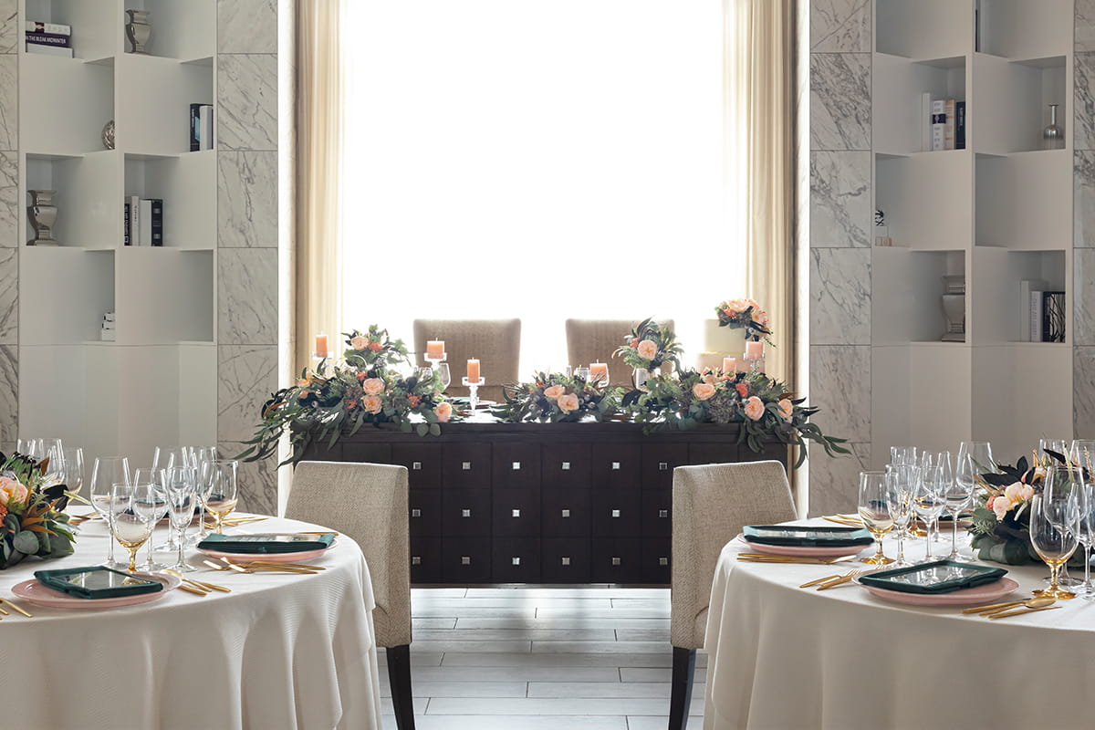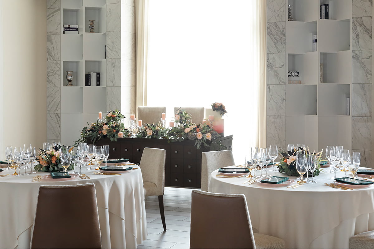「ビブリオ」は優しいメロウな色調のスタイリング。 「本」を意味するラテン語で、これから始まるおふたりの物語を紡ぐ、祝福の空間を演出します。