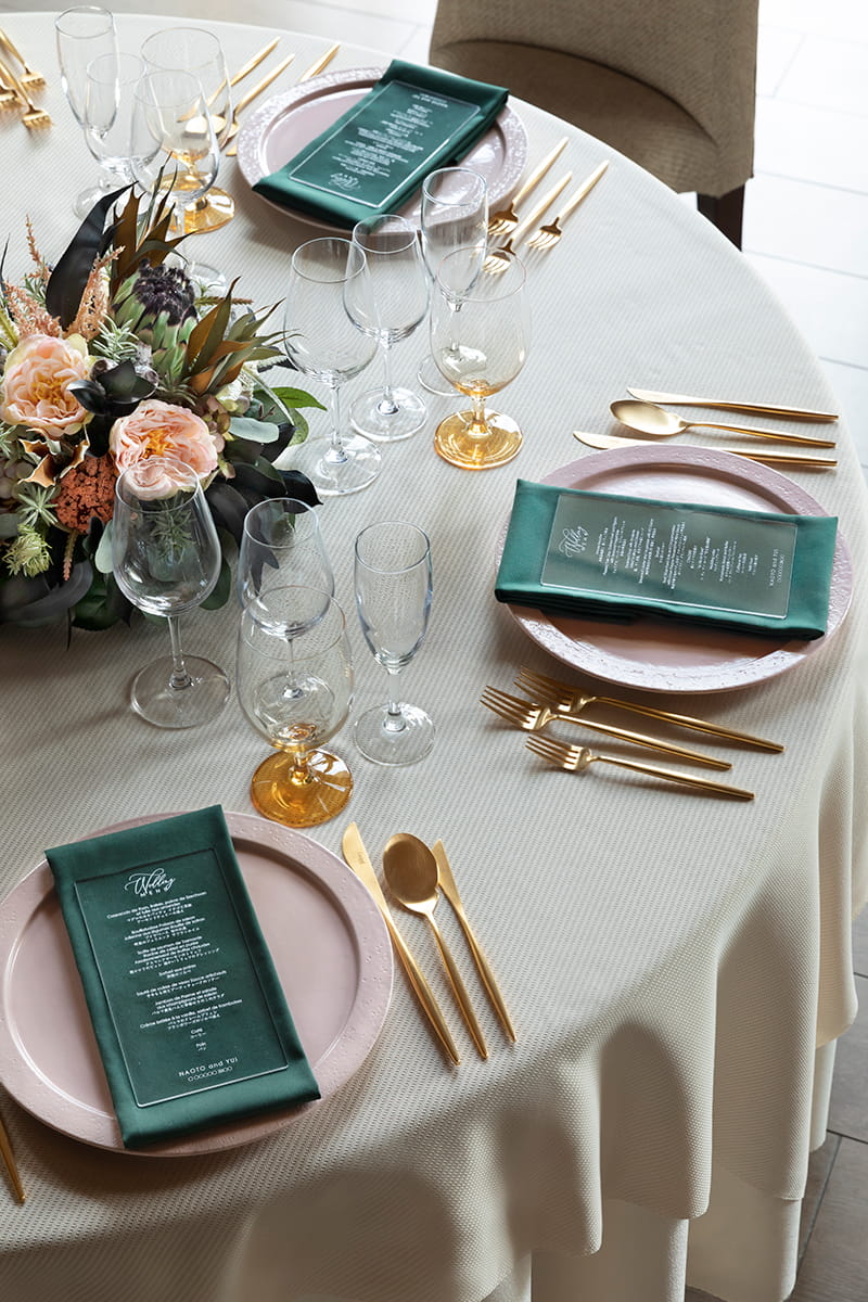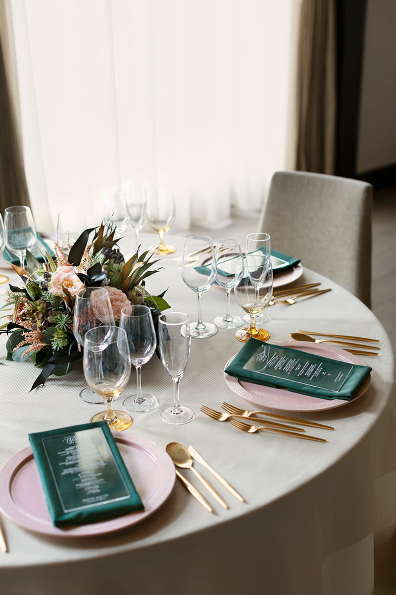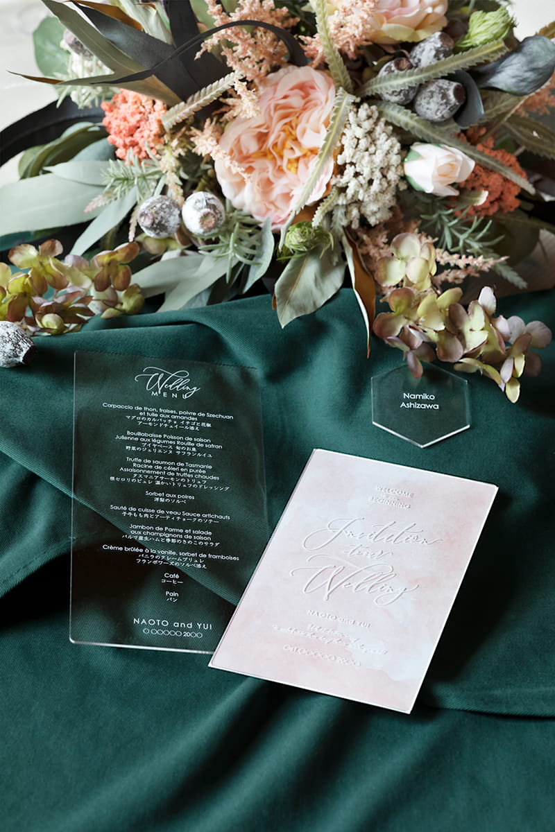 セージグリーンとグレーを基調にした「エバー・グリーン」。 “いつまでも色褪せない”という想いを込め、 おふたりの変わらない愛を表現します。