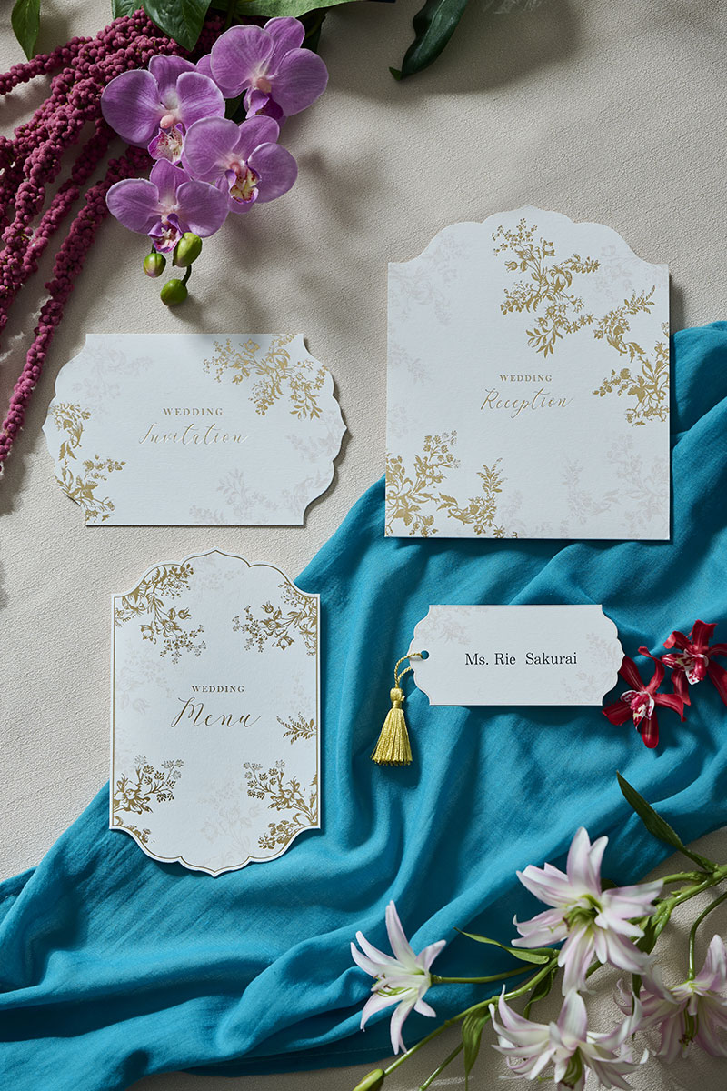 「カメリア」の花言葉“至上の愛らしさ”をイメージした冬の コレクション。シックで上品な白を基調に、可憐な華やかさで おふたりをやさしく演出します。