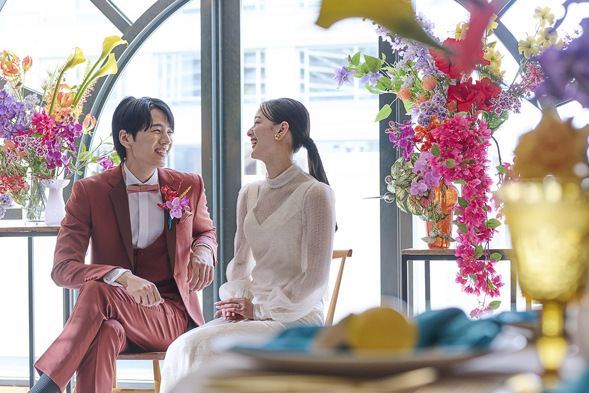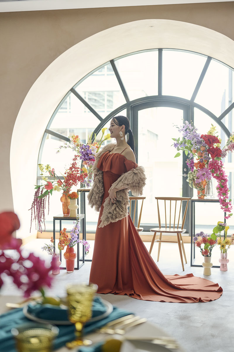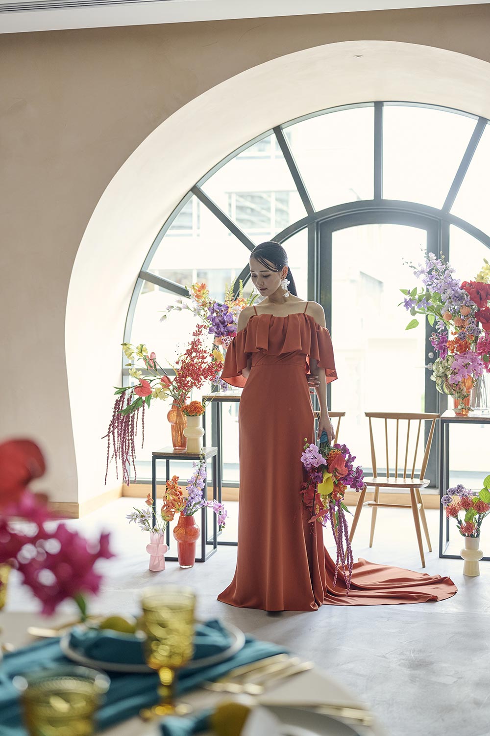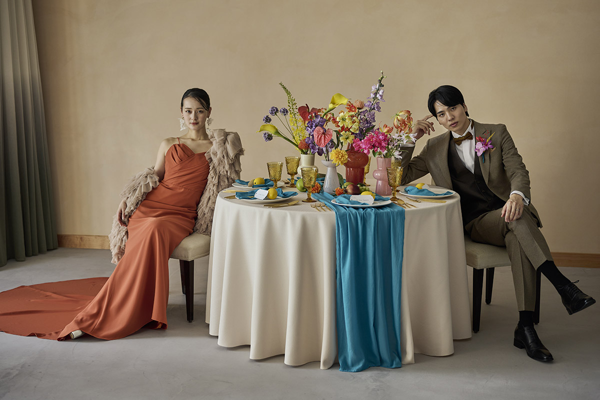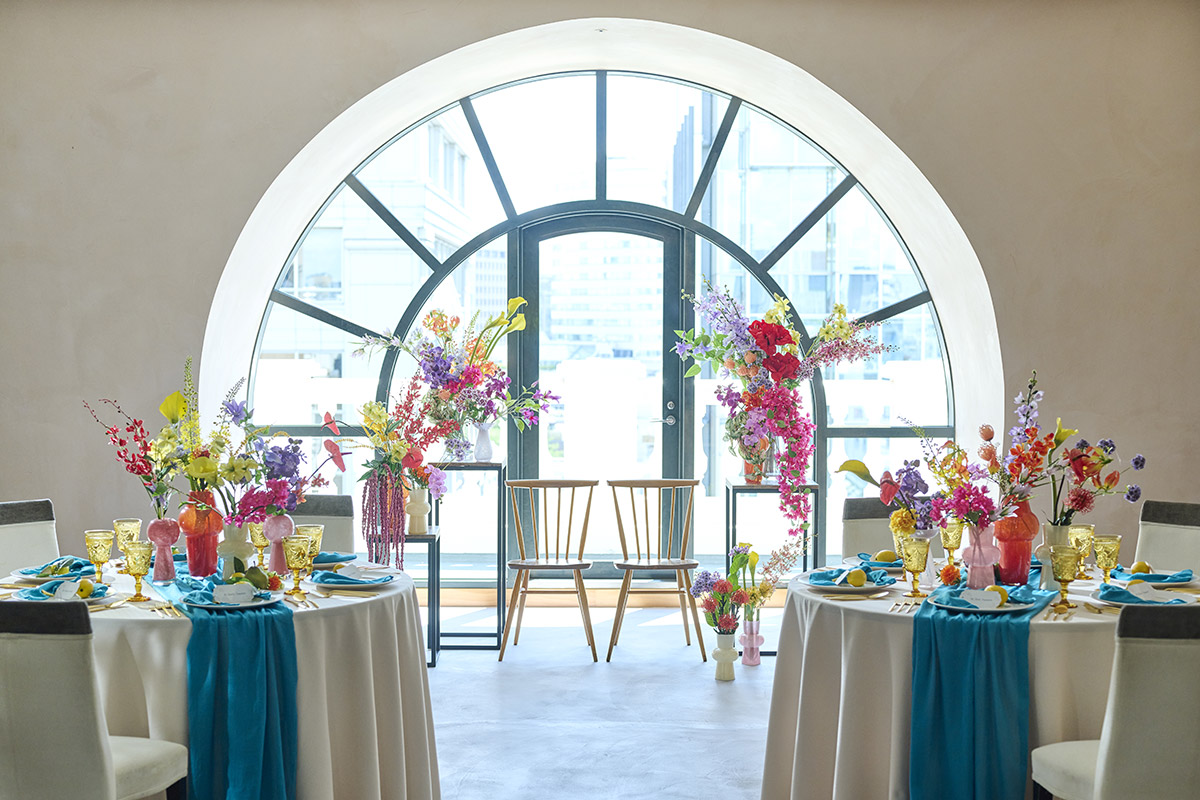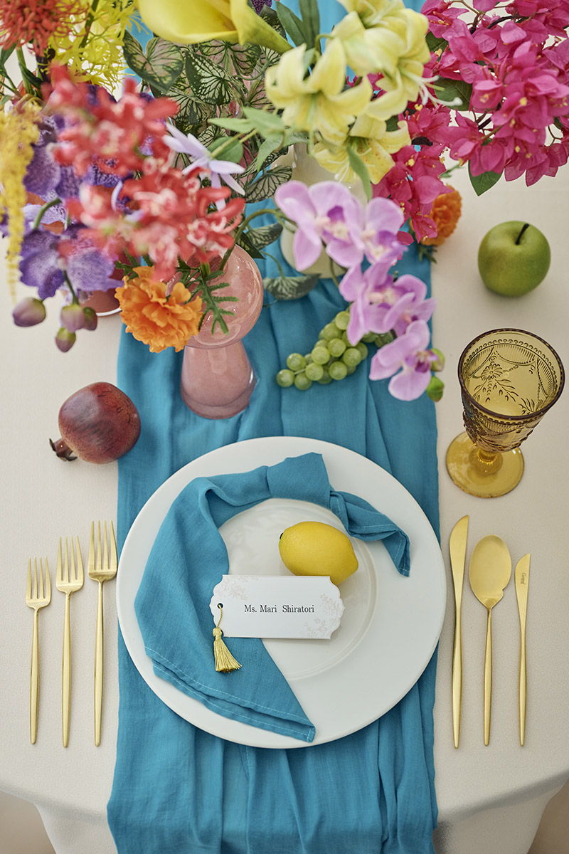 ぱっと目を引く鮮やかなターコイズブルーとカラフルで華やかな装飾で、ジューシーさも感じられる洗練されたおしゃれな空間に。 装飾の重厚感とは対照的な抜け感のあるドレスや小物で独創的な空間にスタイリング。