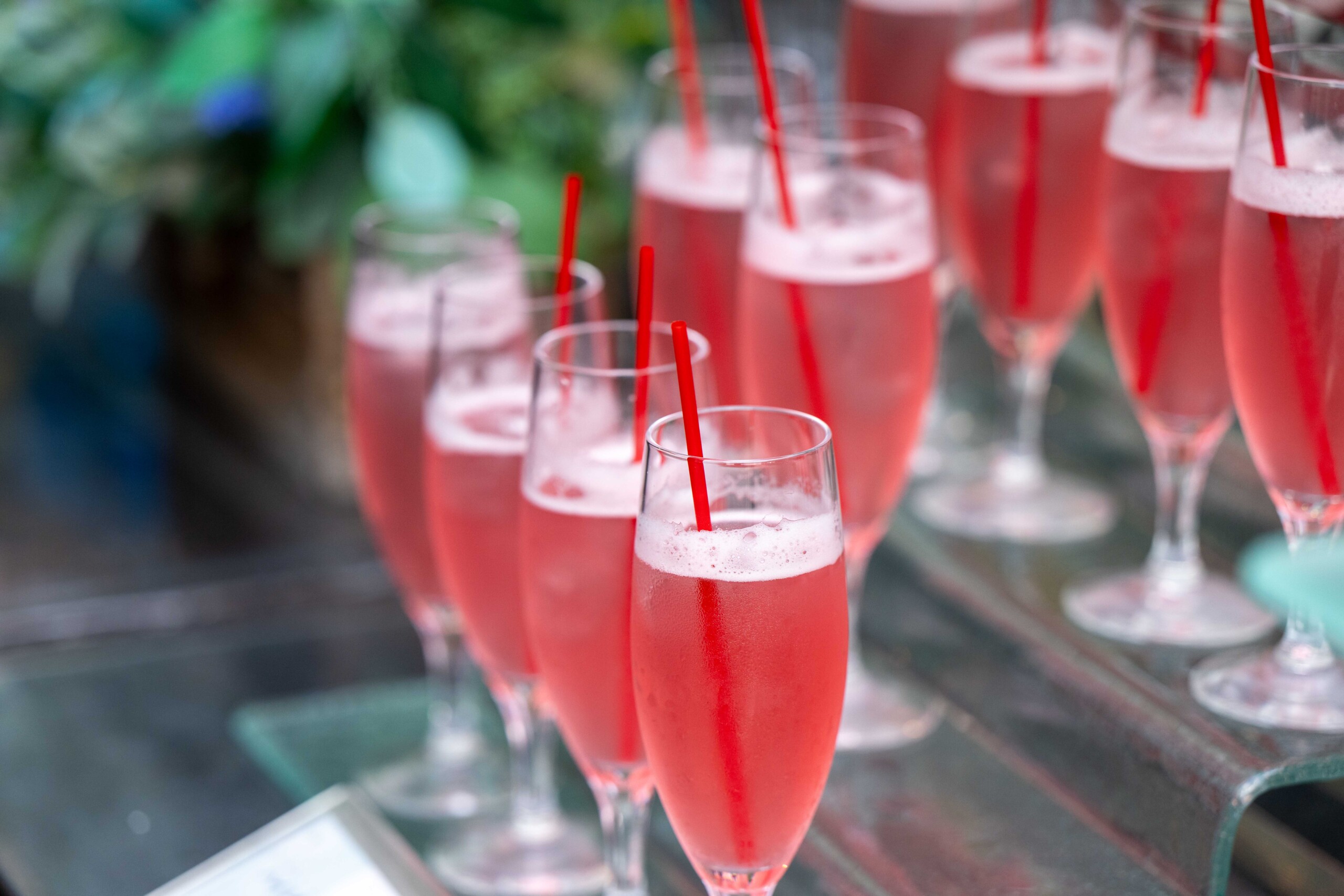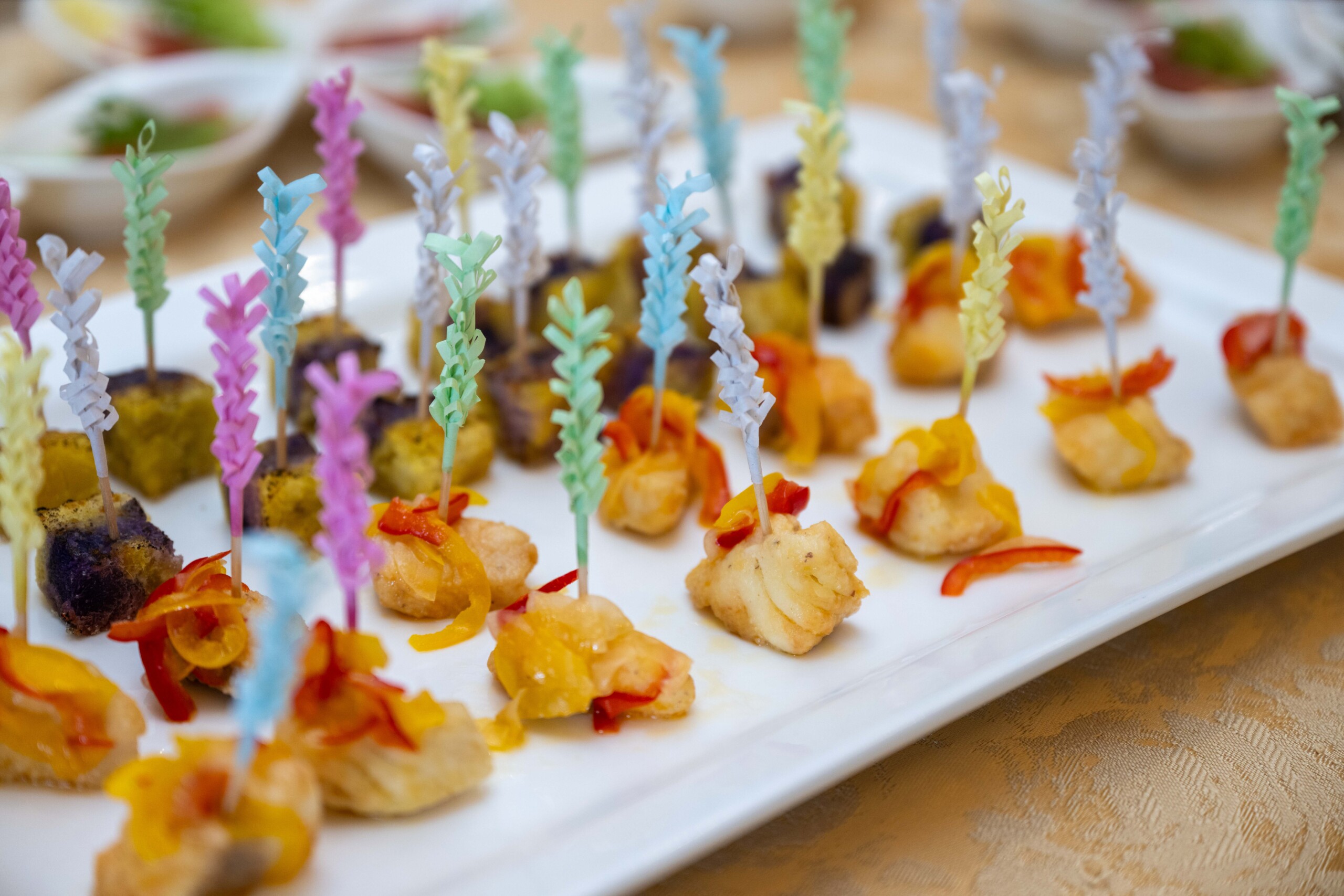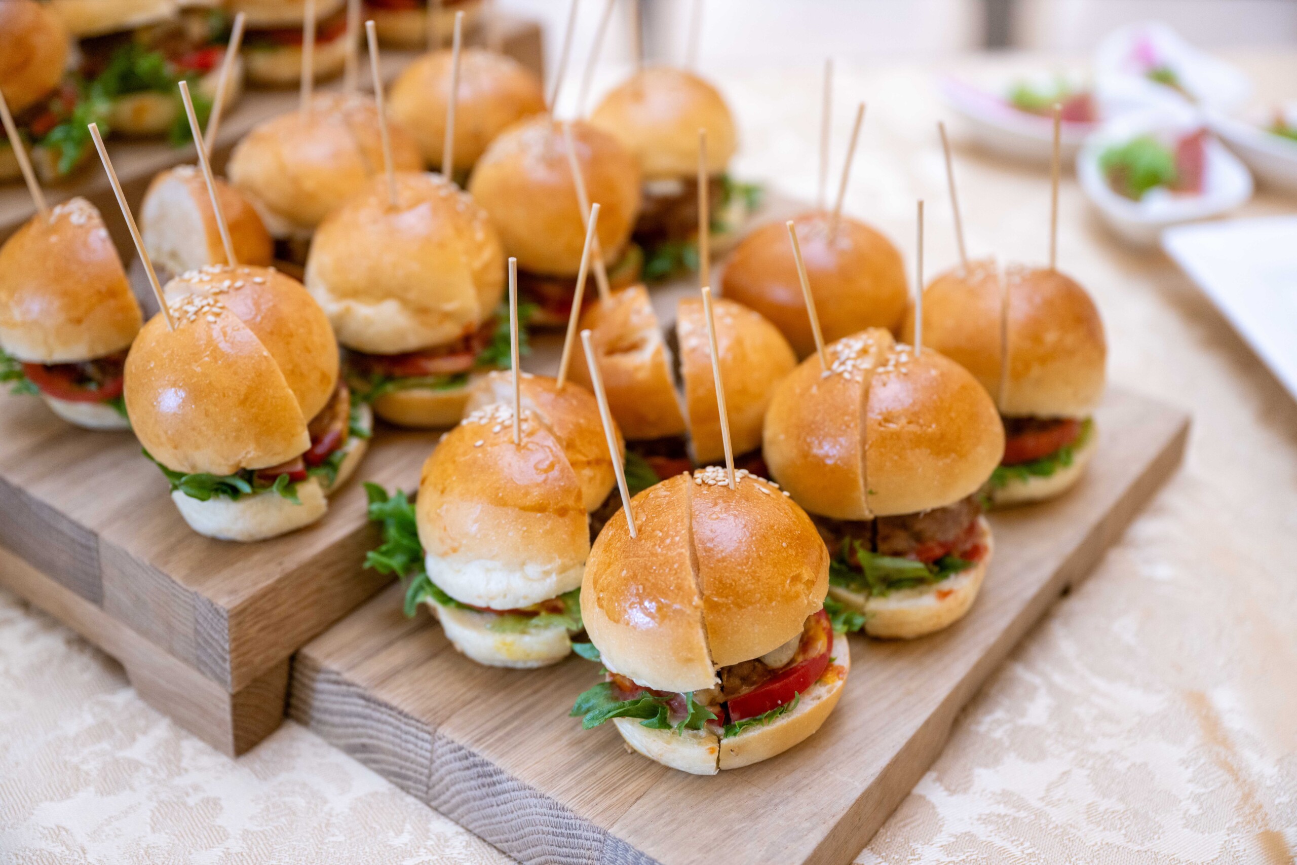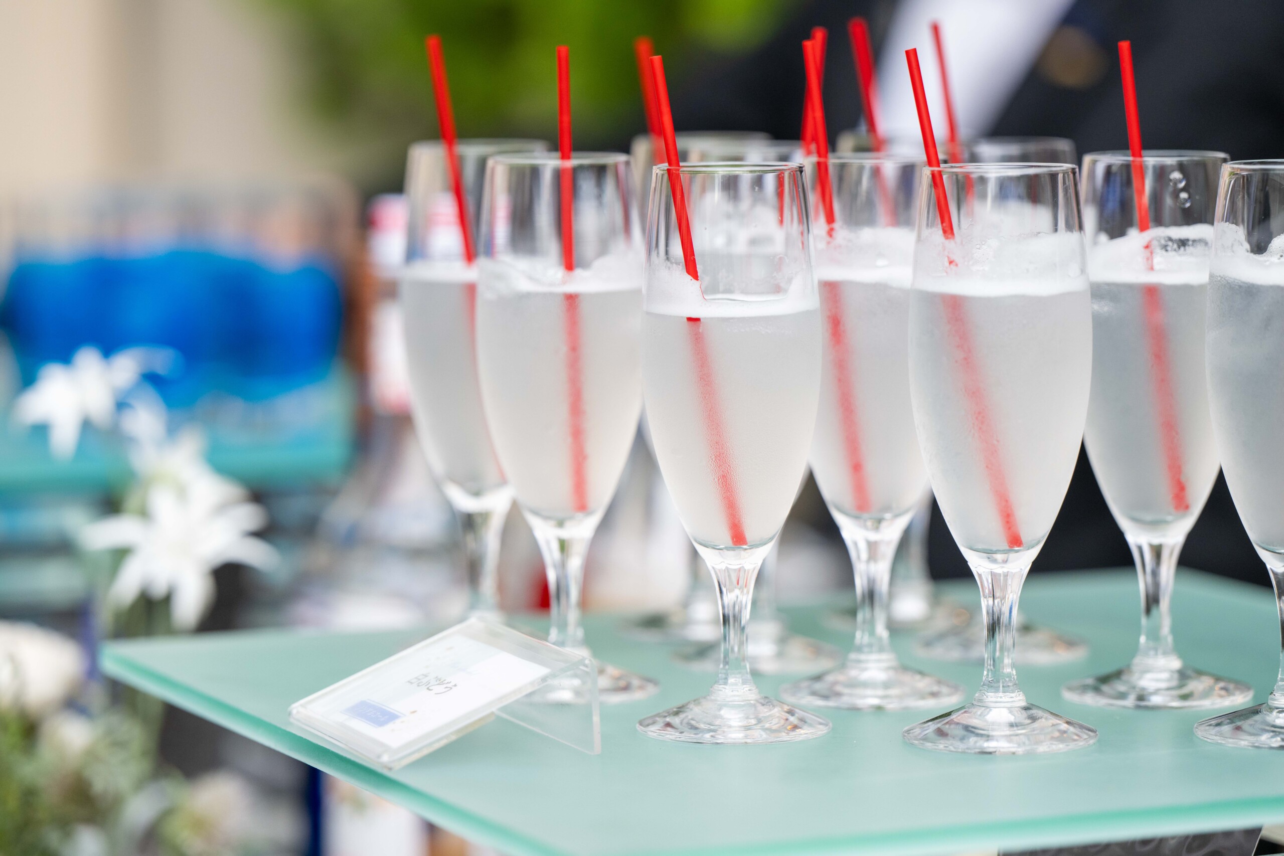 披露宴前のウェルカムパーティでは 大人から子供までゲスト全員が楽しめるような”食”のおもてなし ハンバーガーや生ハムなど色鮮やかなオリジナルカクテルと合わせて乾杯♪