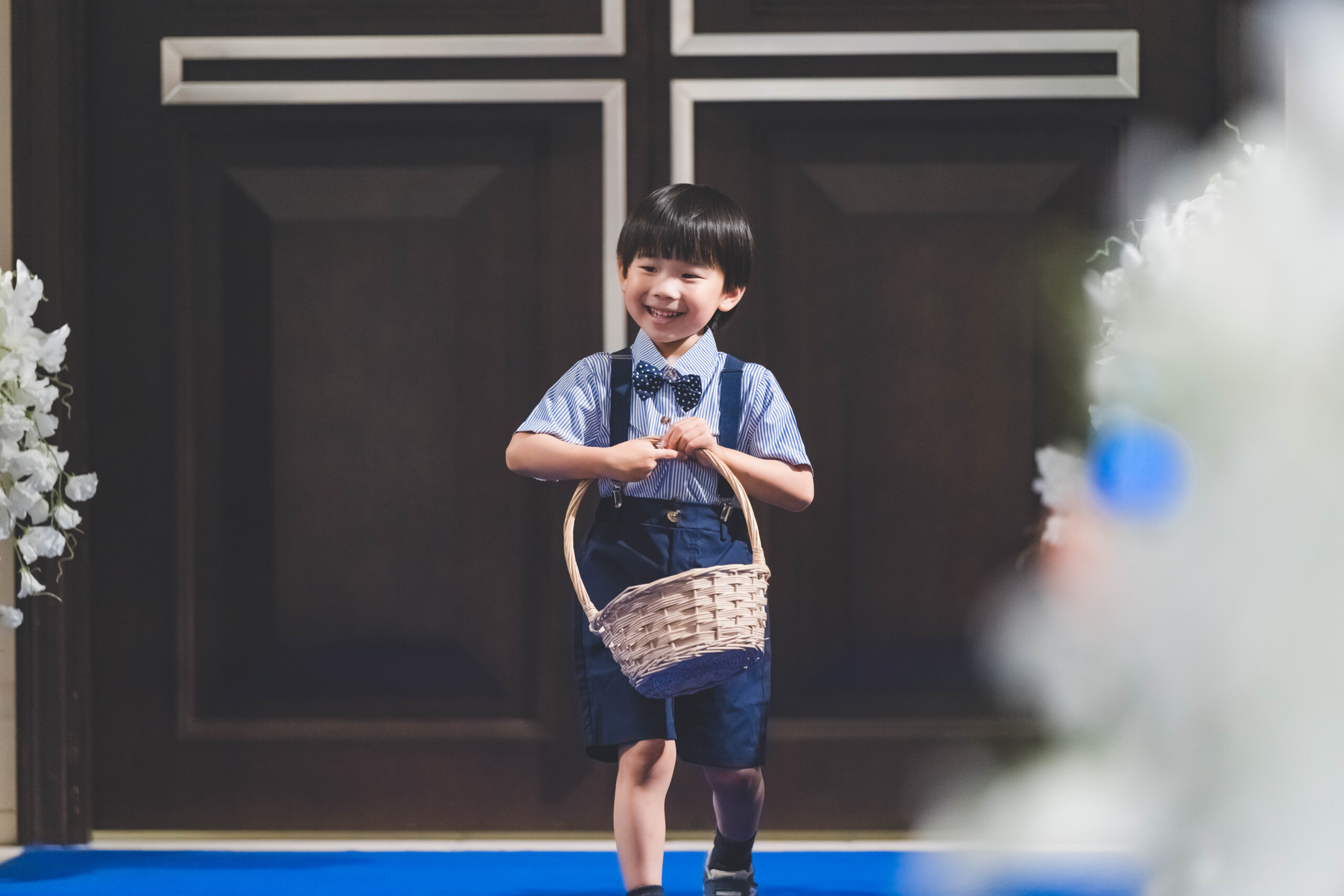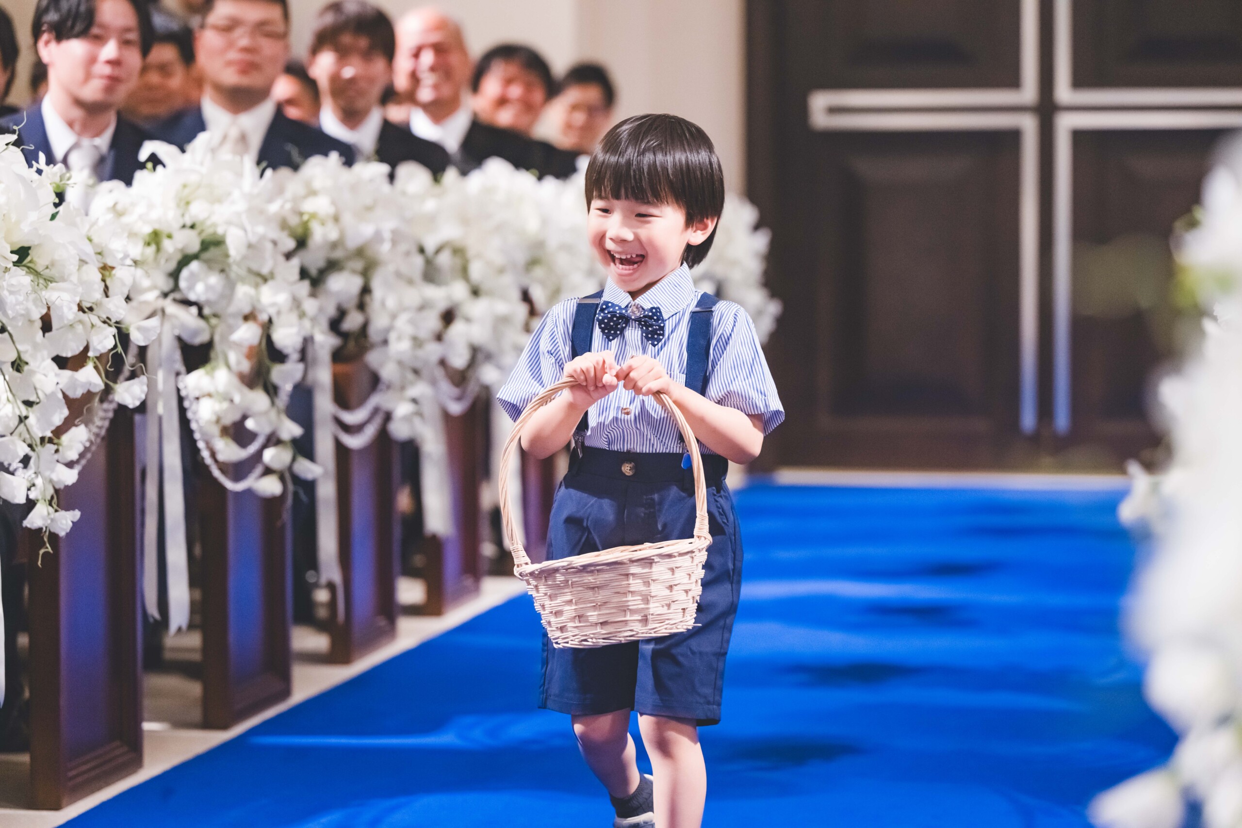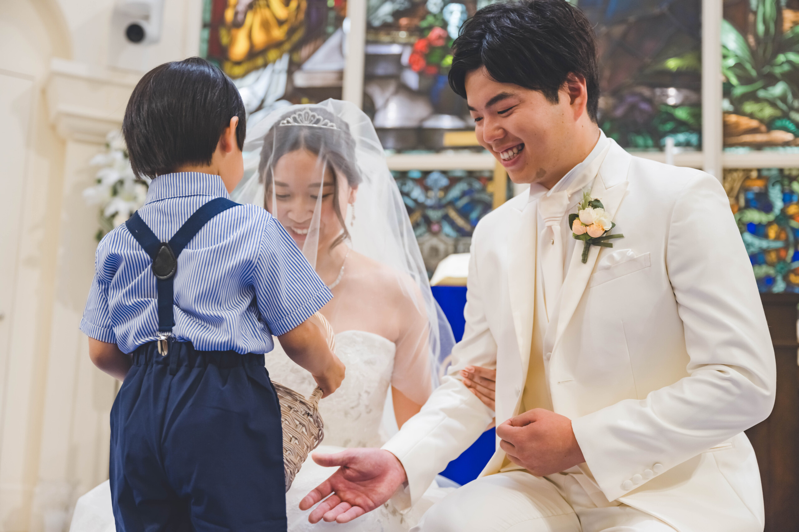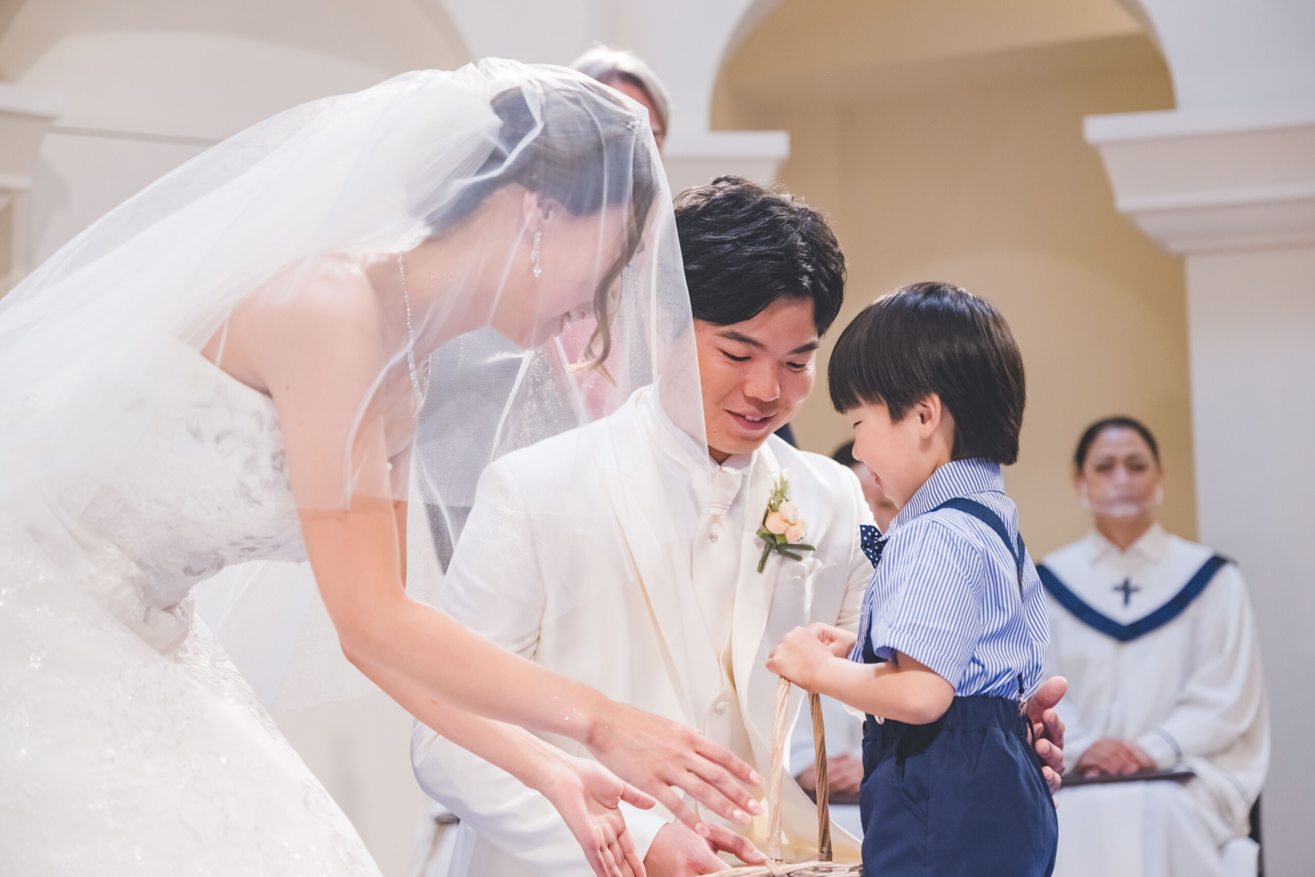 非日常の特別な衣裳でも ユーモアあふれる普段のおふたりらしさは忘れずに ご新郎様の従甥も可愛らしい衣裳に身を包み 最高の笑顔で指輪を届けてくれました♪