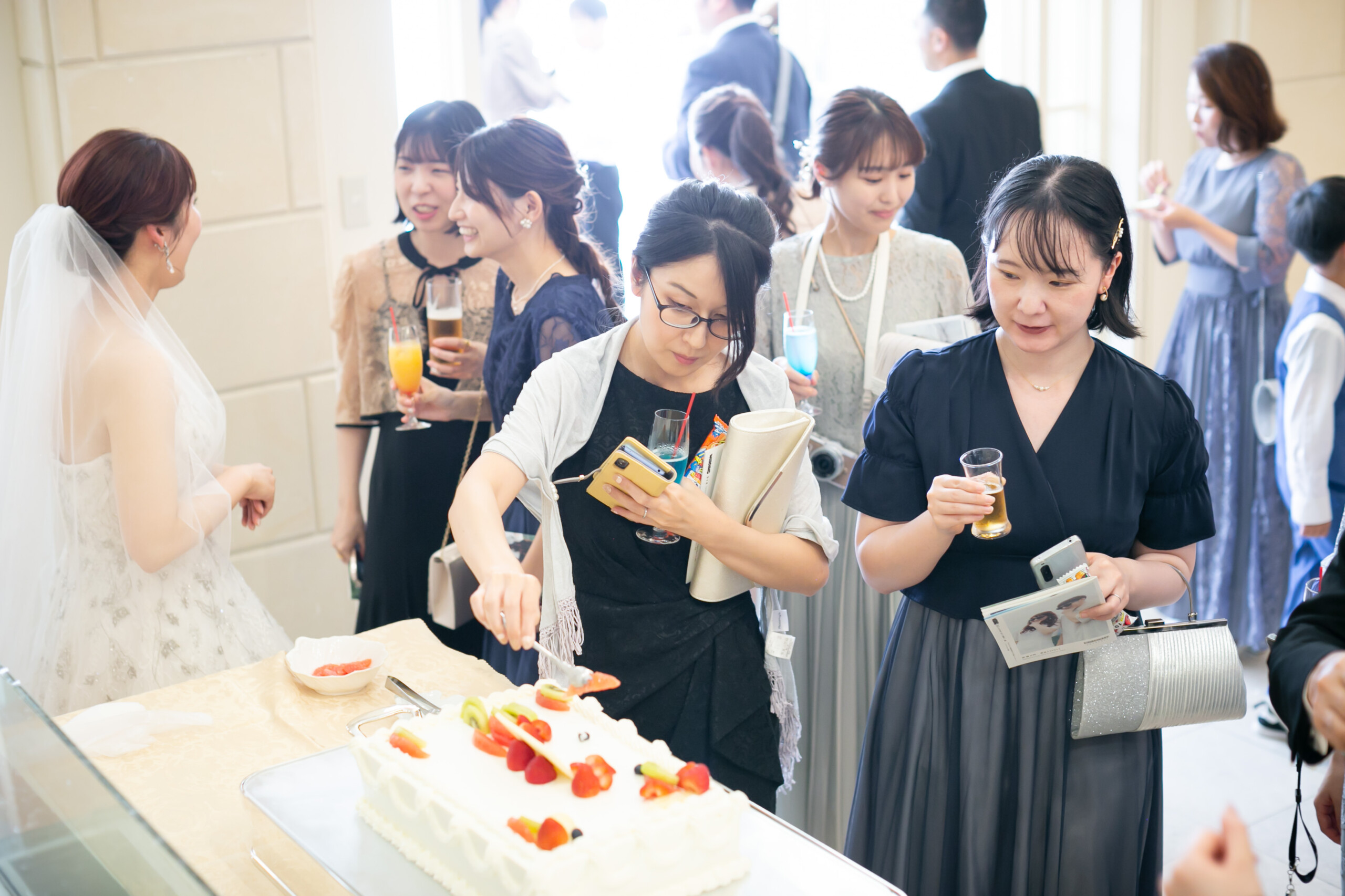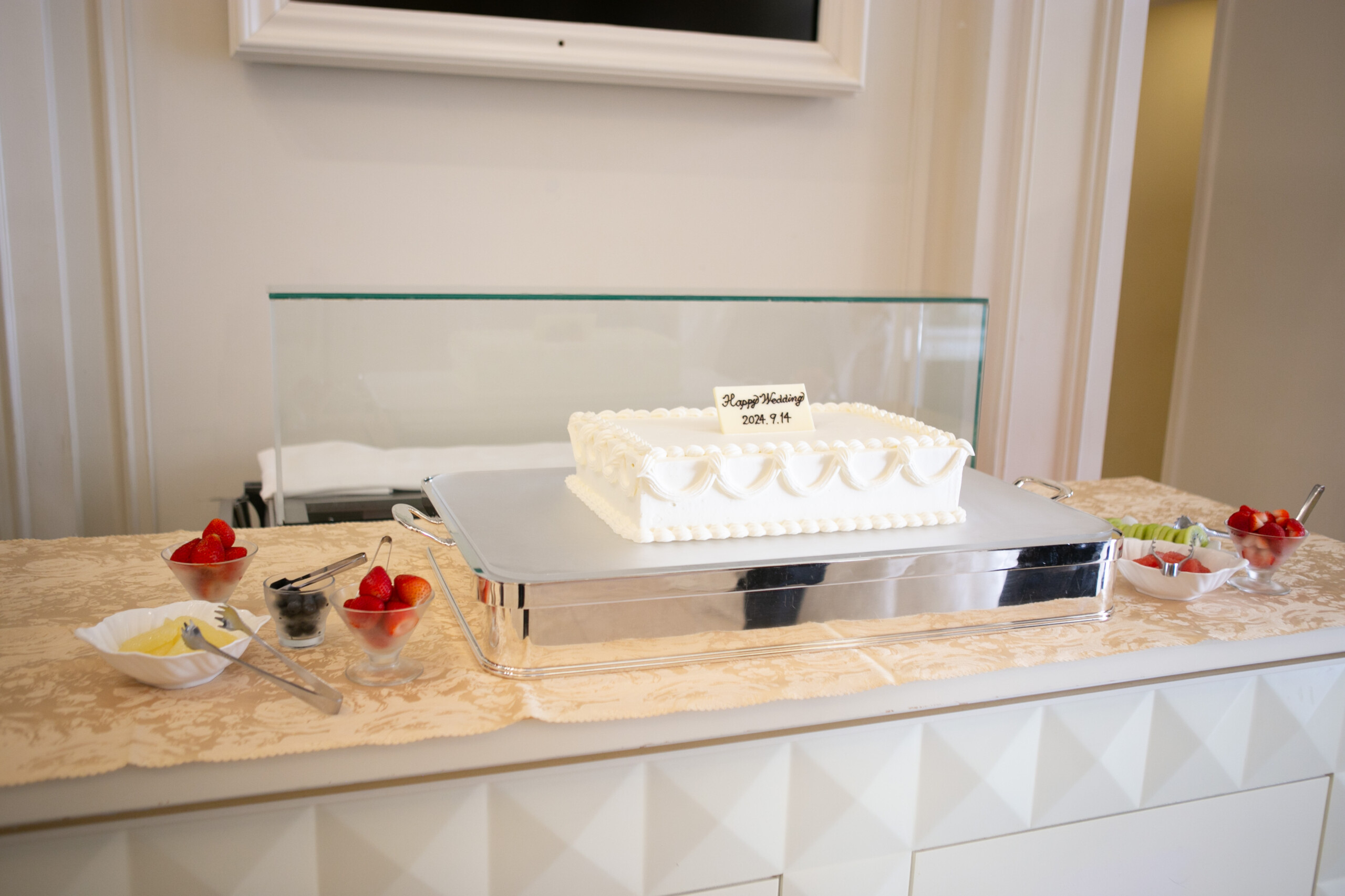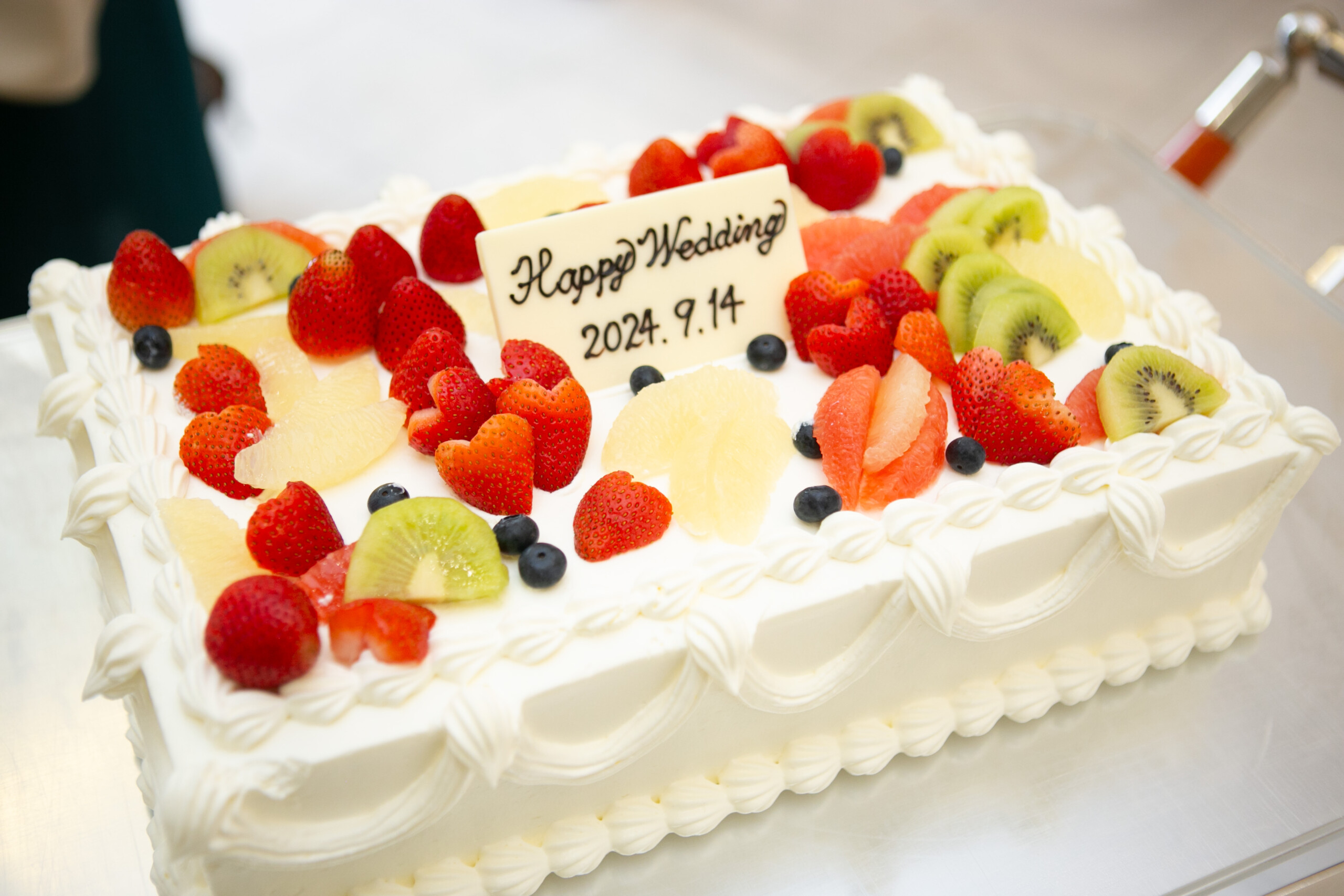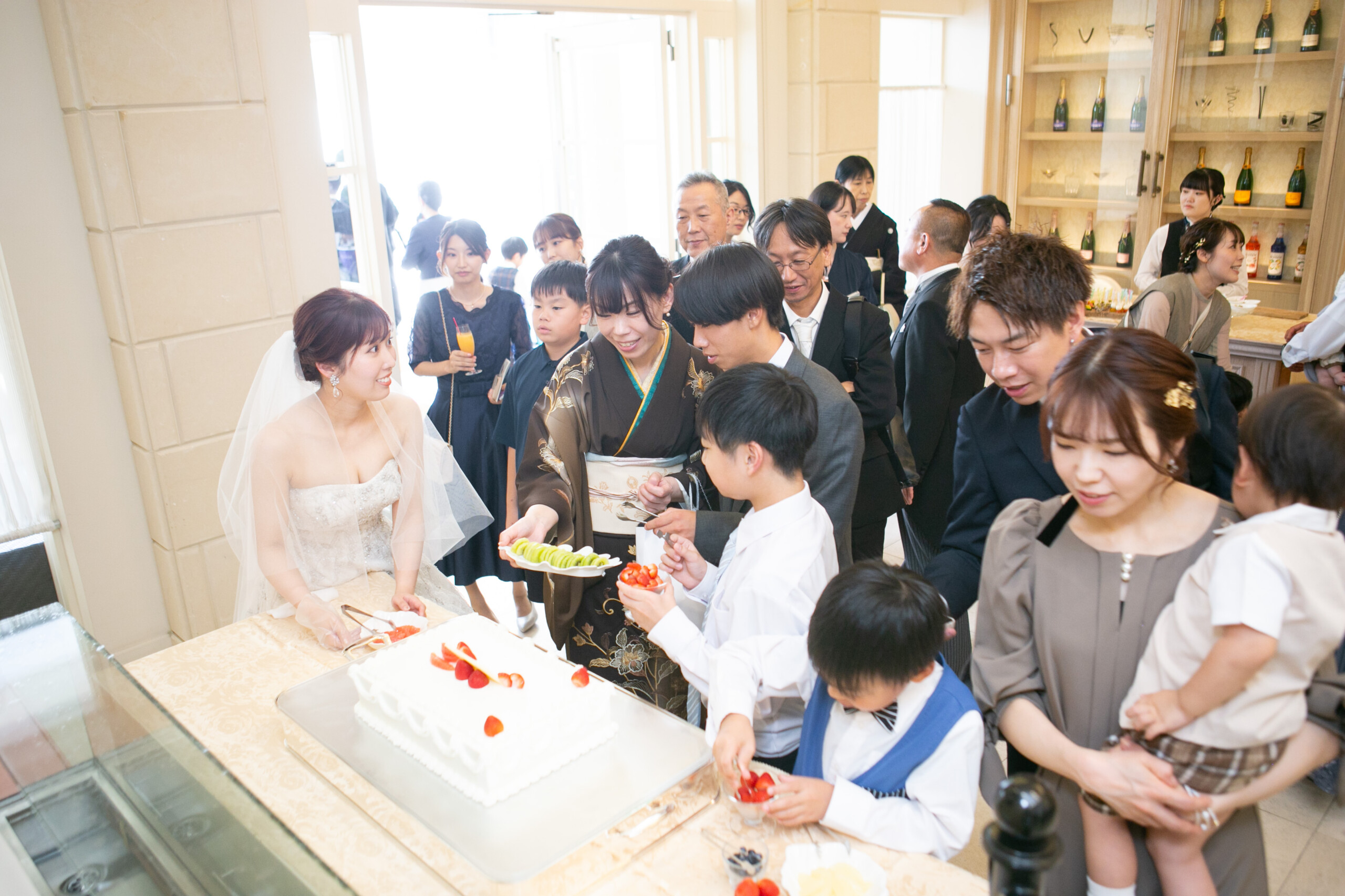 ウェディングケーキは敢えて未完成の状態でご用意! 真っ白なクリームの上にお子様や女性ゲストが思い思いにフルーツを飾り付け 世界に一つのウェディングケーキの完成です**