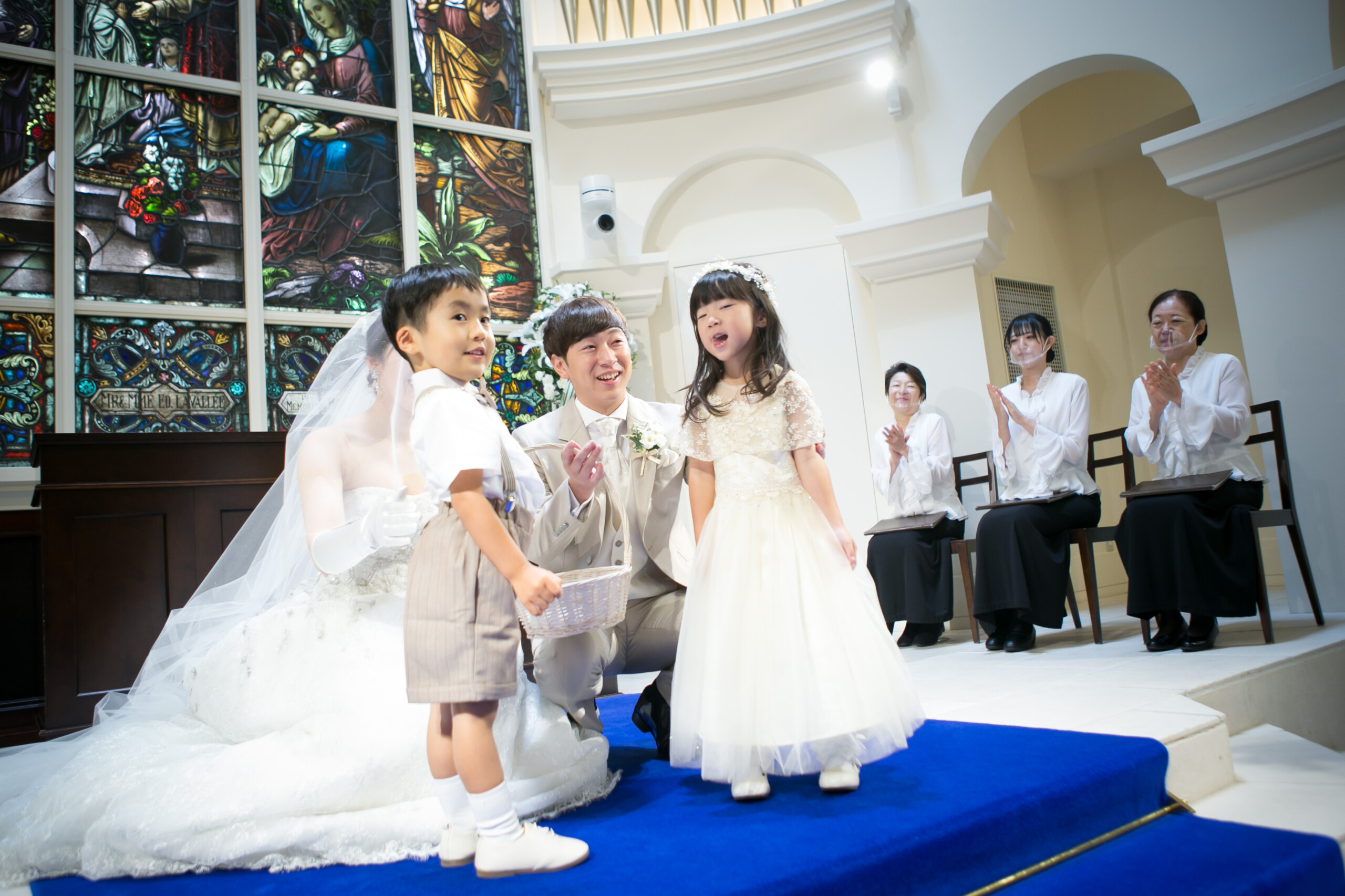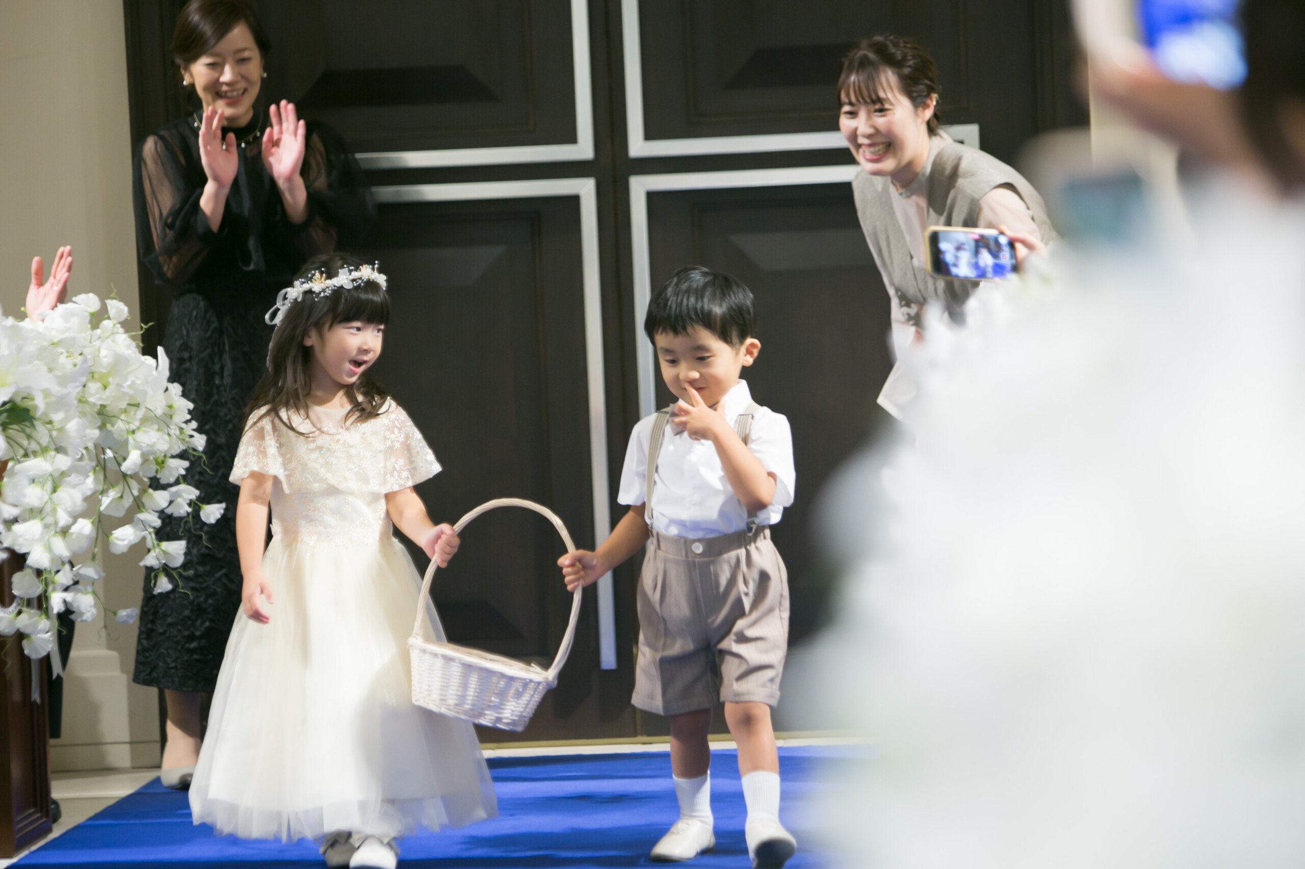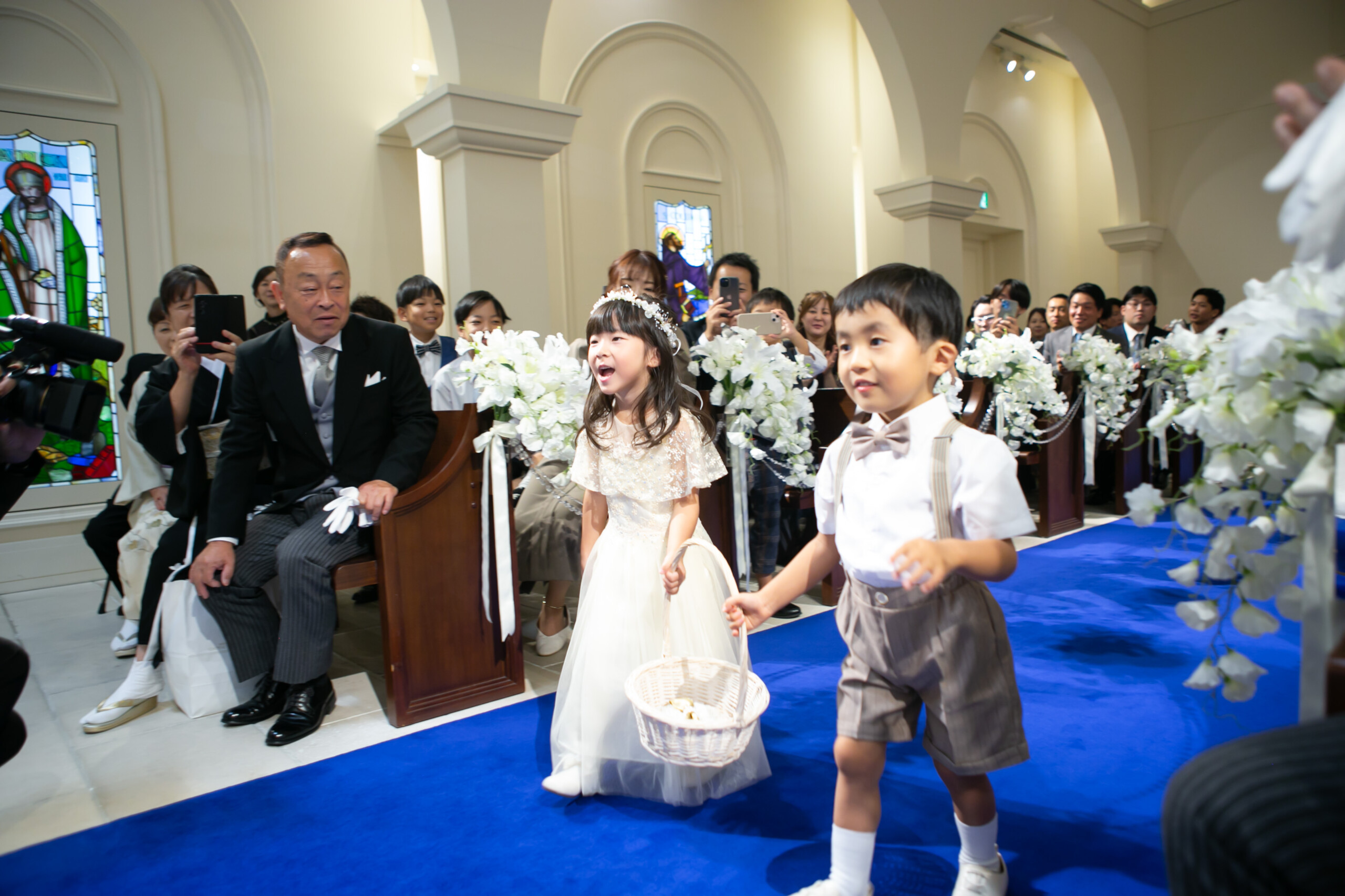 ご新郎様の姪っ子ちゃん ご新婦様の甥っ子くんのリングボーイ&リングガール ゲストが見守るなか 2人で協力して真っすぐ指輪を届けることができました♪