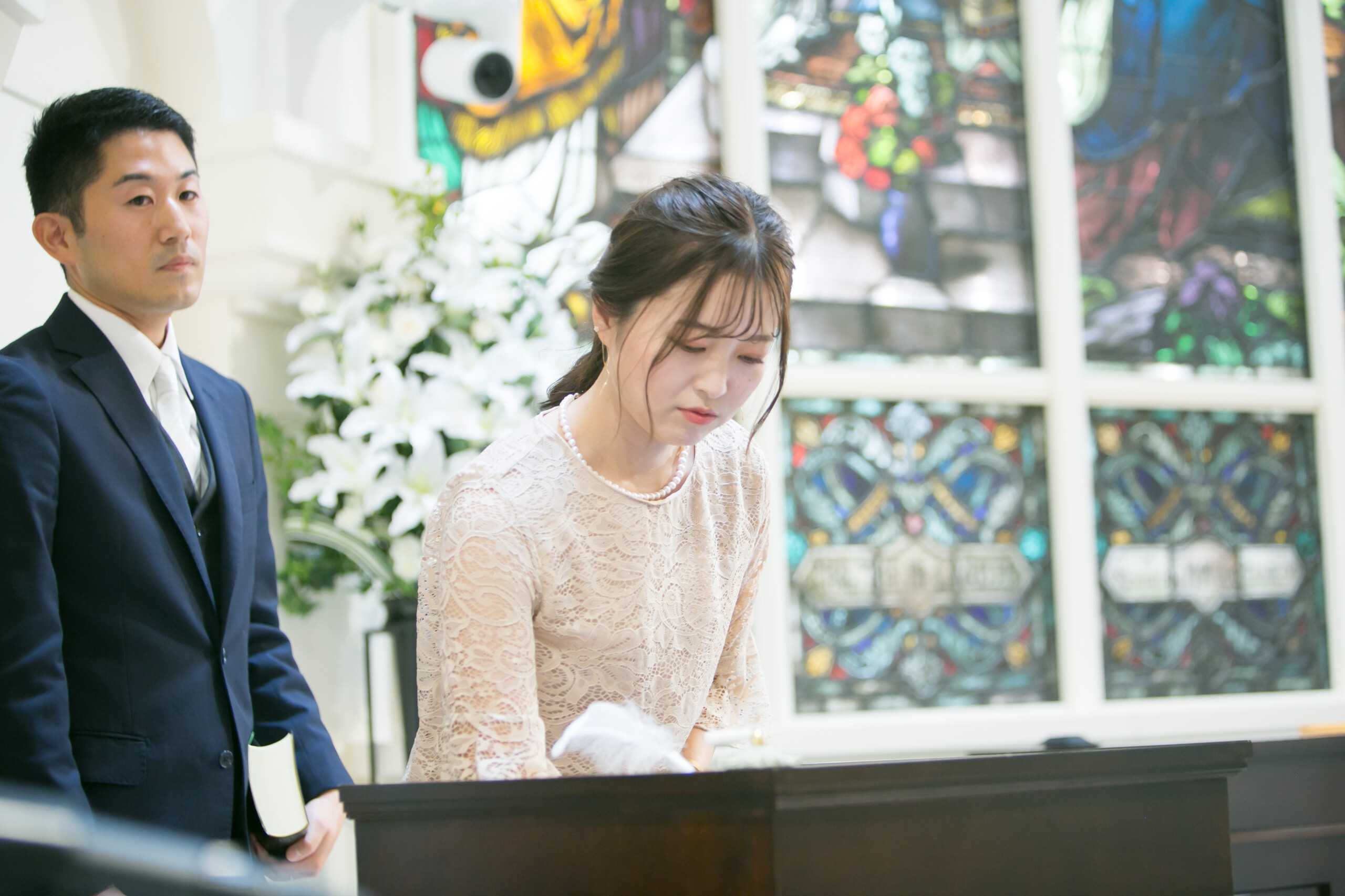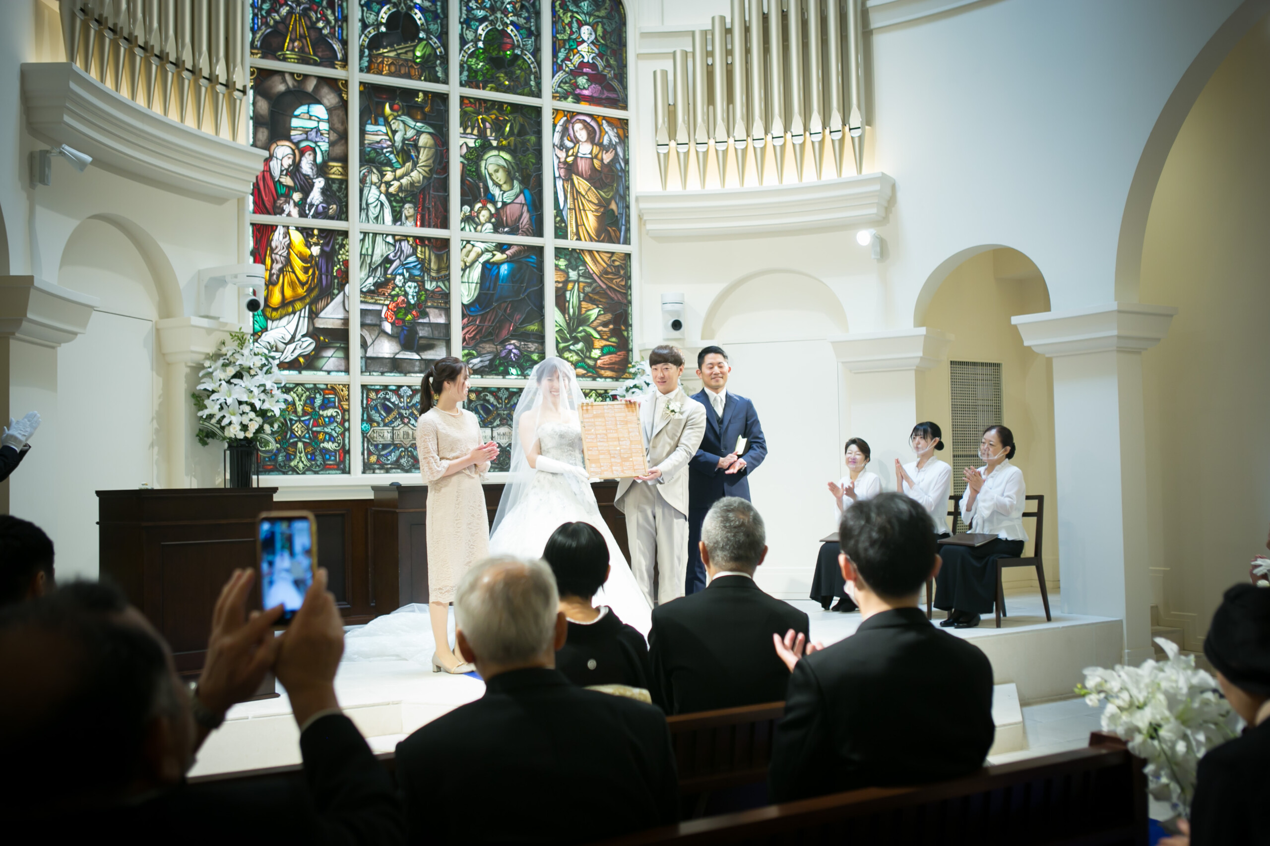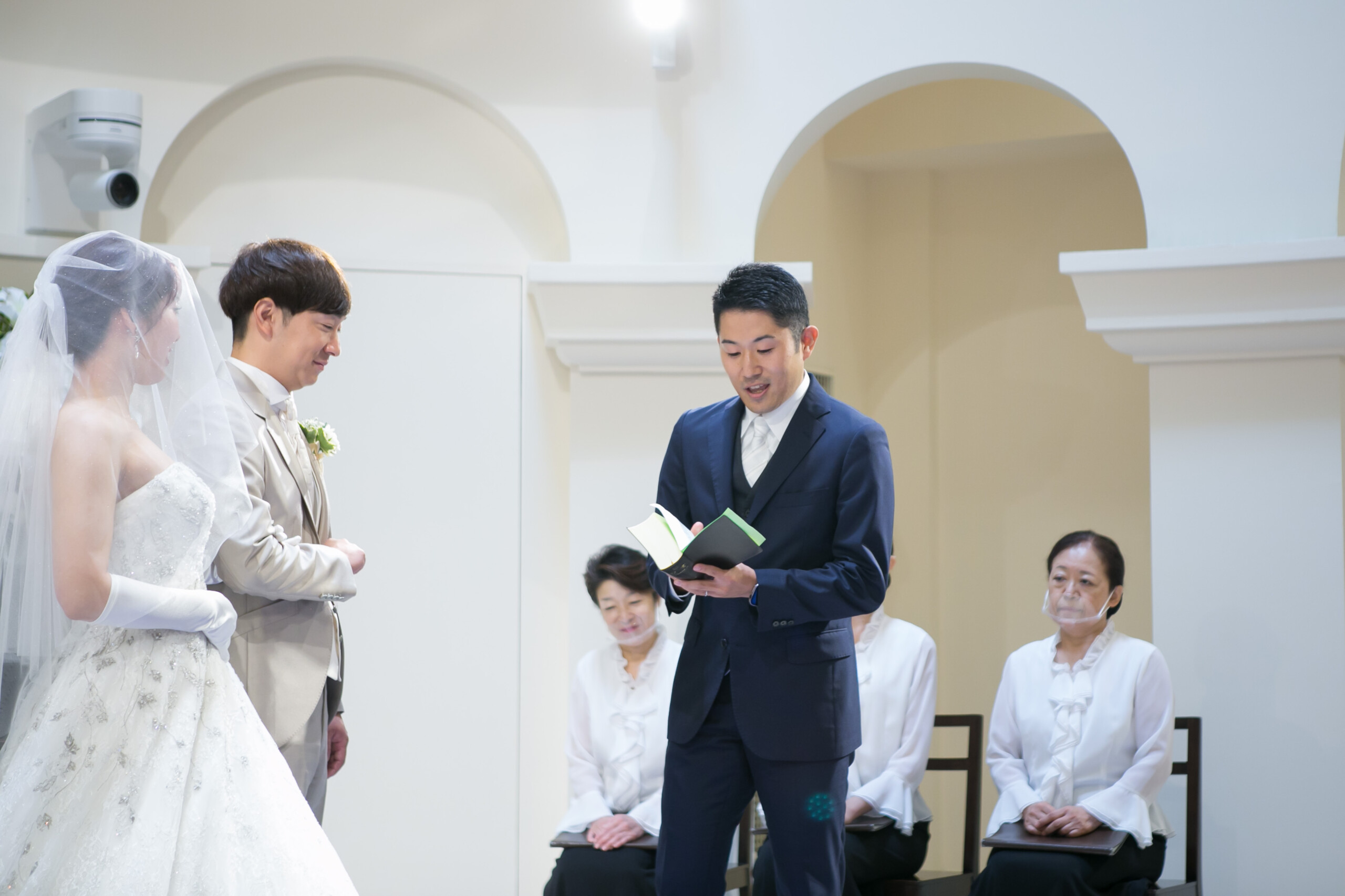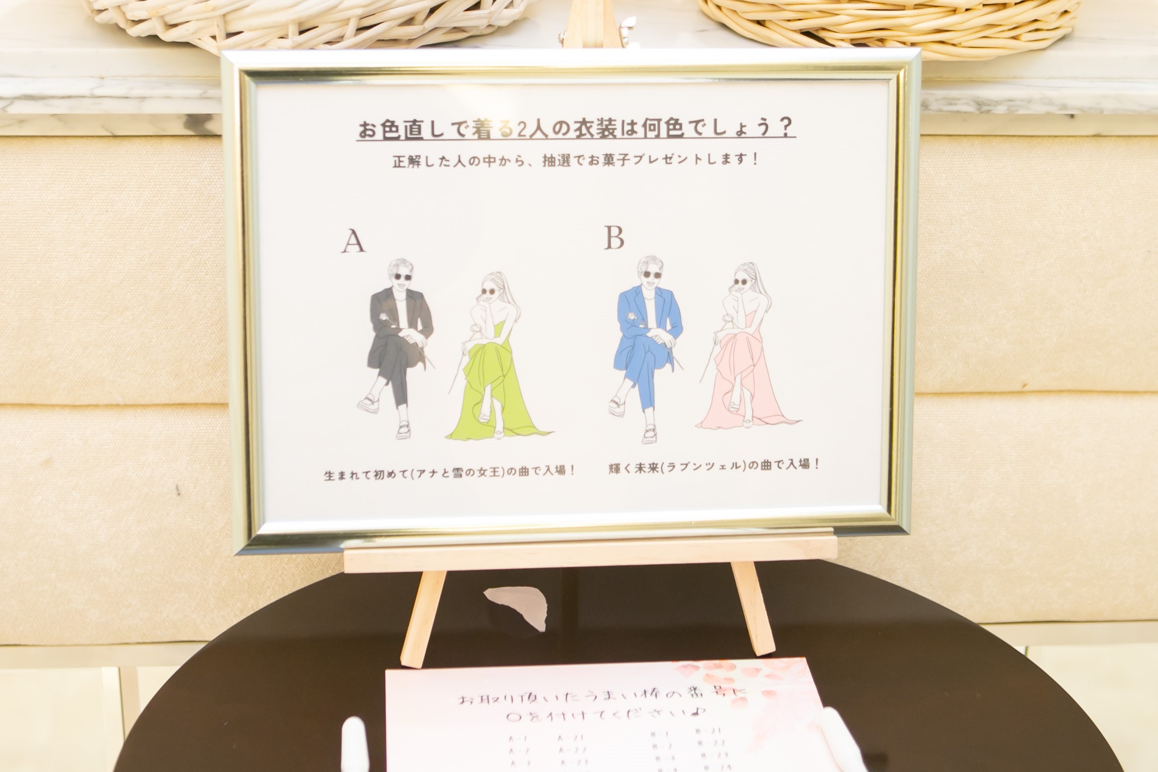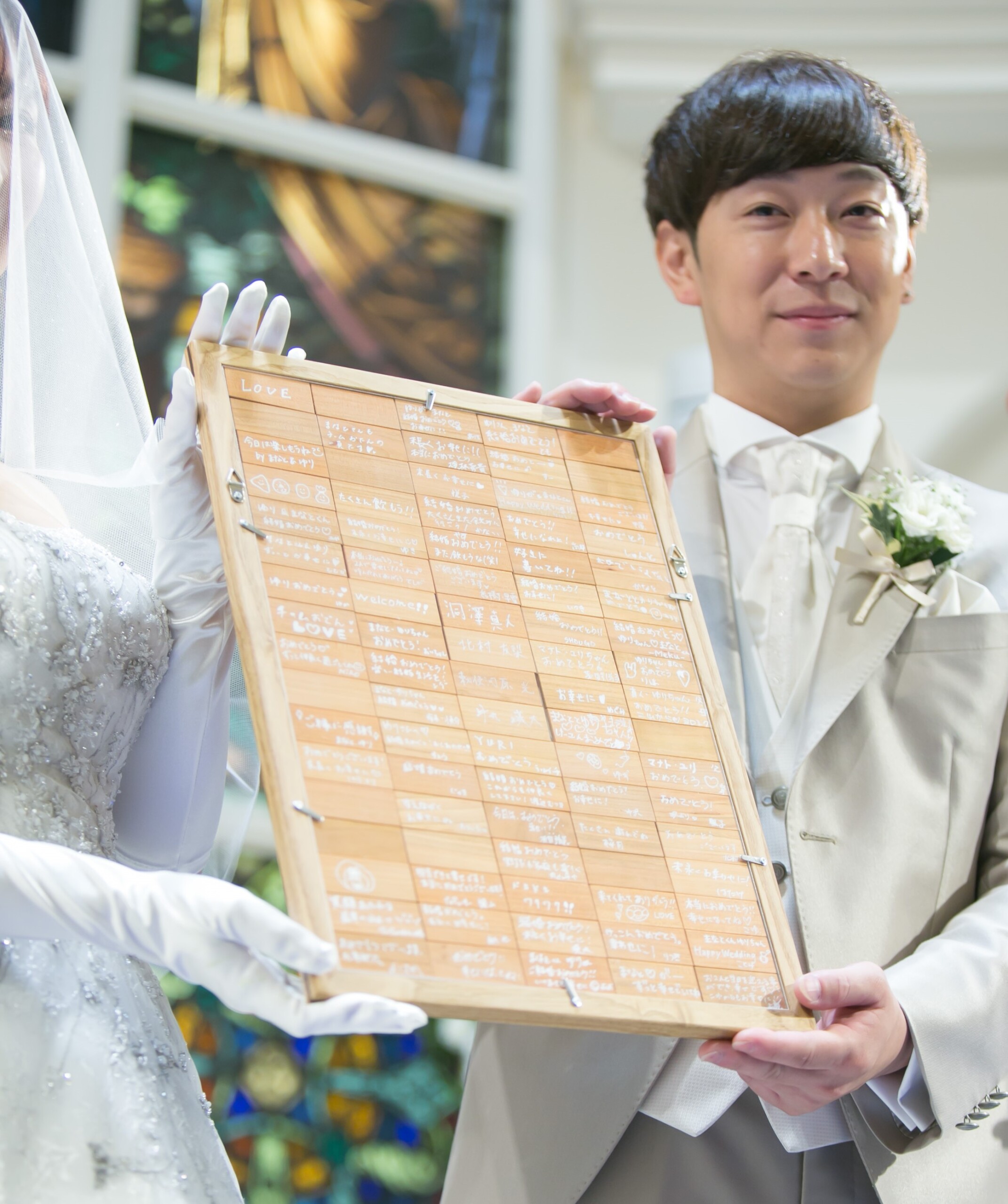 ご新郎様は中学時代 ご新婦様は幼馴染 たいせつな親友に立会人代表を依頼 親友が考えてくれた誓いの質問からご署名 ゲスト全員のお名前とメッセージを記入いただいた ウッドブロックのオリジナル結婚証明書が完成!