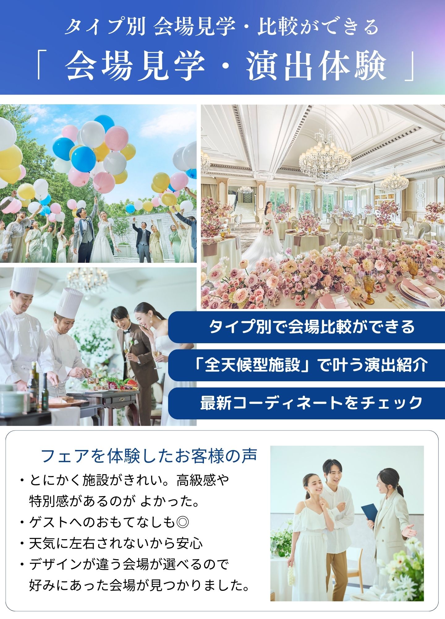 詳しい詳細や実際のチャペル・会場をご覧になることで、おふたりのご希望が明確になる方が多いので、迷われている場合はぜひフェアにご参加くださいませ。