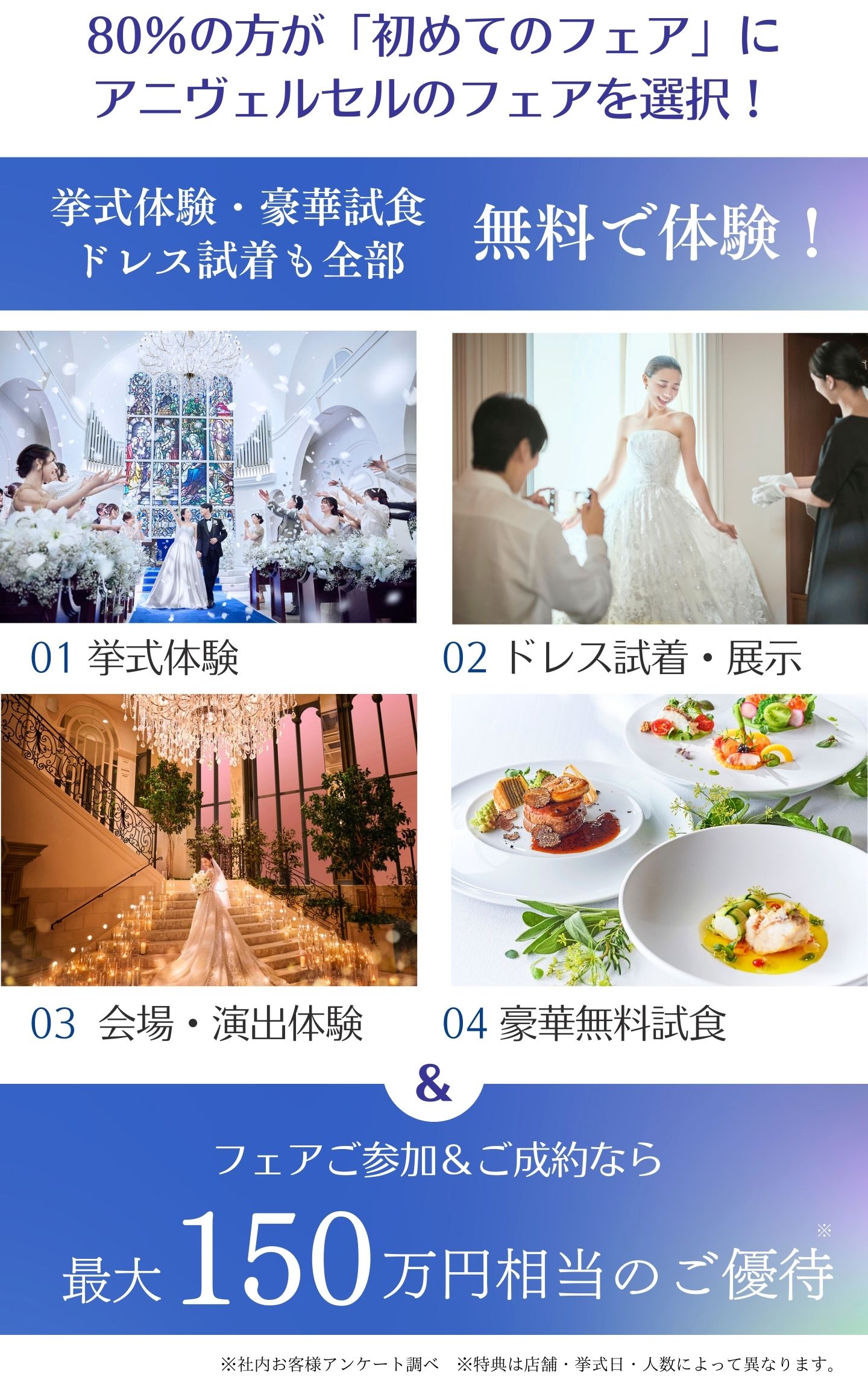 まだ具体的なイメージがない方も、フェアで実際にチャペルや会場をご覧いただく事で、おふたりのイメージも膨らみますので、ご不安点・疑問点など、どんなことでもお気軽にフェアでご相談ください。