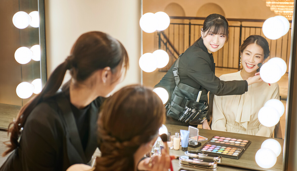 大切な一日のはじまりはおふたり専用のお控室でリラックスしながら、お支度を整えていきます。専属のヘアメイクアーティストと素敵な時間に向けて楽しく準備をお手伝いします。