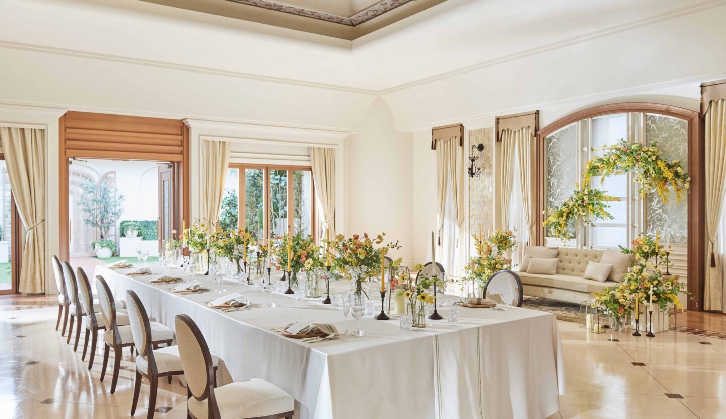 大切なゲストの皆様の笑顔が見渡せる距離感で、お披露目のお食事の時間を。ガーデン付き貸切邸宅だからこその非日常空間。ご家族・ご親族とのアットホームなひと時をお楽しみください。