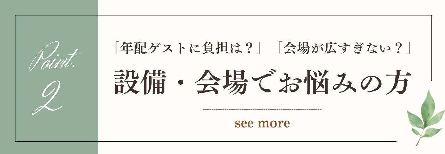 ご高齢・お子様連れのゲストの方にも安心の「バリアフリー」設備。親族控室やクロークなどの充実の設備をご用意しております。またパーティ会場は完全貸切スペース・少人数レイアウトが可能。ゲストとおふたりだけで、ゆっくりお過ごしいただけます。