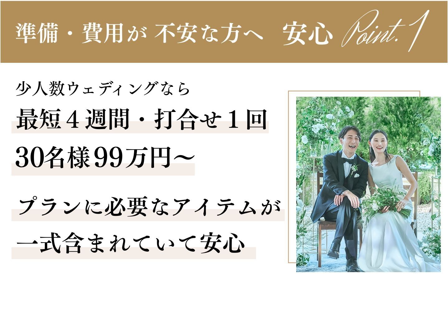 少人数ウェディングプランなら 最短1ヵ月で結婚式が実現。プランにこだわりのアイテムを追加などアレンジも可能です。