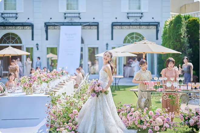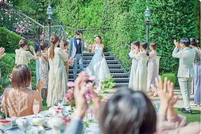 吹き抜けの開放感と煌めくシャンデリアが、空間に上質な華やかさを添え、花嫁が思い描く憧れのパーティが自然と形になります。