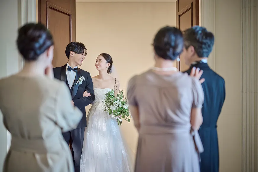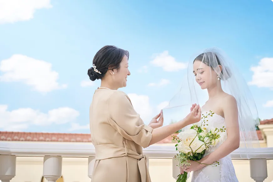 ベールは、ご新郎のもとへ向かうご新婦を守る特別なもの。そのベールを整えてくれるのは、おふたりにとって大切な存在。想いを受け取り、新しい人生へと歩み出す前の、かけがえのない時間となります。