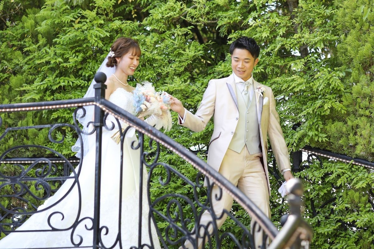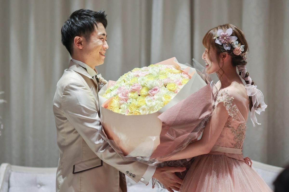 披露宴はフランス館にて行い、ガーデンを背に高砂を配置して、カーテンを開けた時に緑が綺麗に見えるよう、写真映えも意識されています。 披露宴のクライマックスは、ご新郎からご新婦へのサプライズです。あまり手紙を書くタイプではないご新郎が、プロポーズ以来2通目のお手紙をご用意されました。そして、手紙と一緒に200本のバラの花束をお渡しになり、お互い歳をとっても一緒にいたいという気持ちを伝えていらっしゃいました。