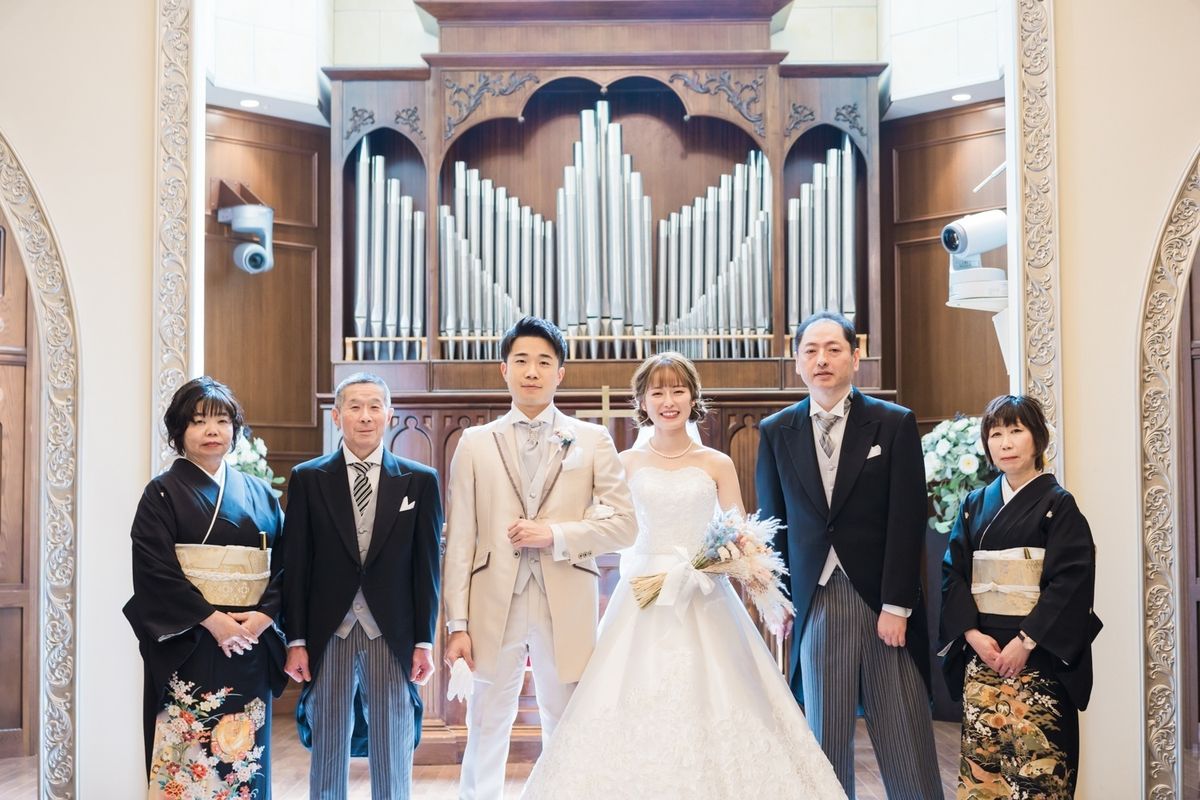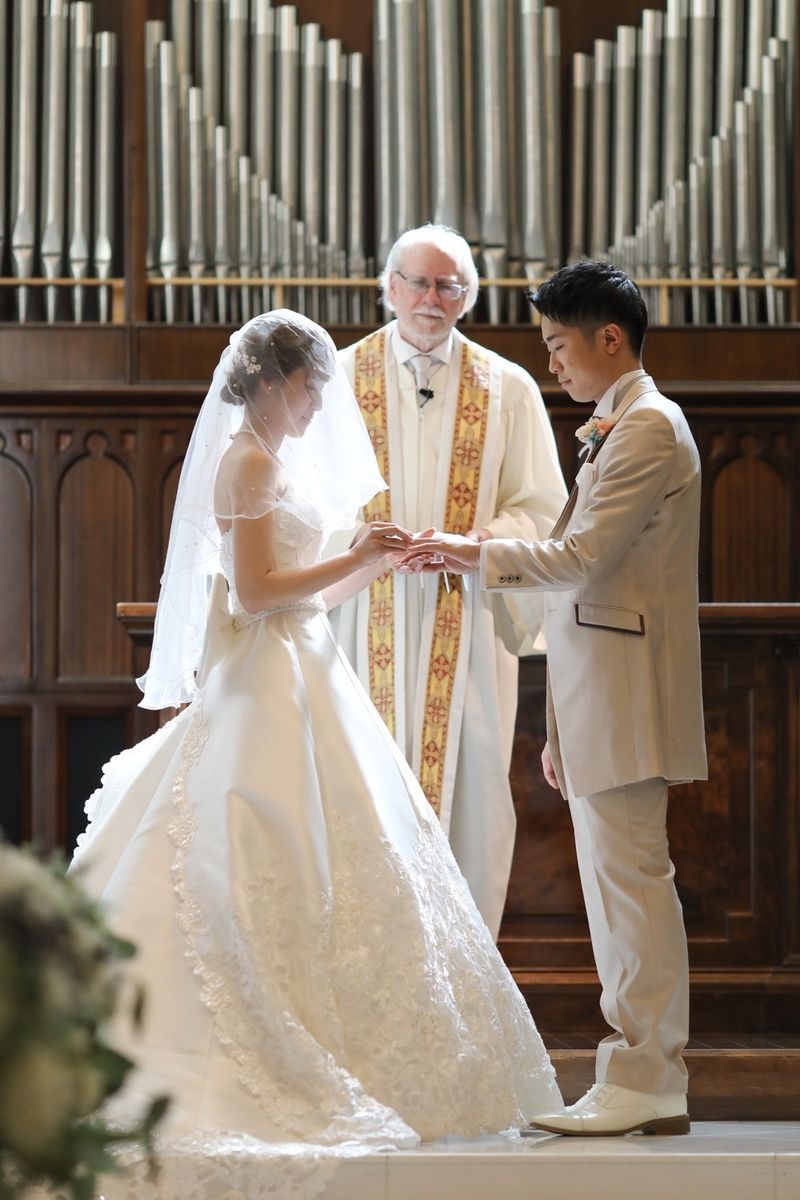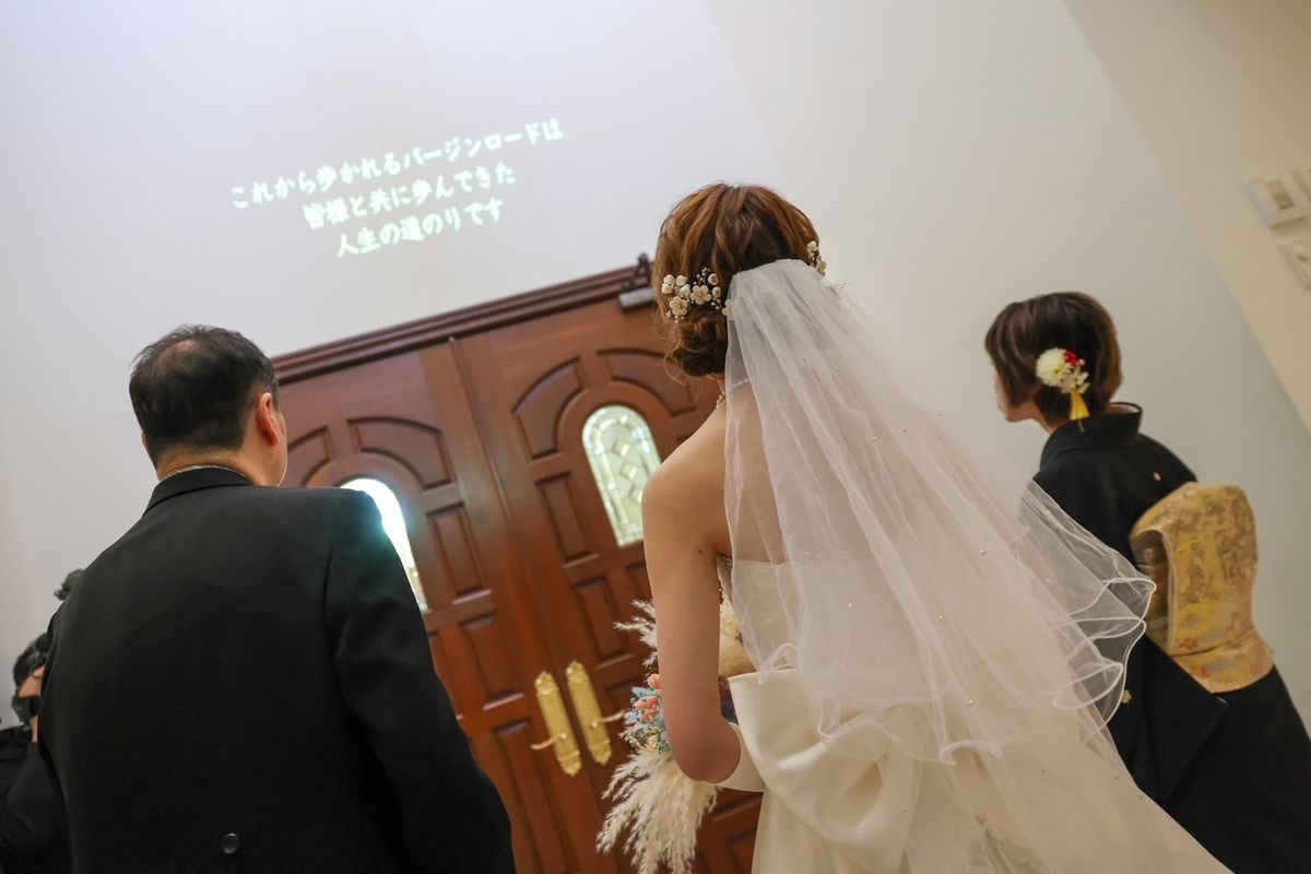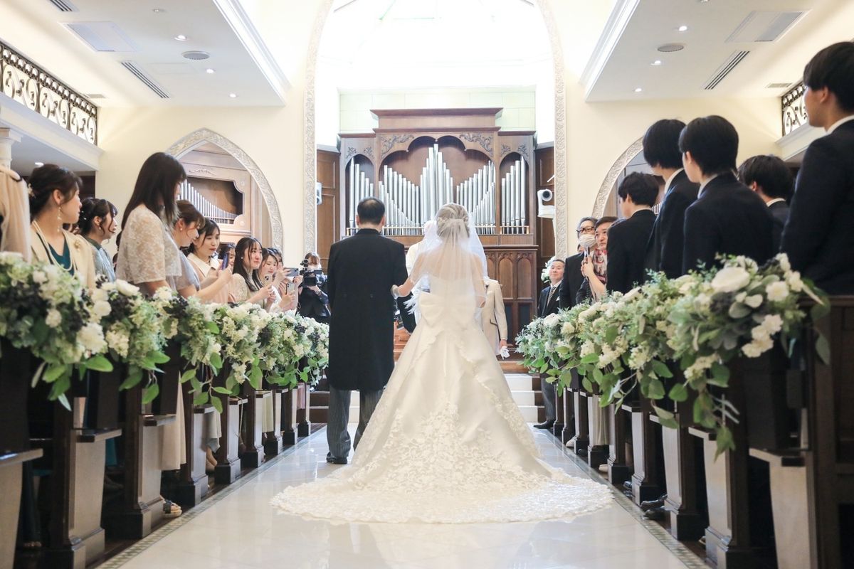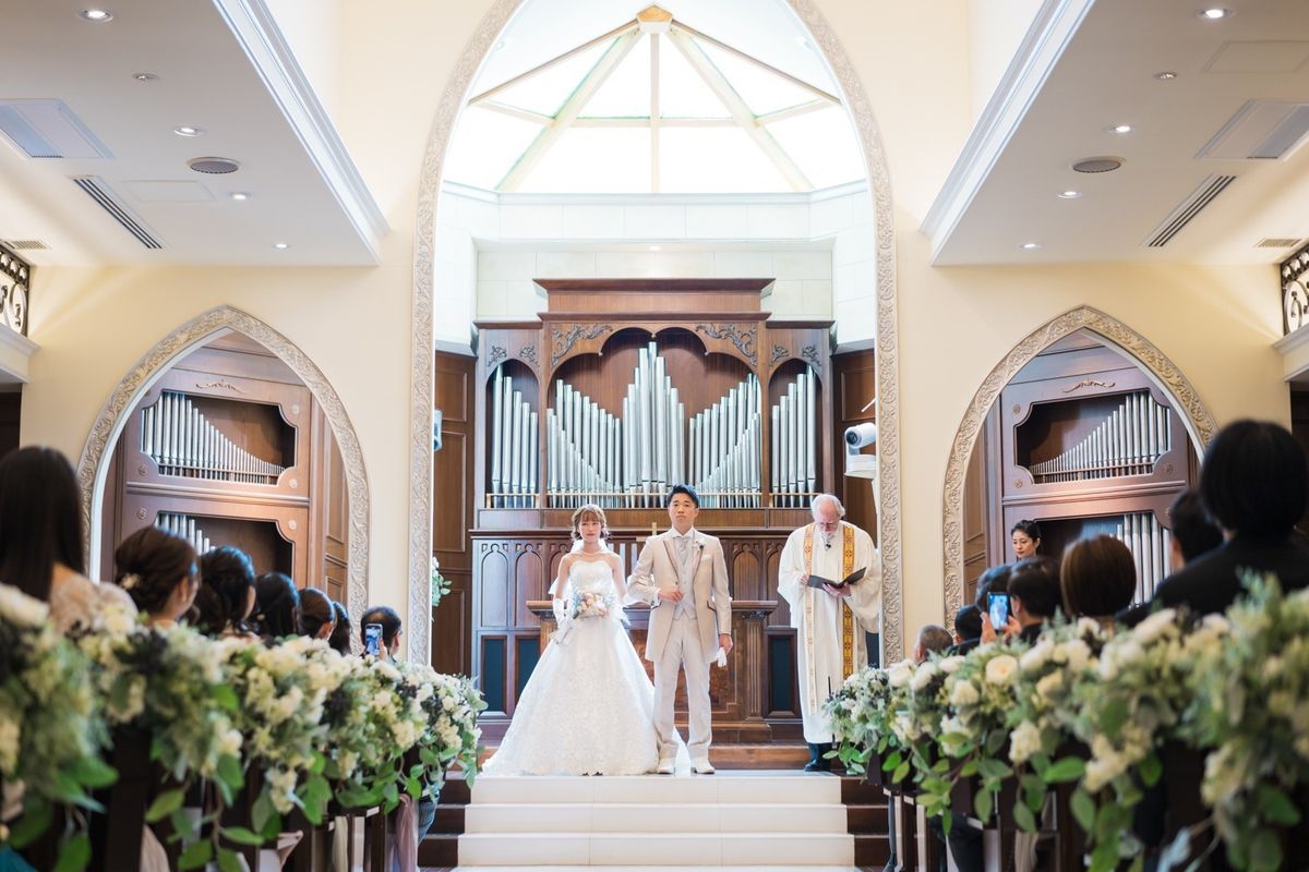 式場の正面にパイプオルガンがあるところ、床が白くご新郎ご新婦の姿が綺麗に反射するところが、おふたりのお気に入りポイントだそう。また、壁や椅子が木目調なところも「シンプルだけど落ち着く」と気に入ってくださいました。 当日は、ご新婦入場の前にセレモニームービーを流して、今までの人生を振り返り、感謝の気持ちを伝える演出を行ないました。感動で大号泣されているご友人もいて、印象的なシーンとなりました。
