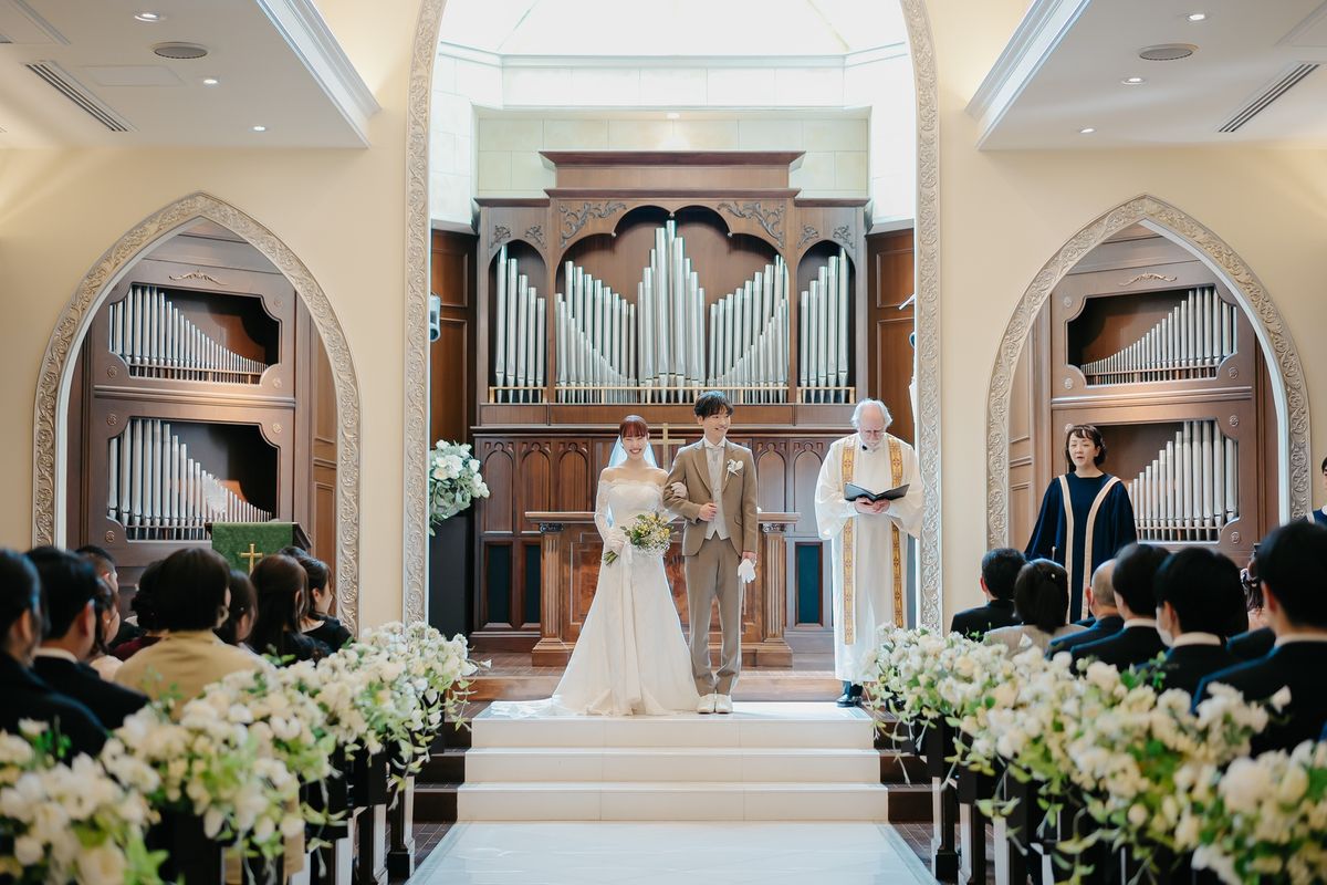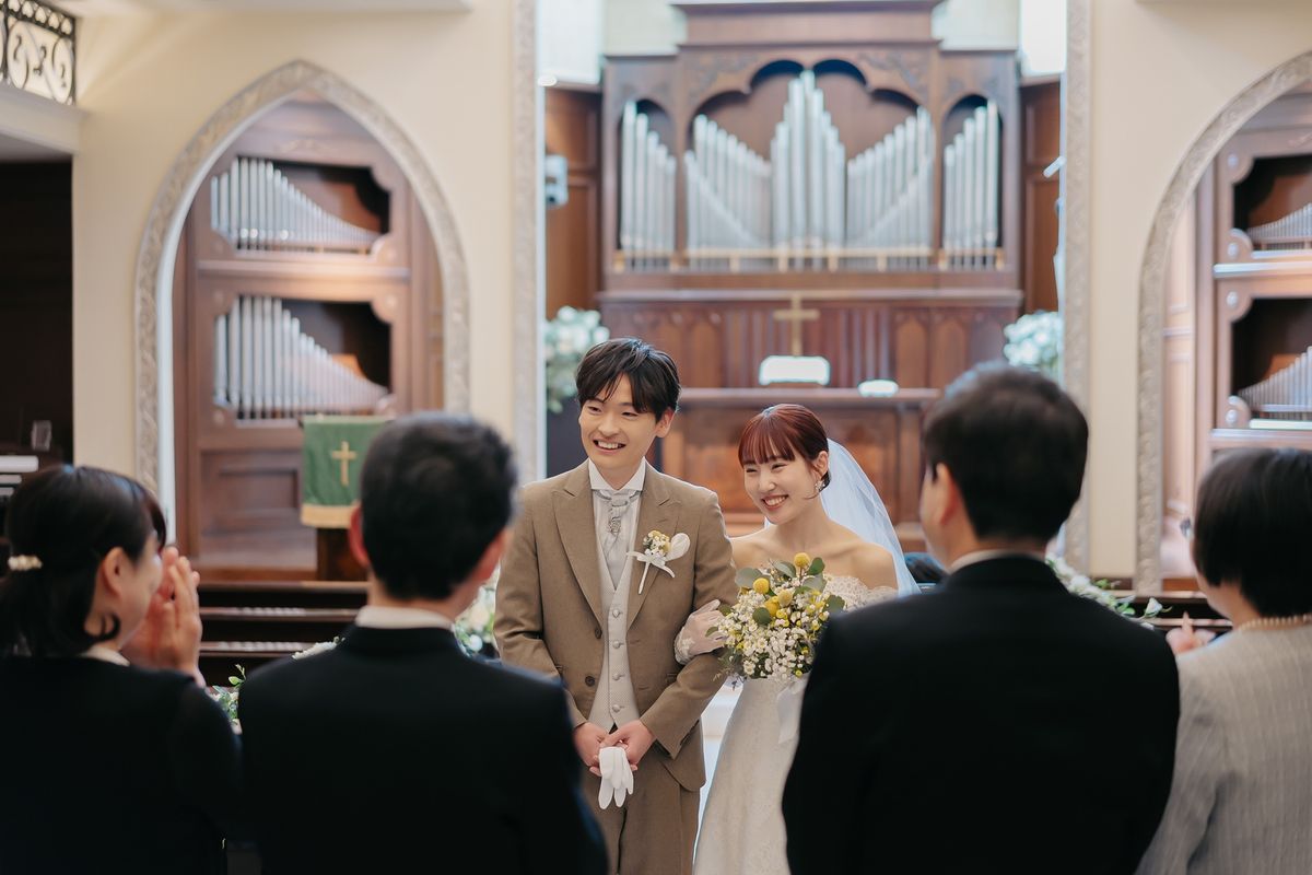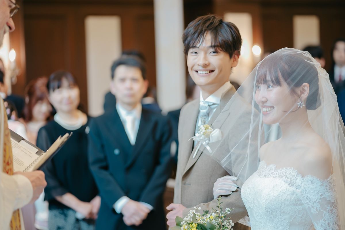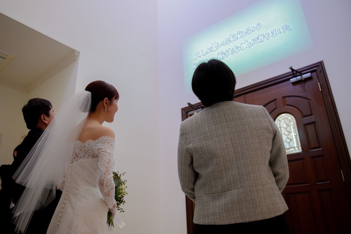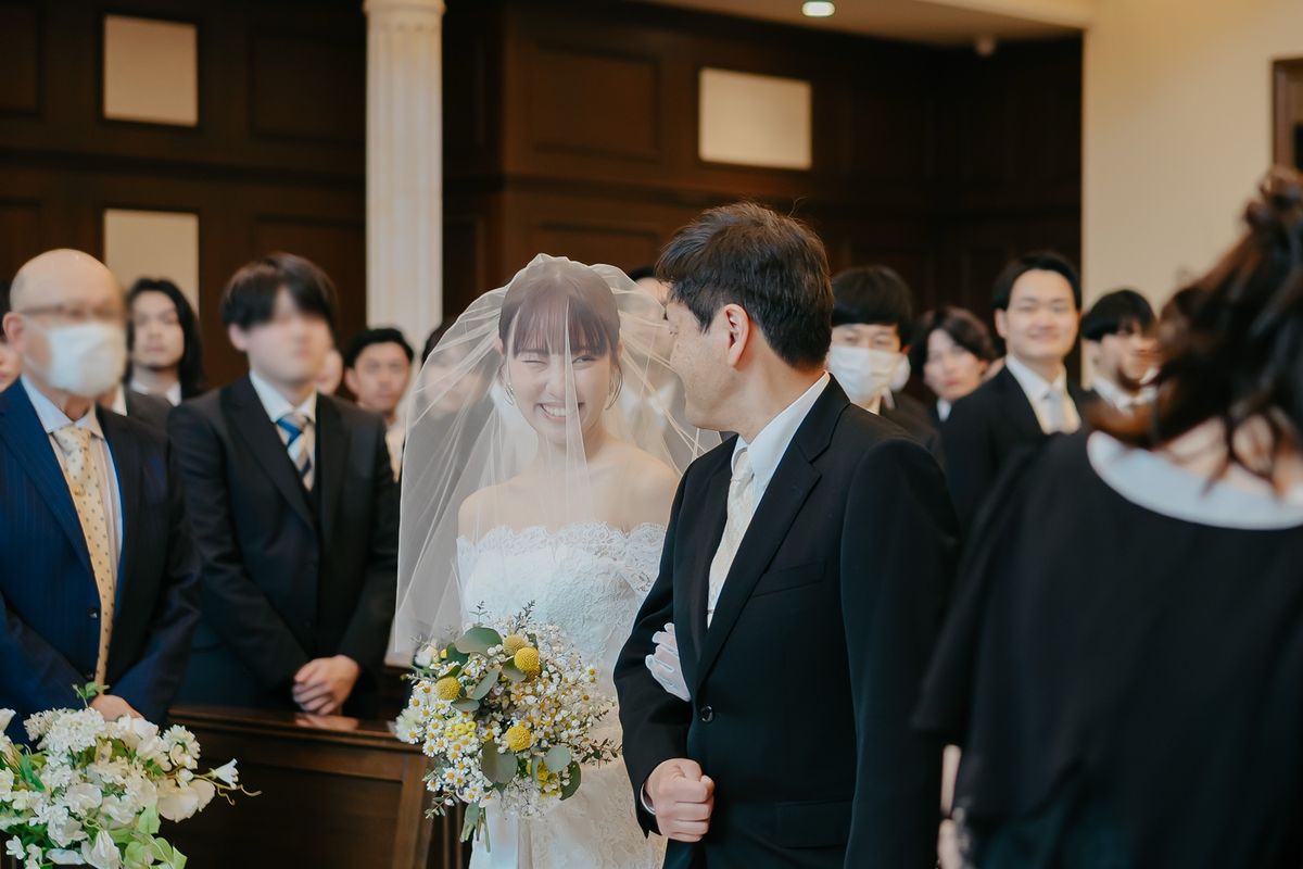挙式中は、陽光が溢れ、緑も感じられるナチュラルな雰囲気の中、温かみを感じるお写真を撮影されました。 入場前の親御様への感謝の想いを伝える動画演出では、ご両親とも涙を流され、その姿を見たおふたりも感極まっていたご様子。ご新婦は、御父様は絶対に泣かないだろうと思っていたため、ここまで育ててくれたことに、改めて感謝の気持ちが込み上げ、式を挙げたことが1つの親孝行になったと実感し、嬉しく思ったそうです。