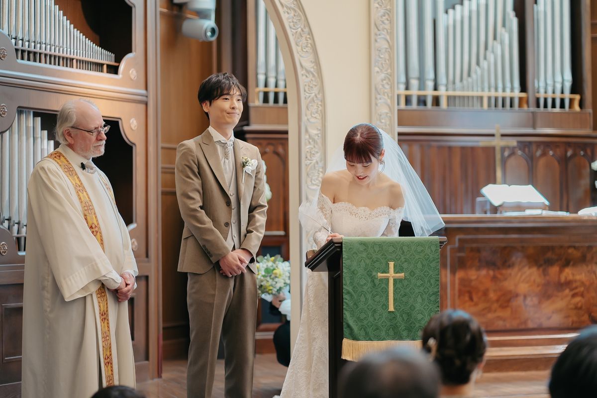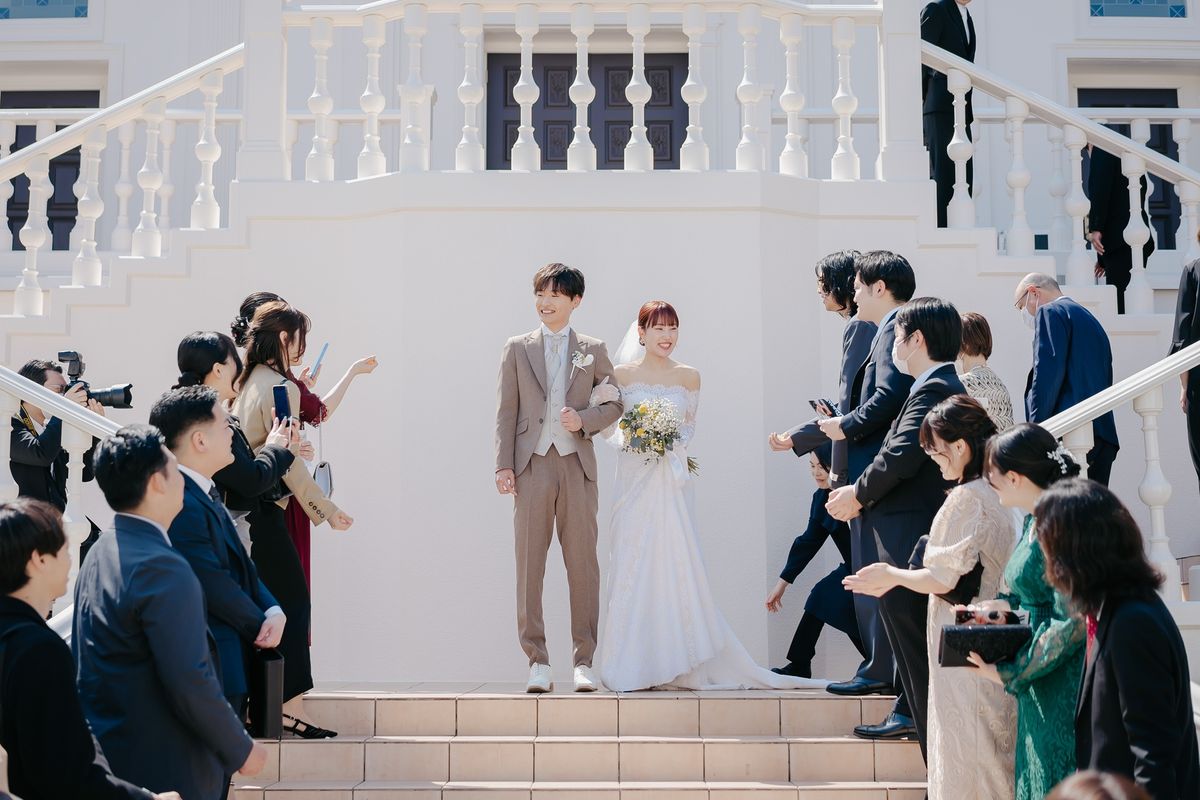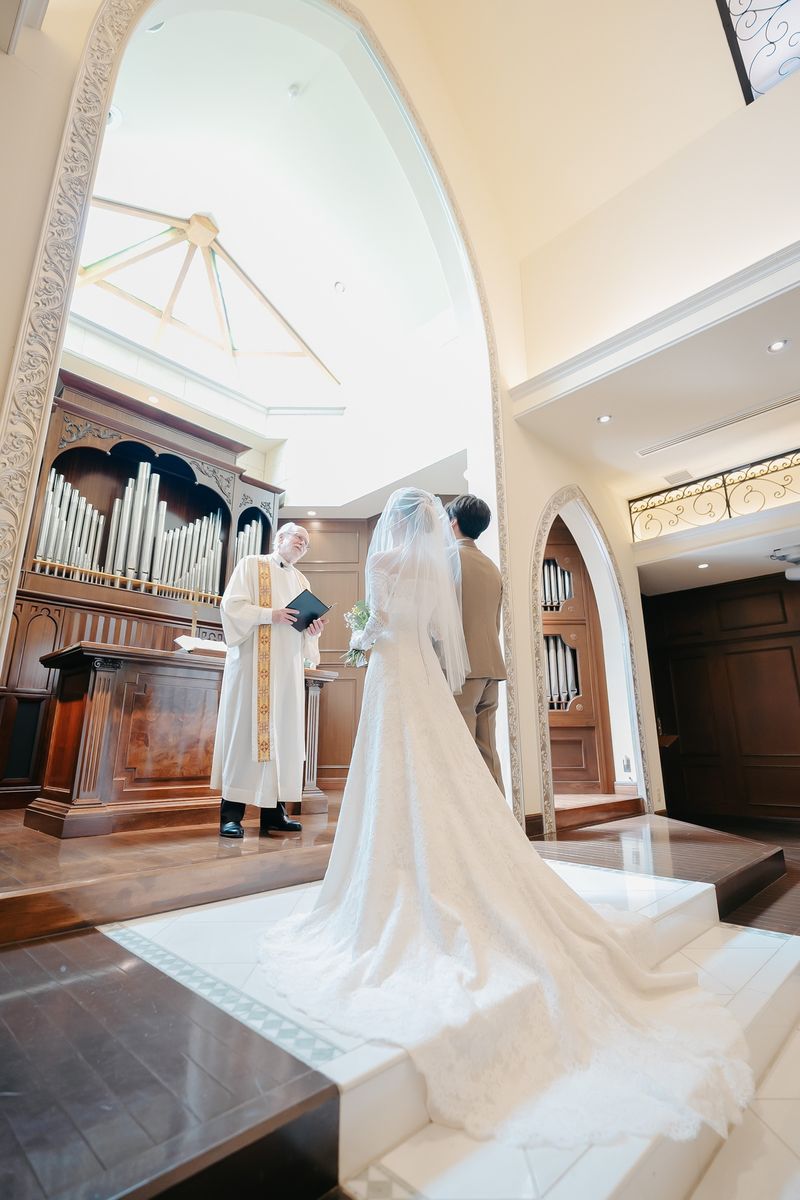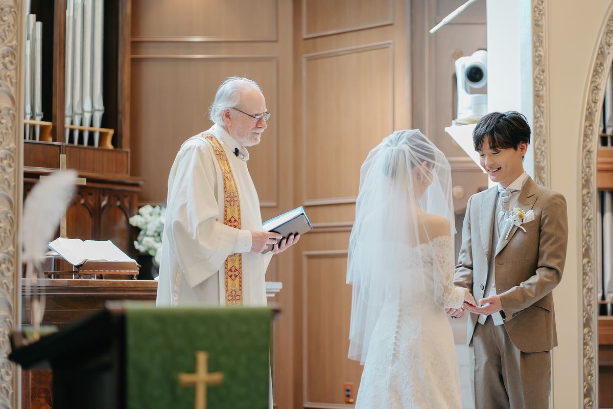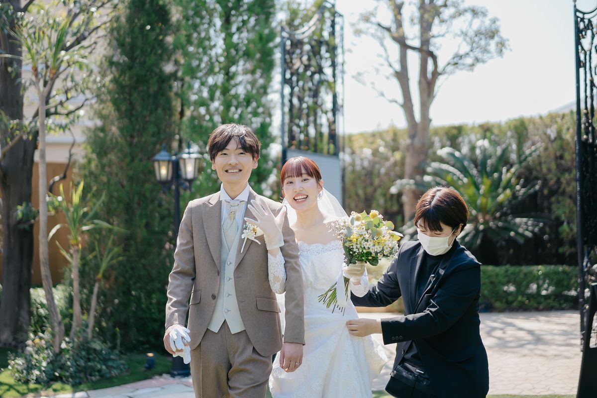 挙式中は、陽光が溢れ、緑も感じられるナチュラルな雰囲気の中、温かみを感じるお写真を撮影されました。 入場前の親御様への感謝の想いを伝える動画演出では、ご両親とも涙を流され、その姿を見たおふたりも感極まっていたご様子。ご新婦は、御父様は絶対に泣かないだろうと思っていたため、ここまで育ててくれたことに、改めて感謝の気持ちが込み上げ、式を挙げたことが1つの親孝行になったと実感し、嬉しく思ったそうです。
