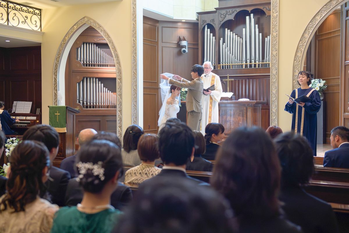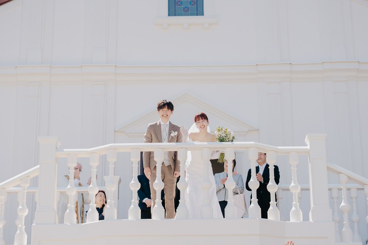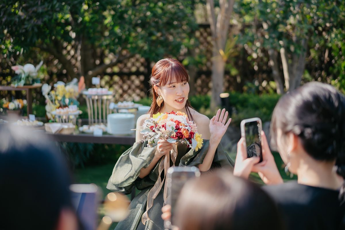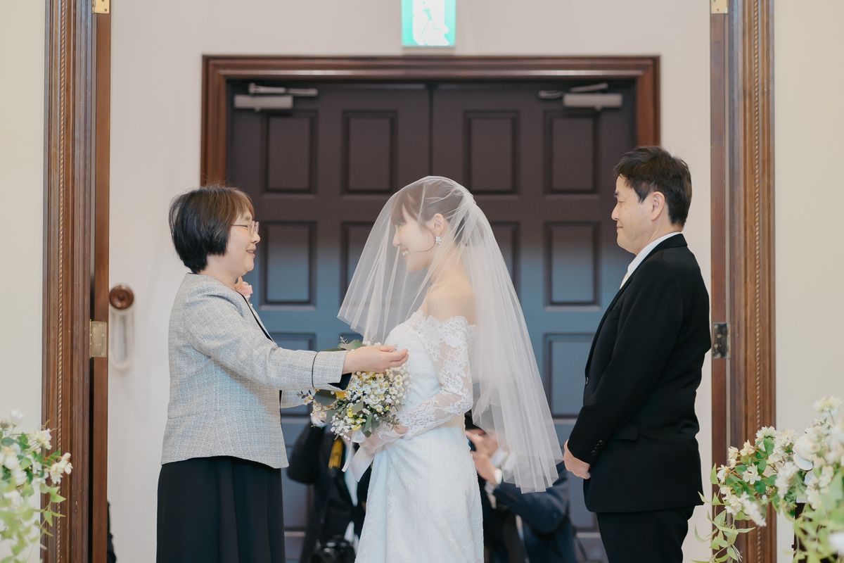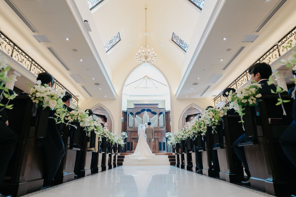 挙式中は、陽光が溢れ、緑も感じられるナチュラルな雰囲気の中、温かみを感じるお写真を撮影されました。 入場前の親御様への感謝の想いを伝える動画演出では、ご両親とも涙を流され、その姿を見たおふたりも感極まっていたご様子。ご新婦は、御父様は絶対に泣かないだろうと思っていたため、ここまで育ててくれたことに、改めて感謝の気持ちが込み上げ、式を挙げたことが1つの親孝行になったと実感し、嬉しく思ったそうです。