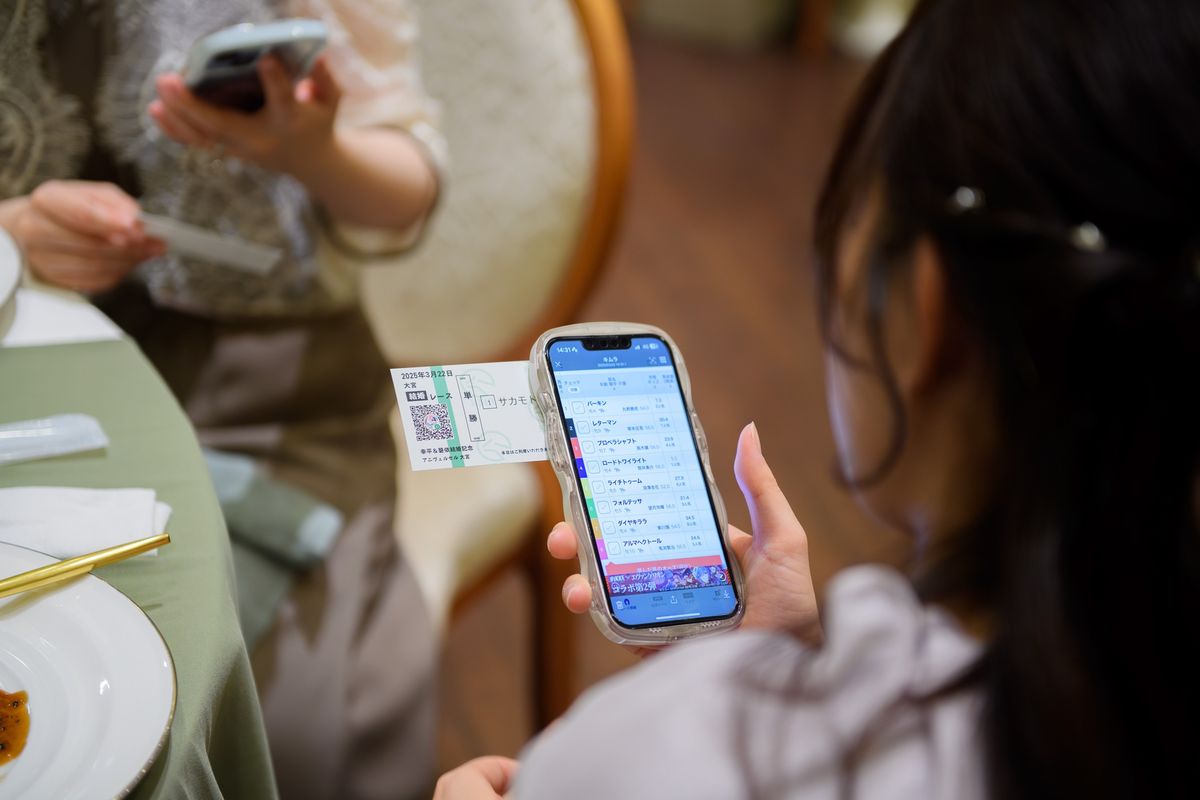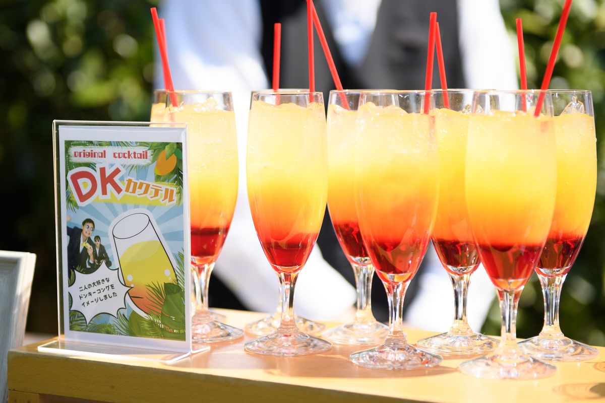 『ふたりらしく、面白い結婚式』にするために、ガーデンでの歓談タイムのBGMやオリジナルカクテルは、おふたりが好きなドンキーコングをモチーフにしたものをご用意するなど、五感で楽しめる工夫をされています。 また、よく競馬を見に行くことから、馬券風にデザインした席札に番号を振り、余興で「◯◯結婚記念レース」と題した個人協賛レースの映像を上映。当選したゲストにプレゼントを贈るという企画で楽しまれました。