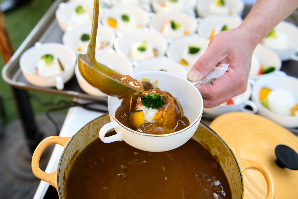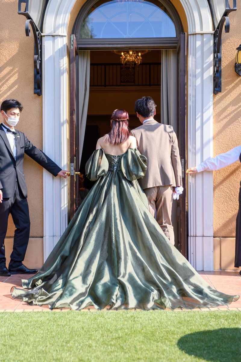 『イタリア館』は、ガーデンも自由に使うことができるため、おふたりは、お色直し後の再入場を階段からではなく、ガーデンからの入場にし、サプライズ感を演出されました。 特に印象的だったのは、ウェディングケーキの代わりの「ウェディングカレー」です。ご新郎がヒンディー語を専攻され、インドカレー店でのアルバイト経験があり、週5でカレーを食べていた、というエピソードにちなんだ演出で、大いに盛り上がりました!