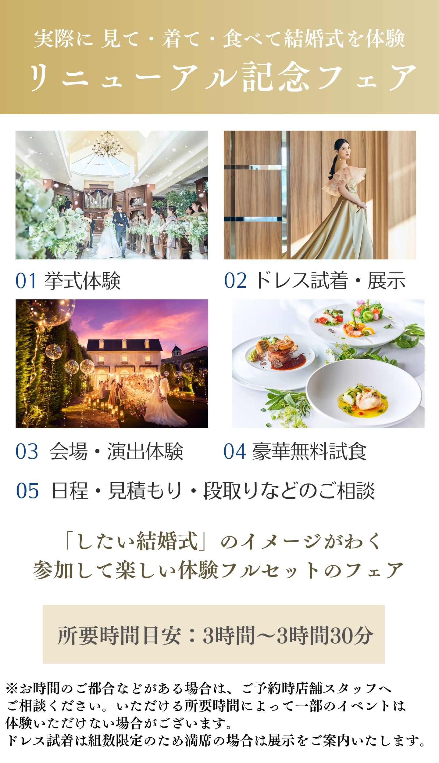 詳しい詳細や実際のチャペル・会場をご覧になることで、おふたりのご希望が明確になる方が多いので、迷われている場合はぜひフェアにご参加くださいませ。
