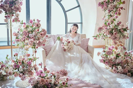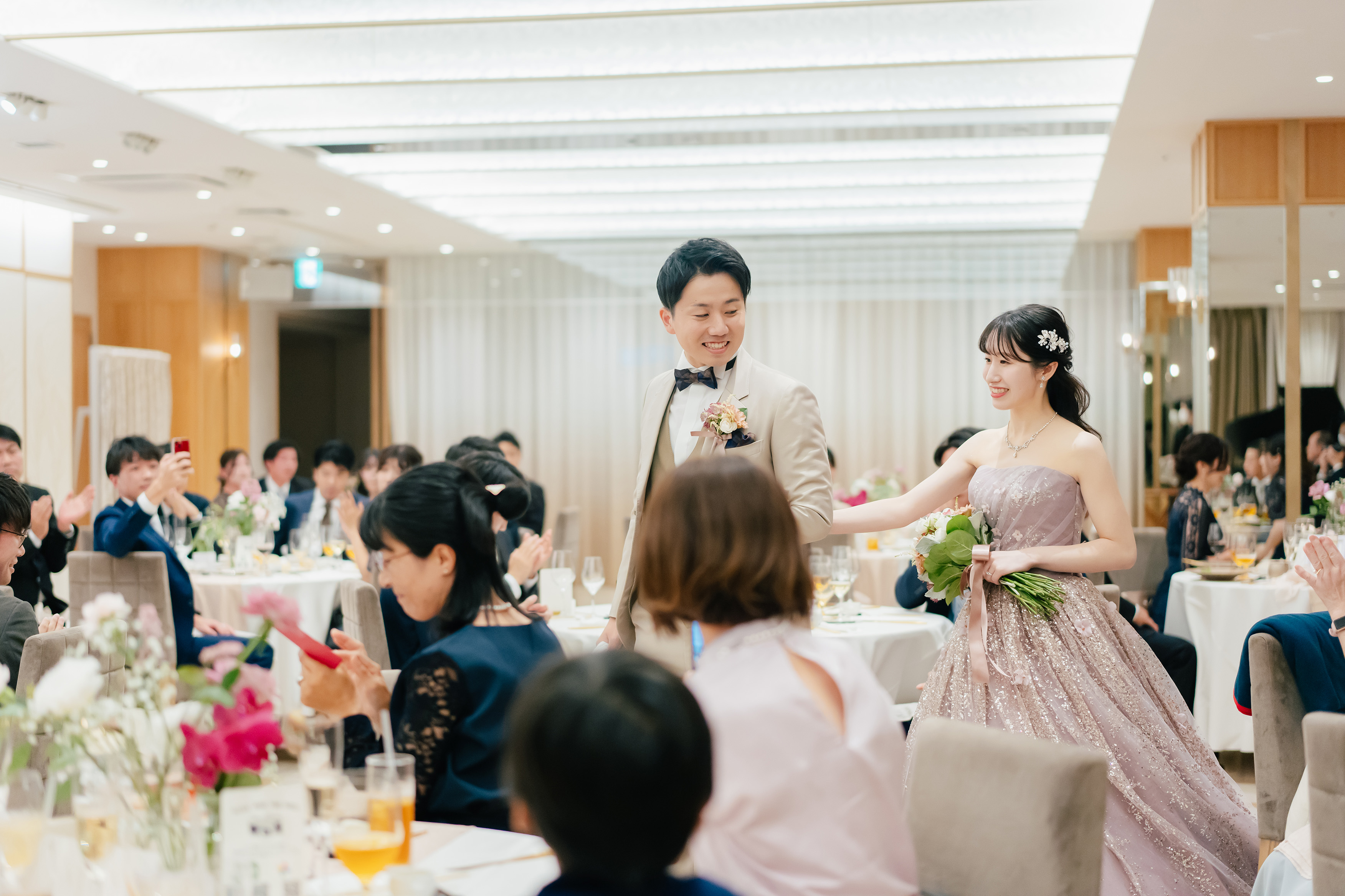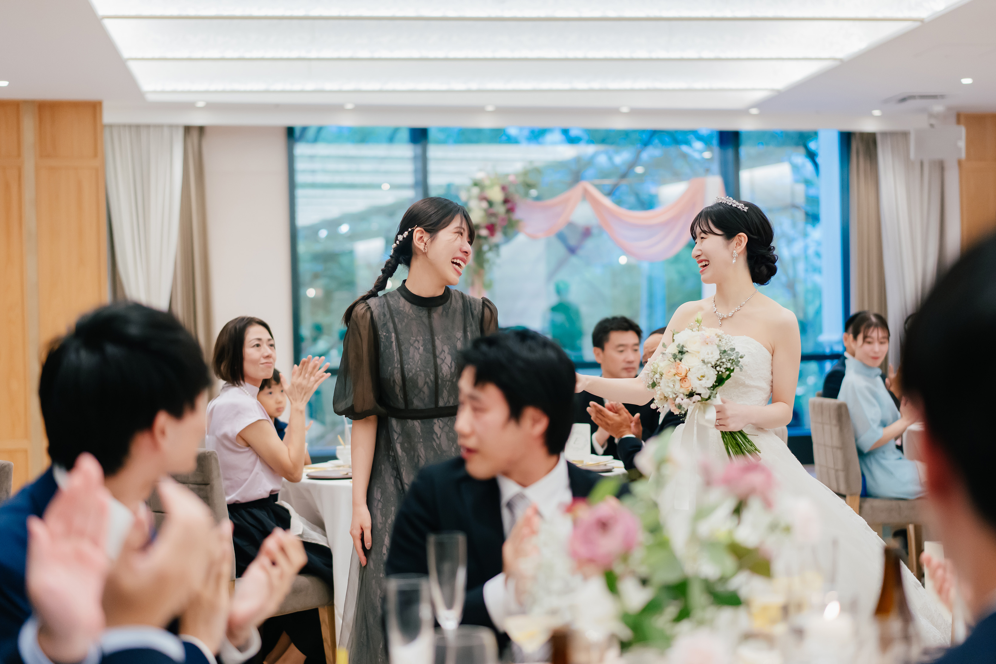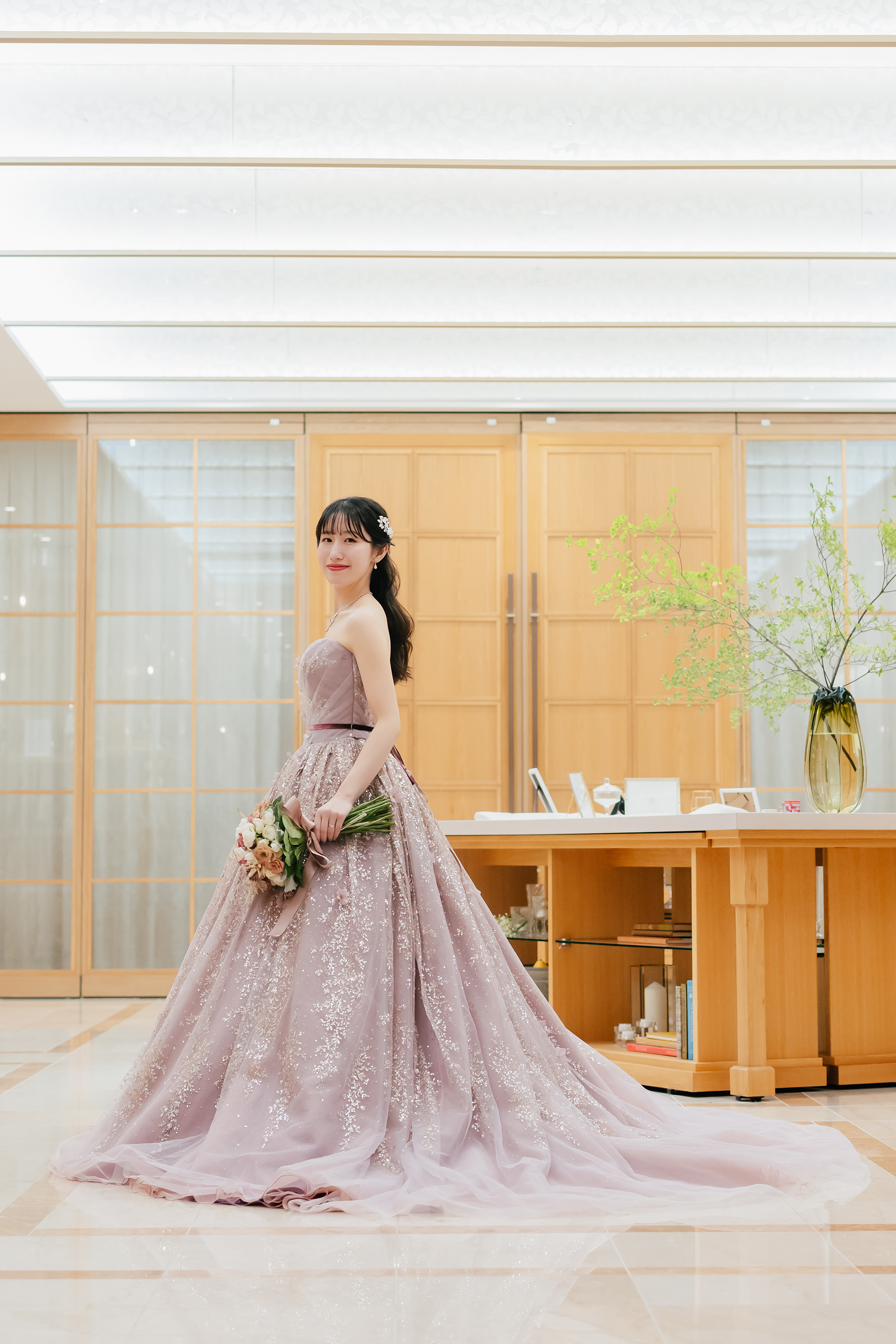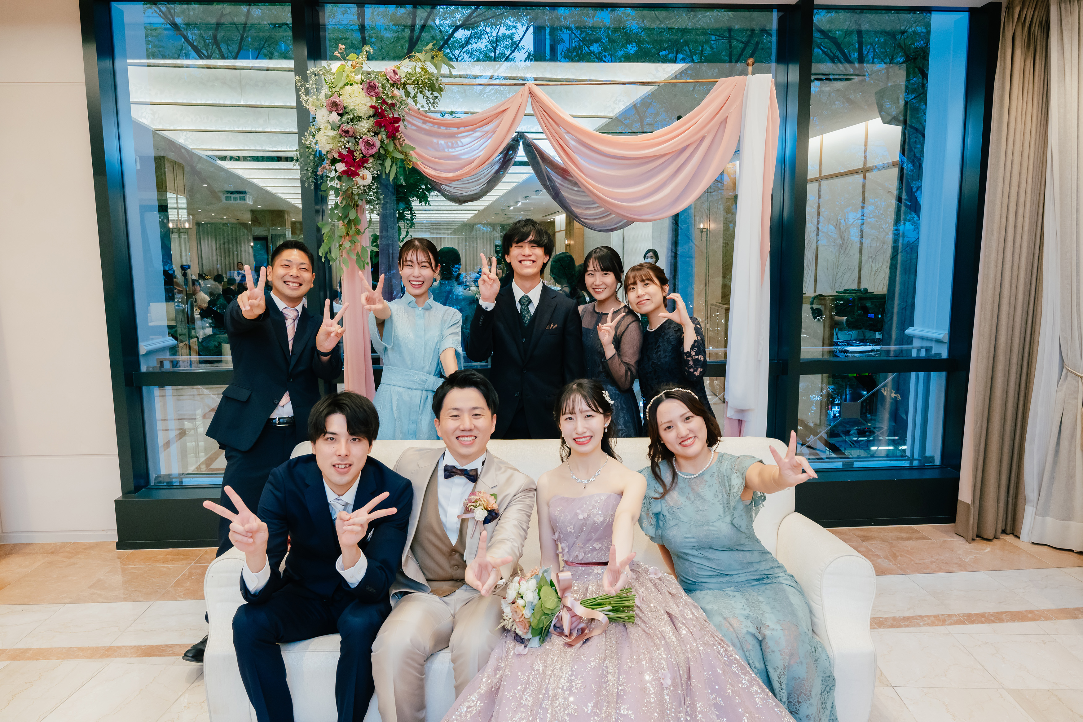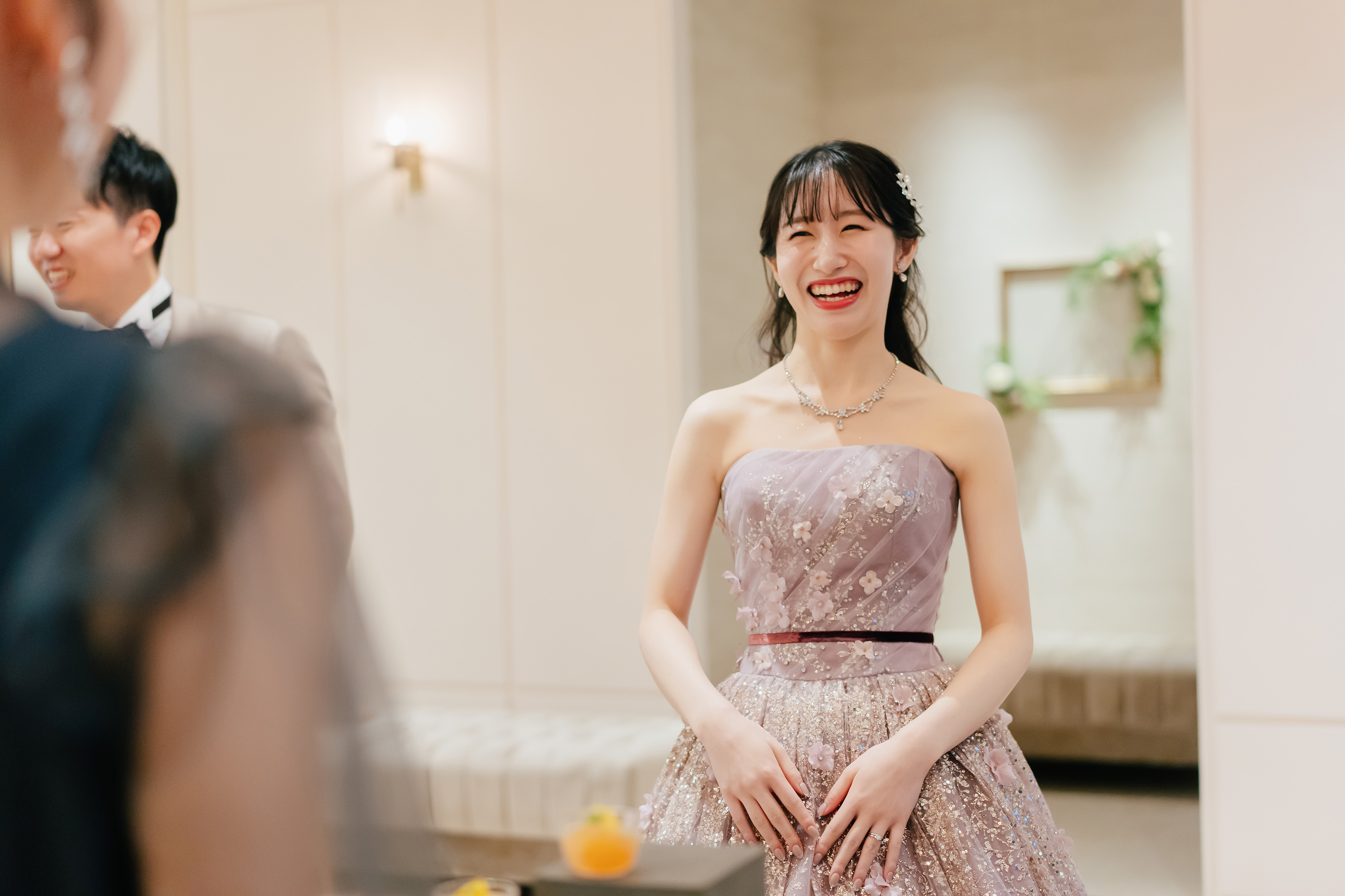 「Sharing love and happiness with a thankful heart in a relaxing atomosphere.」 をテーマにご準備を進めたおふたり。 ゲストのみなさまがリラックスして楽しめるよう、 会場はモーヴピンクやホワイトを取り入れて大人かわいい印象に。 また、より近い距離で楽しみたいという思いで設置したフォトスポットでは たくさんの素敵な笑顔を収めることができました。