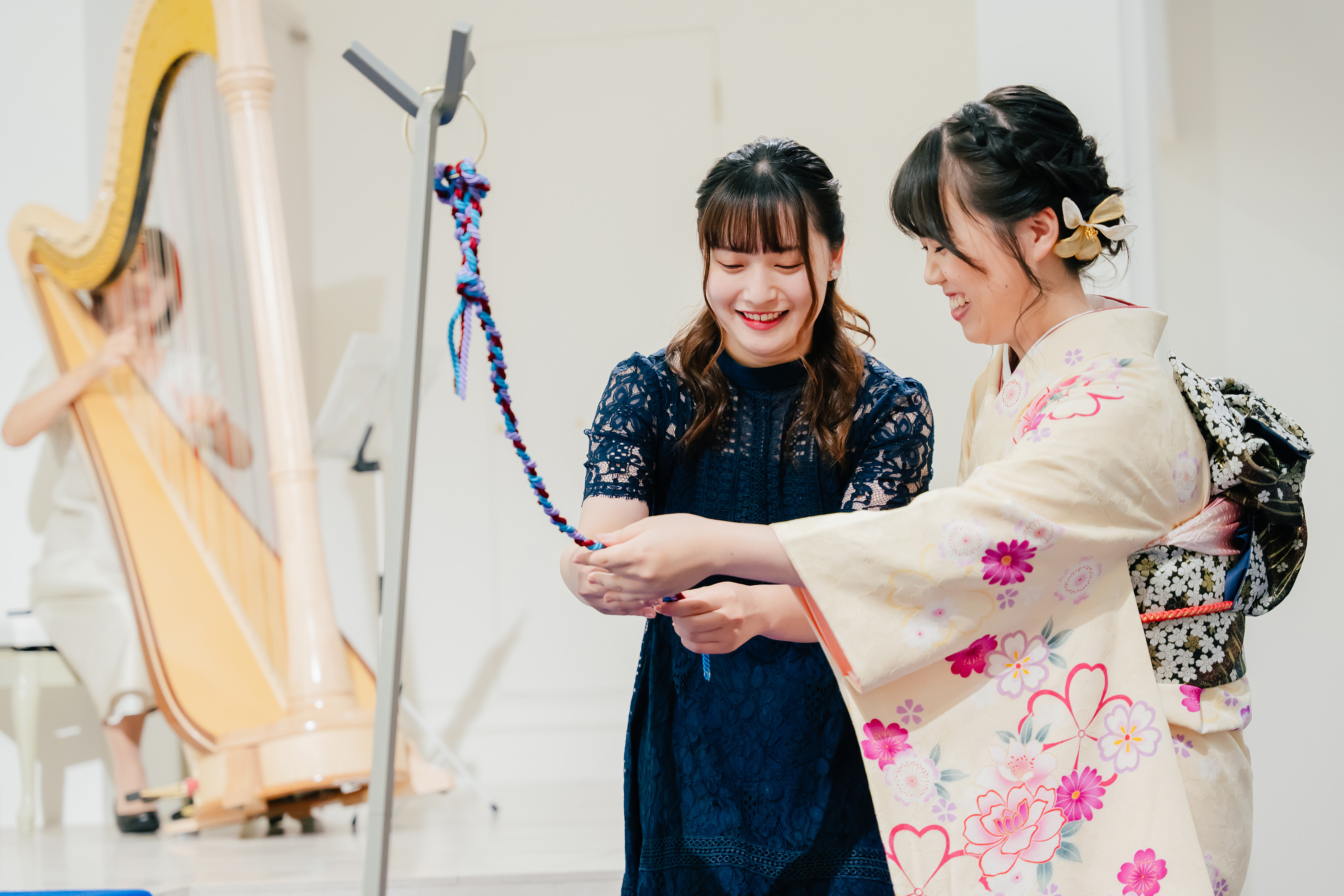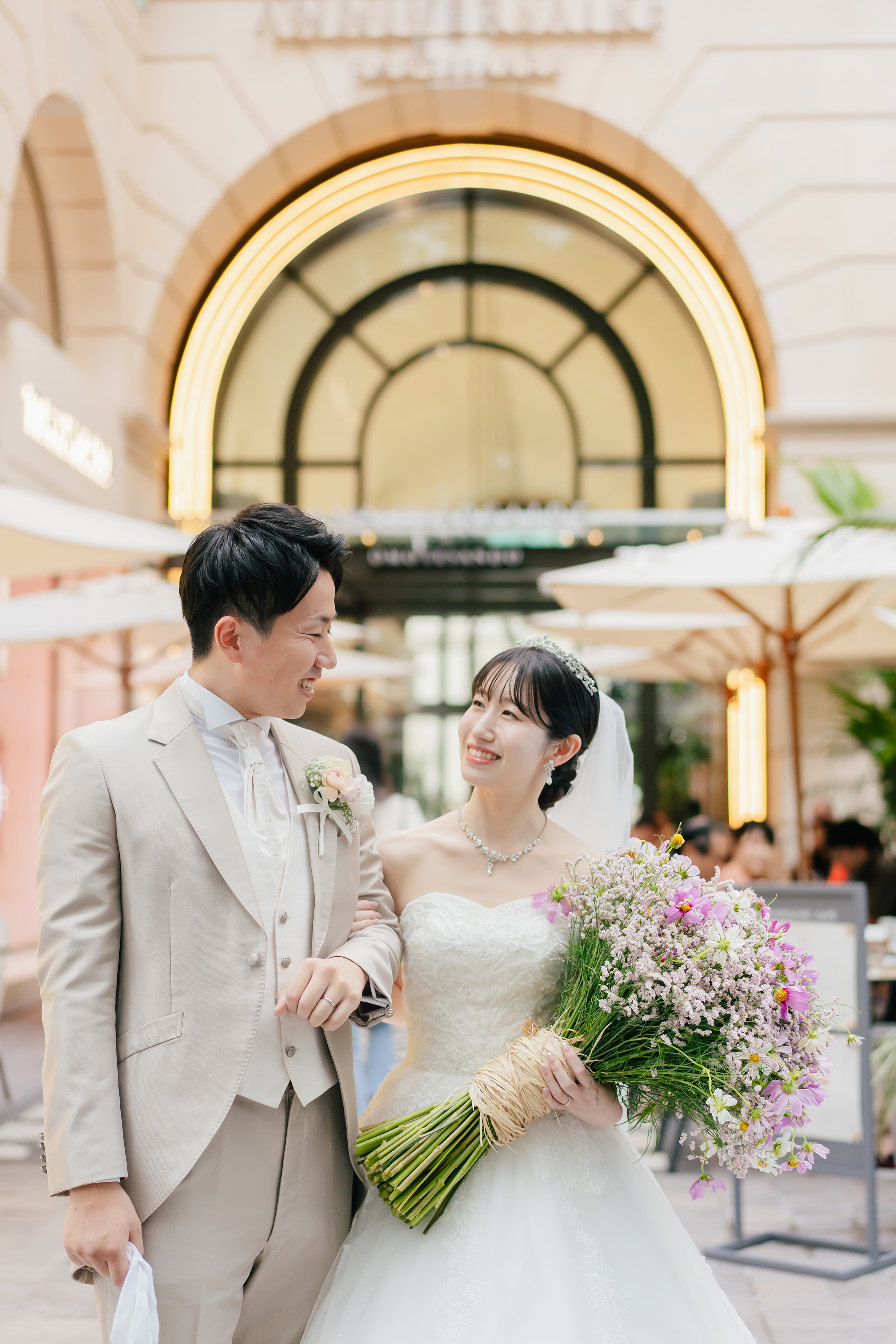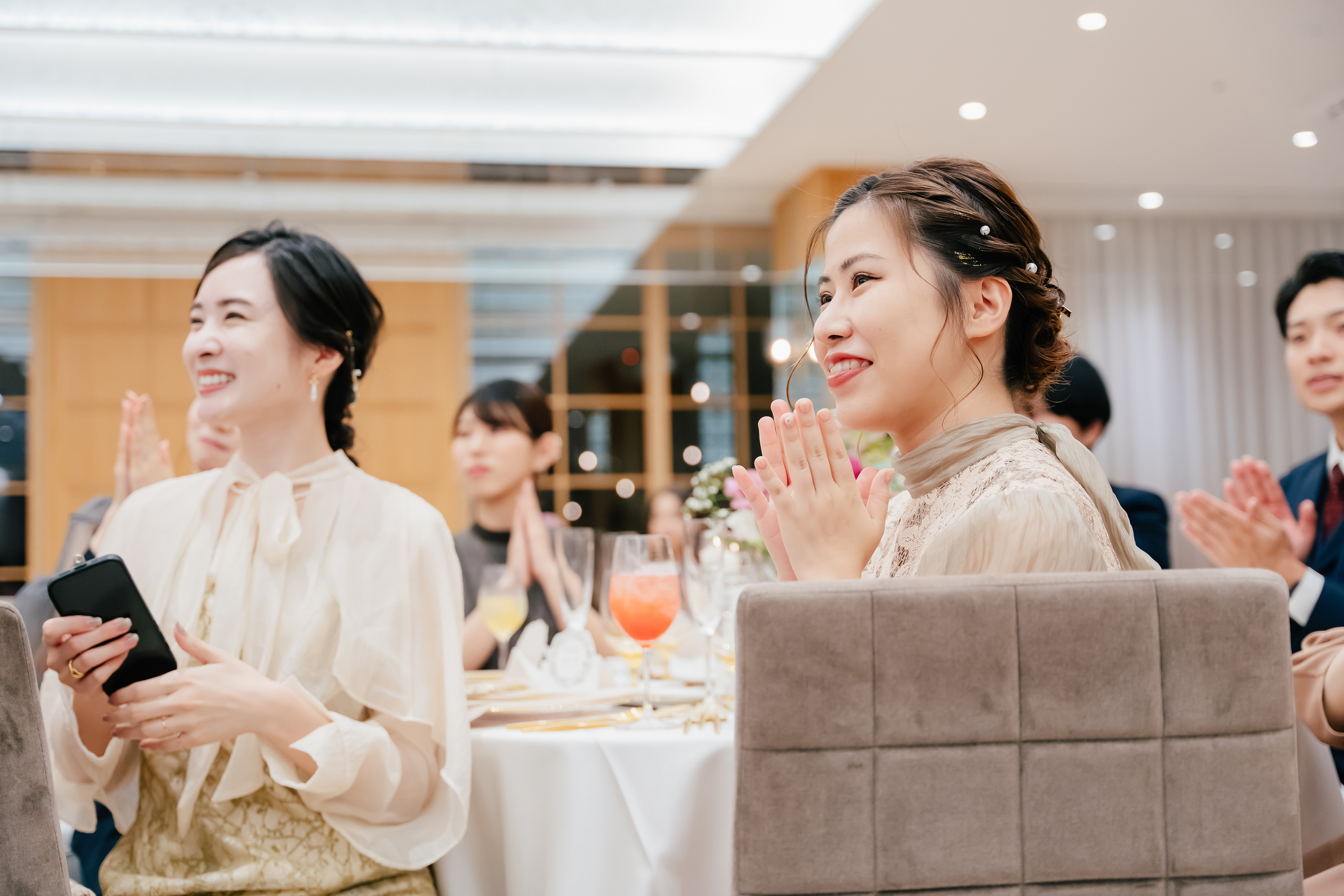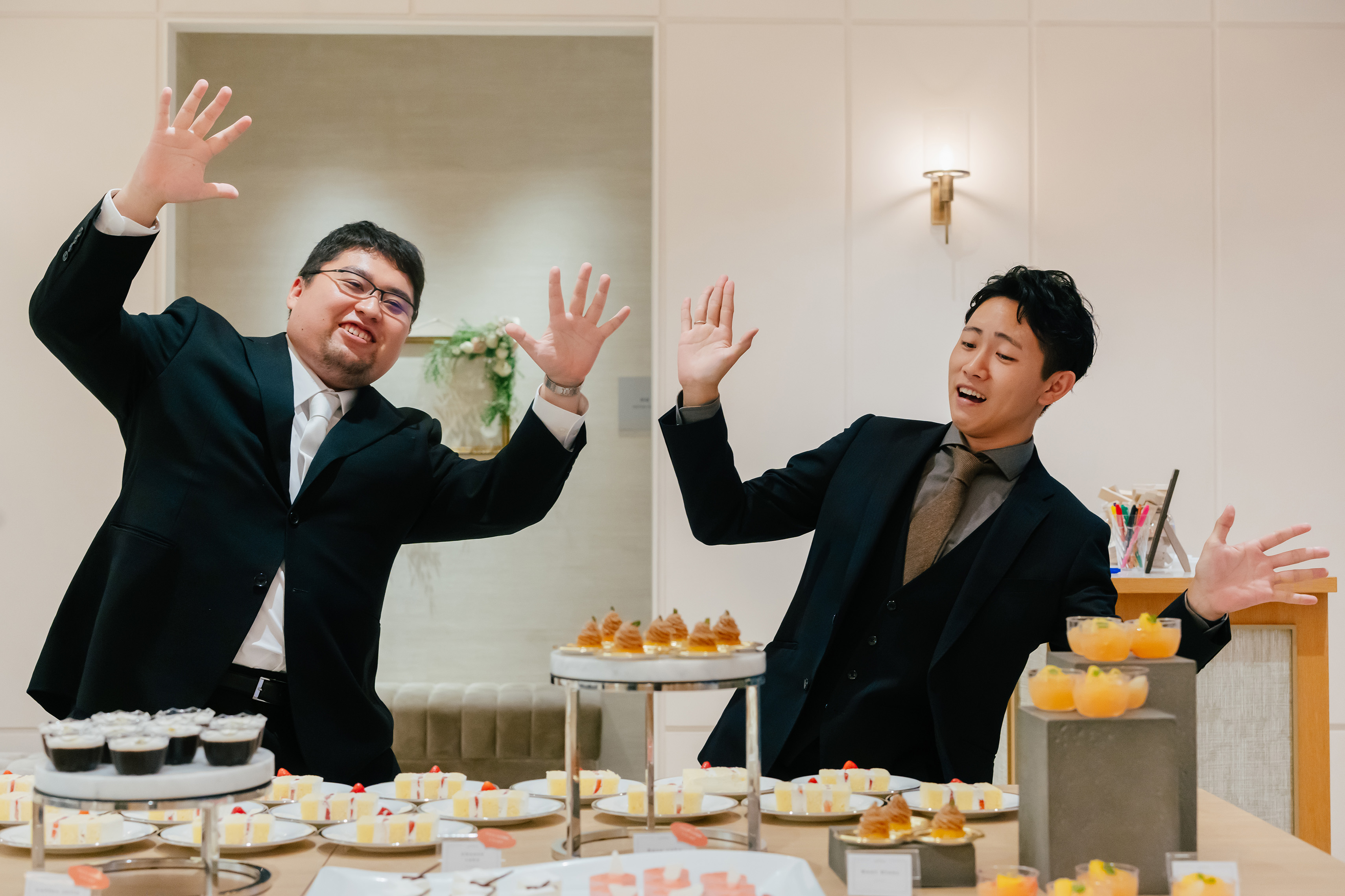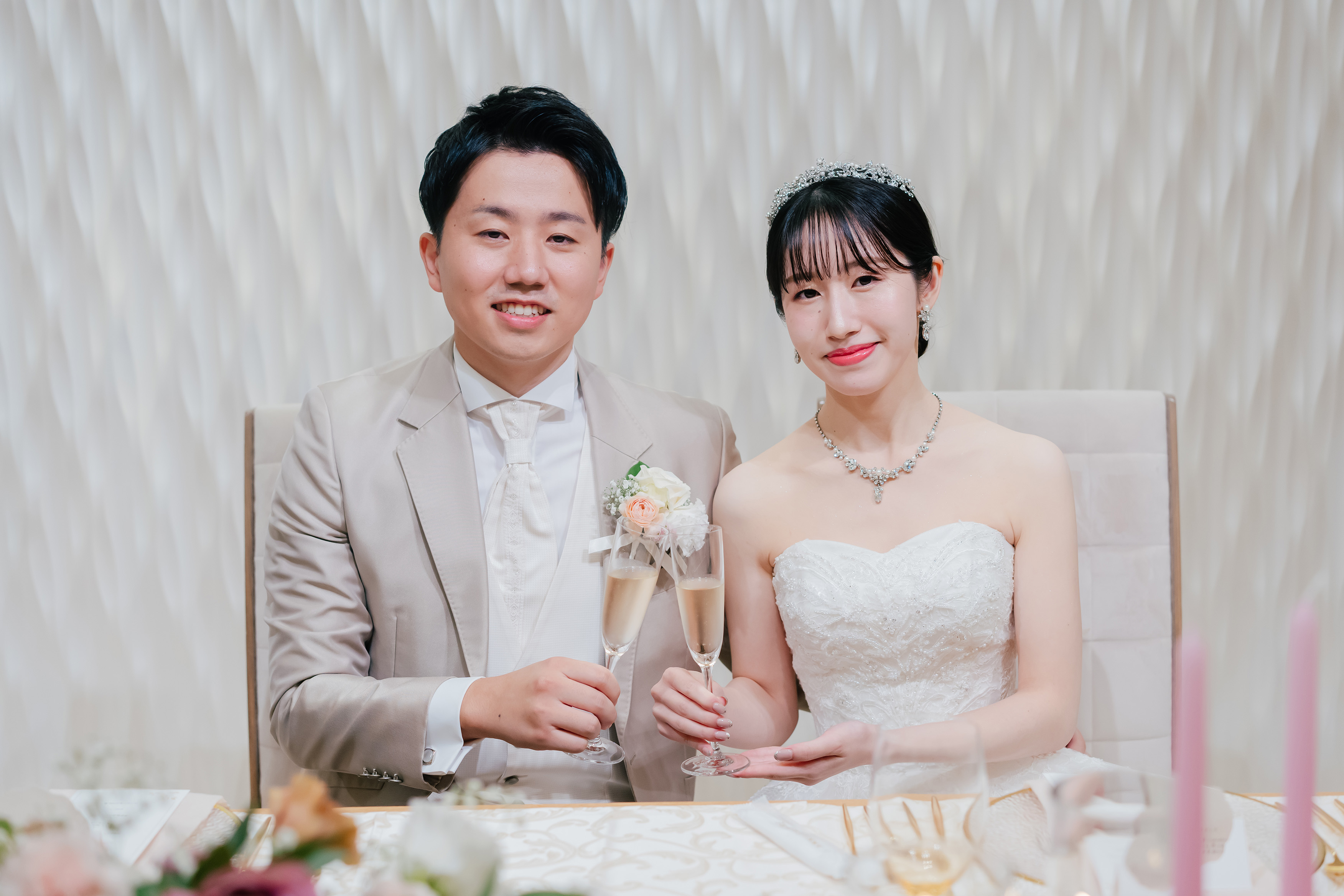 「Sharing love and happiness with a thankful heart in a relaxing atomosphere.」 をテーマにご準備を進めたおふたり。 ゲストのみなさまがリラックスして楽しめるよう、 会場はモーヴピンクやホワイトを取り入れて大人かわいい印象に。 また、より近い距離で楽しみたいという思いで設置したフォトスポットでは たくさんの素敵な笑顔を収めることができました。