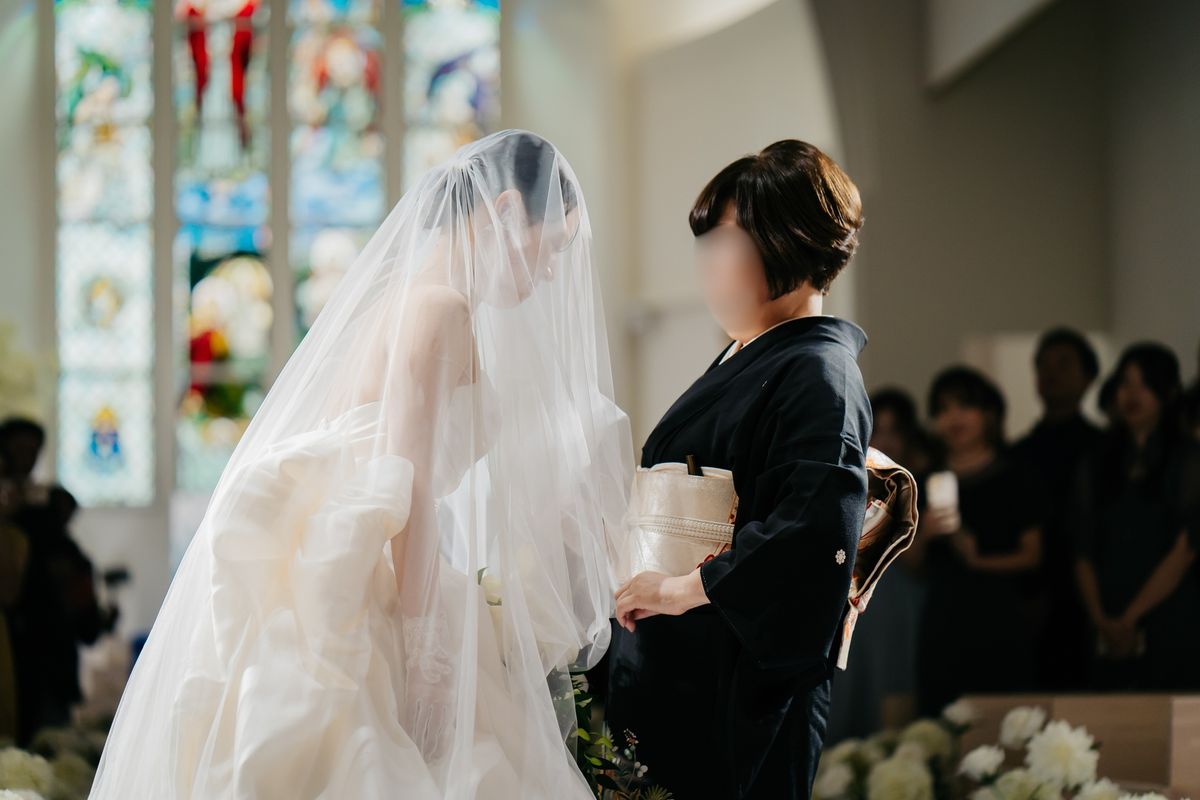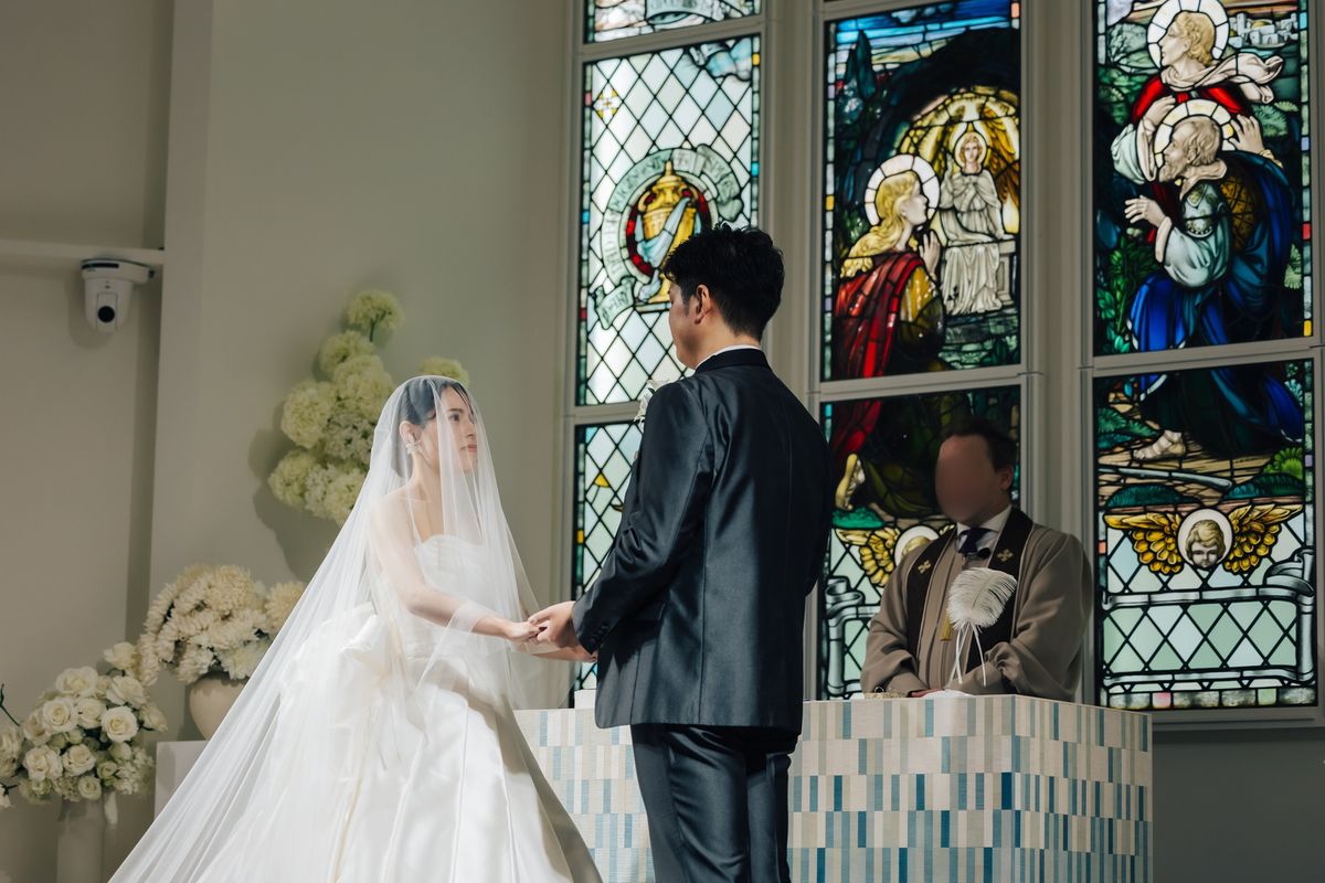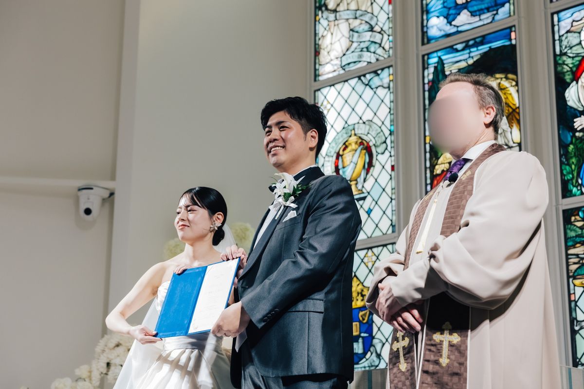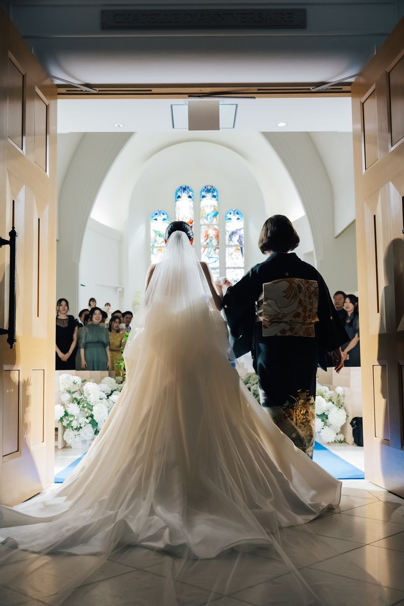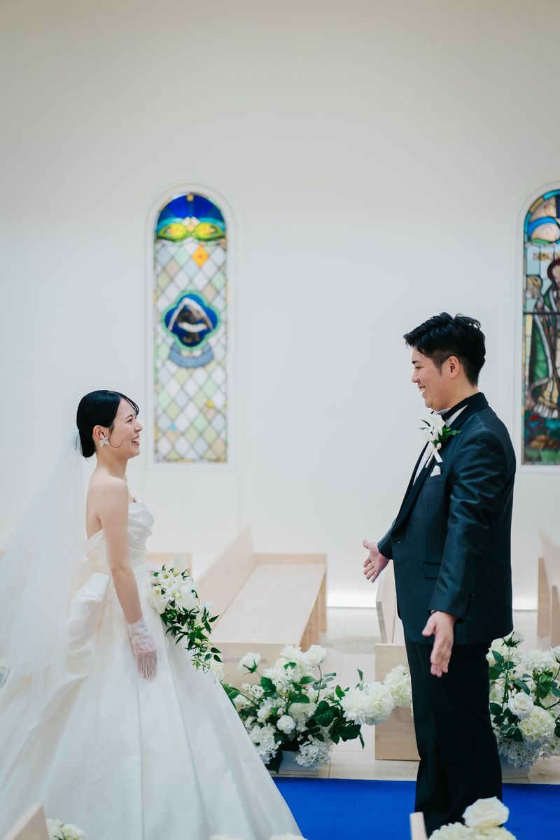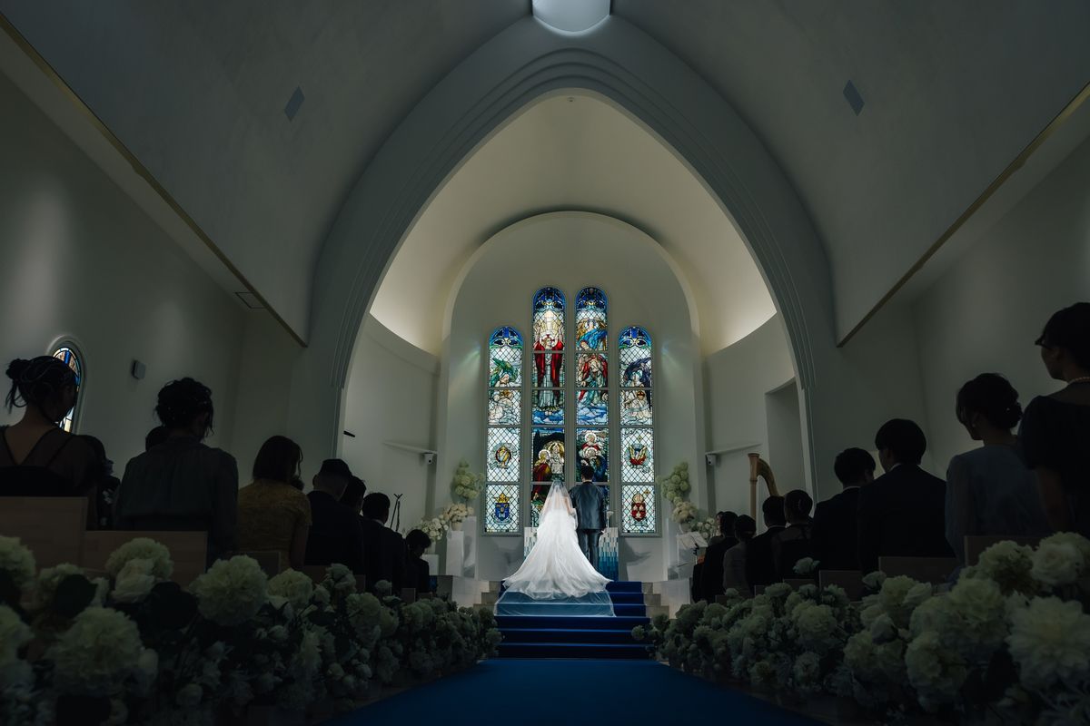 当式場のチャペルは全体が白く、鮮やかなステンドグラスや青いバージンロードが映えるのが特徴で、おふたりは式場見学時から気に入ってくださいました。天井が高く空間全体が広々としているため、70名の参列者でもゆったりと着席いただける広さがあります。 ご新婦は「チャペルが息をのむほど綺麗で…」と、入場前から感極まって涙をにじませていらっしゃいました。
