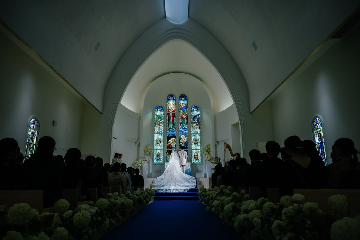 都心にありながら天井が高く、光に包まれるチャペルでは、扉が開いた瞬間に胸が高鳴る特別な挙式が叶います。参加してくれた保育園の子どもたちから見てもイメージ通りの花嫁になるため、ウエディングドレスは「とにかく王道で誰がどう見ても花嫁とわかる」ということにこだわられたご新婦。長くなびくトレーンや、アクセサリー・ヘッドパーツのきらめきも、「王道の花嫁姿」を演出していました。