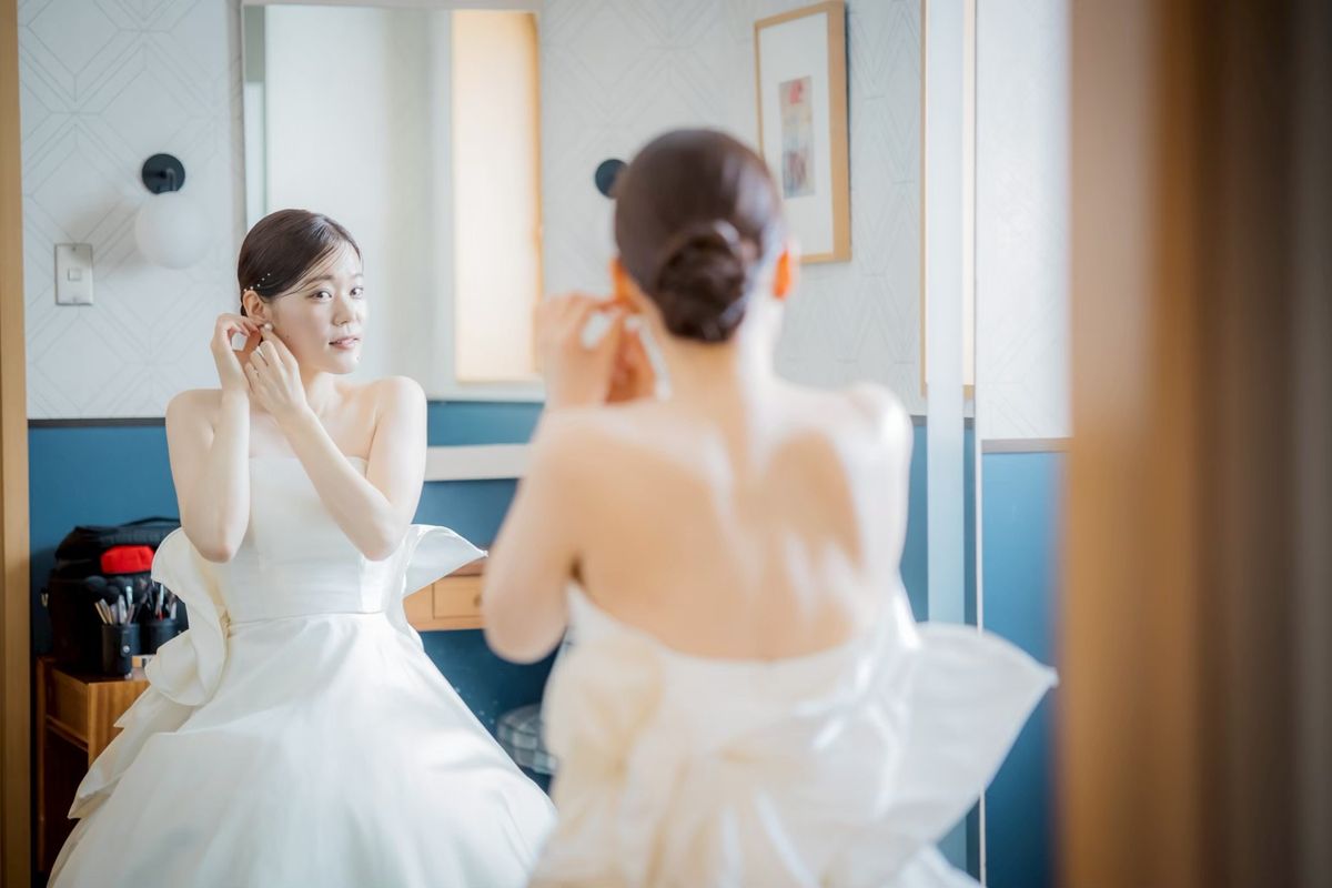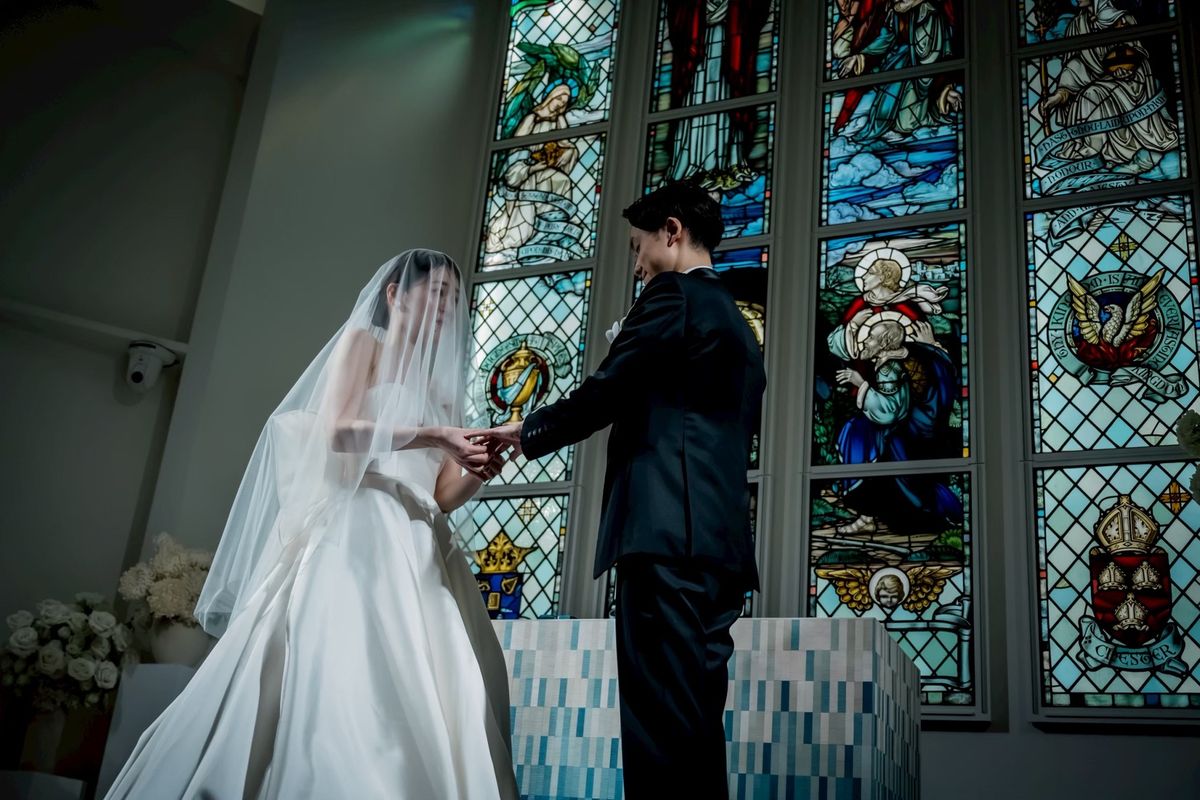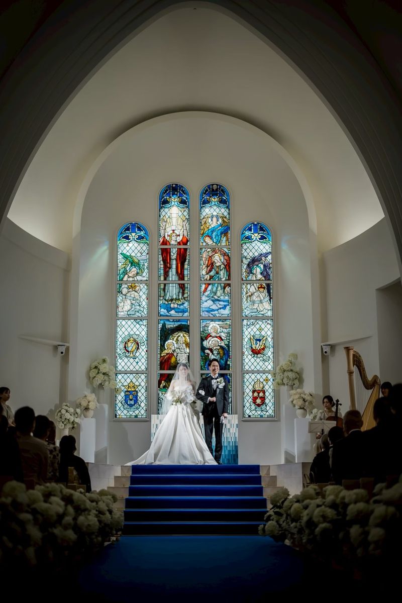 チャペルのお気に入りポイントは、青いバージンロードが写真映えするところだそう。人前式を選ばれたことで自由度が高く、おふたりで考えたオリジナルの演出も取り入れています。演出はゲストの皆様からも好評で、喜ばれていらっしゃいました。挙式では、ANTONIO RIVAの「SOUDEH」を着用。生クリームのようなドレスの生地感に惹かれて選んだ一着で、後ろ姿を彩るリボンのフォルムも素敵でした。