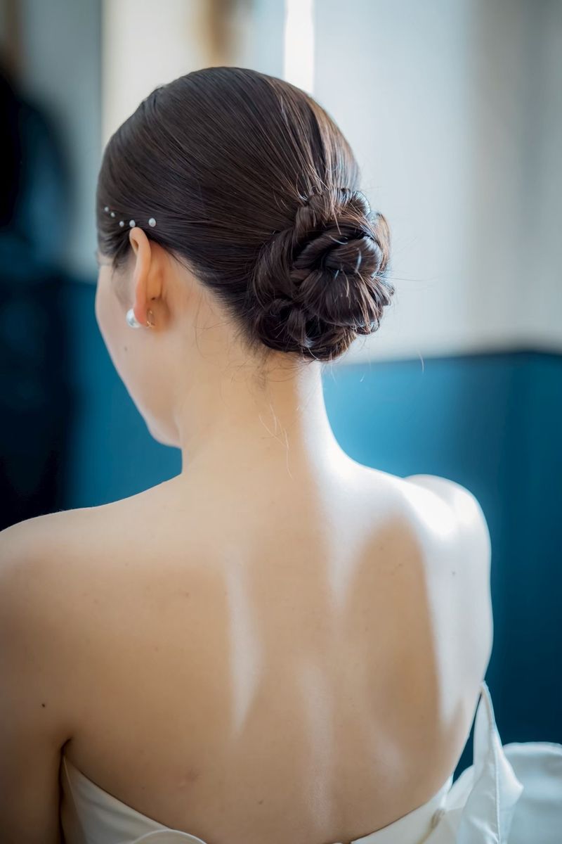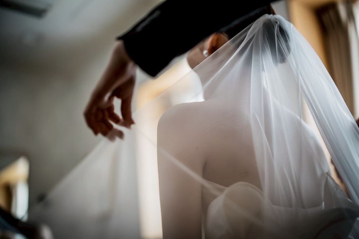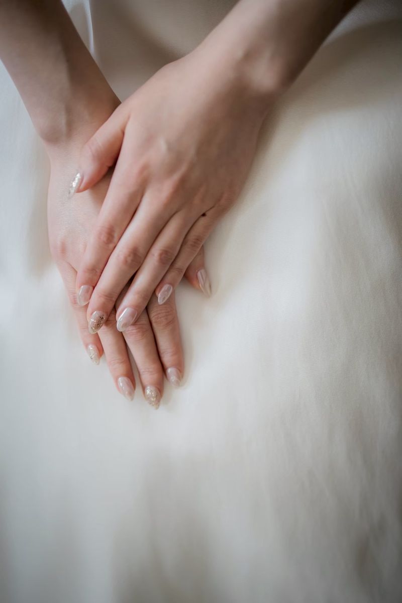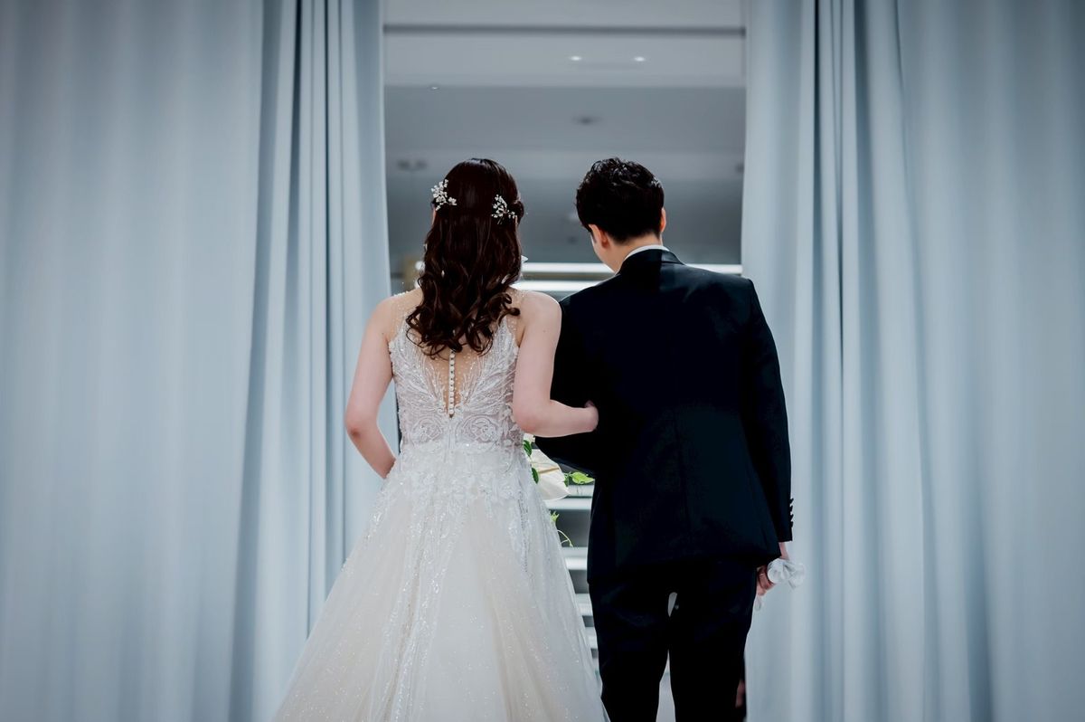 チャペルのお気に入りポイントは、青いバージンロードが写真映えするところだそう。人前式を選ばれたことで自由度が高く、おふたりで考えたオリジナルの演出も取り入れています。演出はゲストの皆様からも好評で、喜ばれていらっしゃいました。挙式では、ANTONIO RIVAの「SOUDEH」を着用。生クリームのようなドレスの生地感に惹かれて選んだ一着で、後ろ姿を彩るリボンのフォルムも素敵でした。