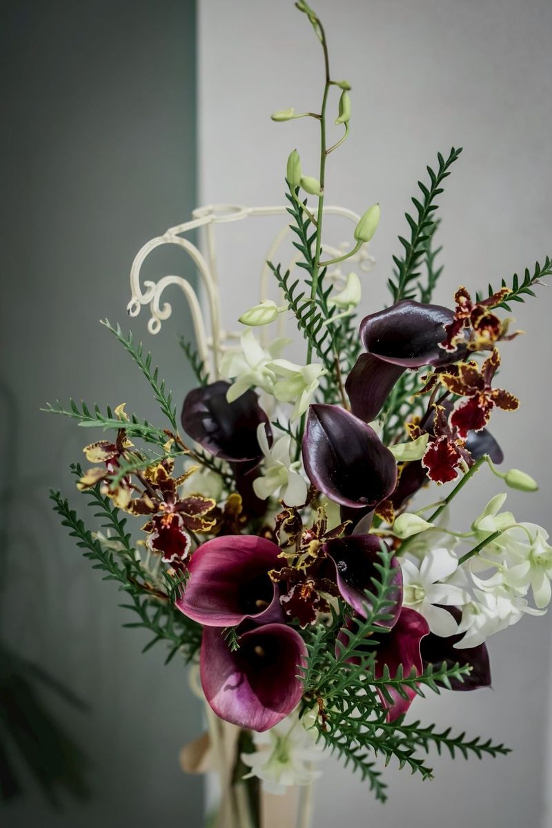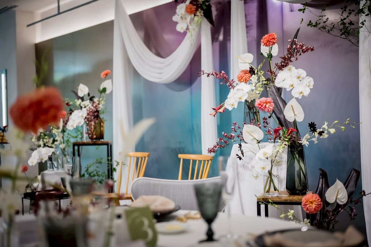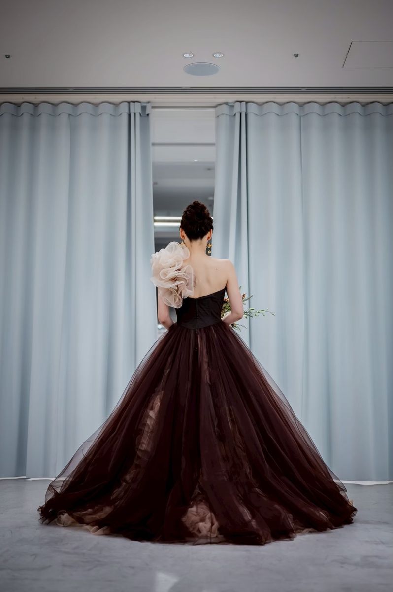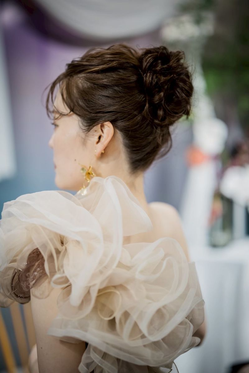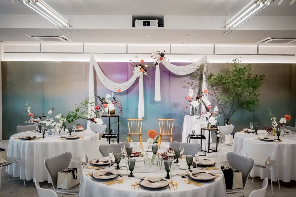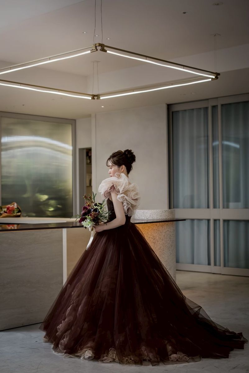 披露宴会場は洗練された雰囲気で、アイテムを追加しなくても空間として完成されています。装飾については、デッサンを見ながら細かく打ち合わせを行い、クロスや食器に至るまでイメージに合わせて選ばれました。お色直しのドレスはMW BY MAGNOLIA WHITEの「Melody」とTAKAMI BRIDALの「Brown Nona」を選び、ドレスに合わせてブーケにもこだわっています。