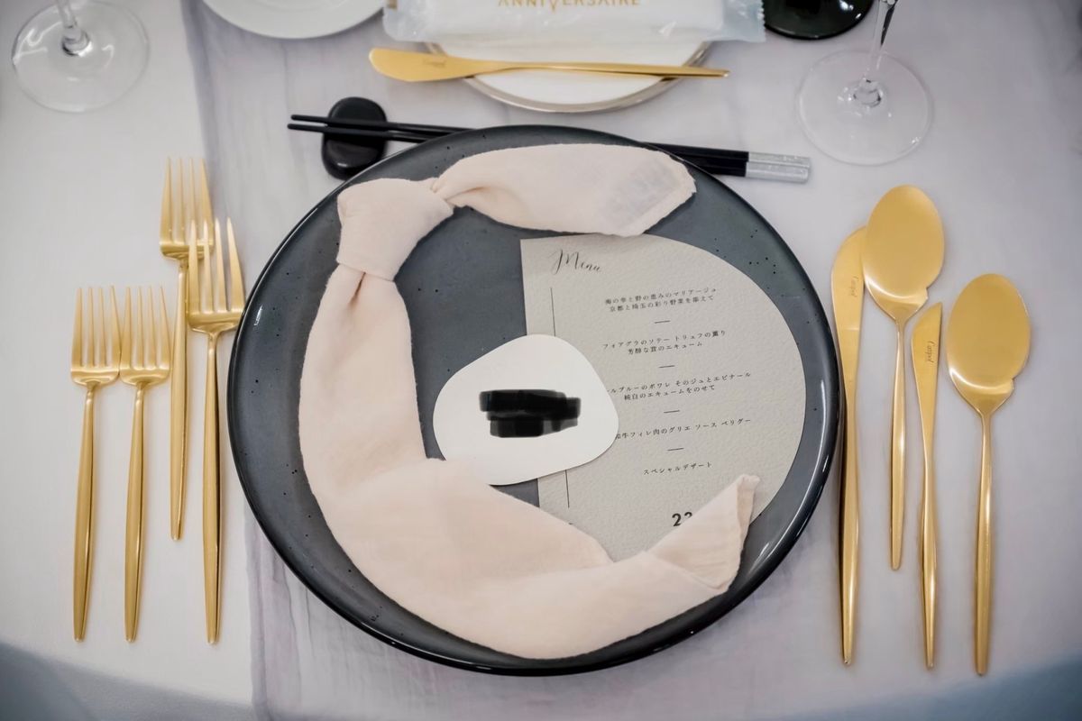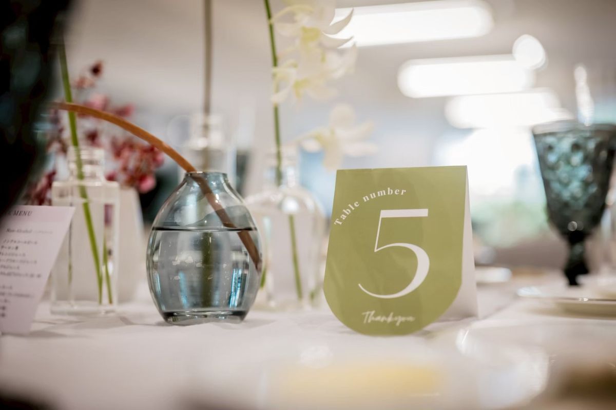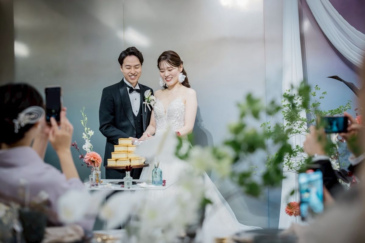 料理の美味しさや披露宴会場の雰囲気、アクセスの良さが式場の決め手になったというおふたり。準備期間にはメニュー表やポップをCanvaで作成し、カットまで行われています。テーマがしっかり決まっていることがアイテム選びをしやすいポイントになったようです。オープニングやプロフィール・チャペル映像はご新郎の手作りで、オープニングムービーには司会者とプランナーも出演させていただき、素敵な思い出になりました。