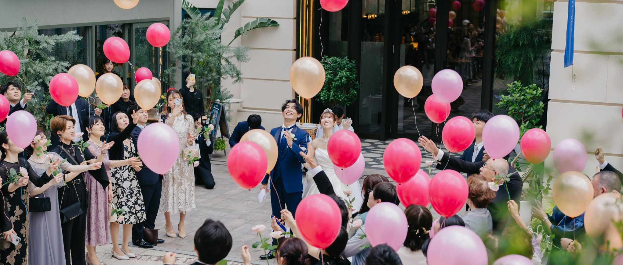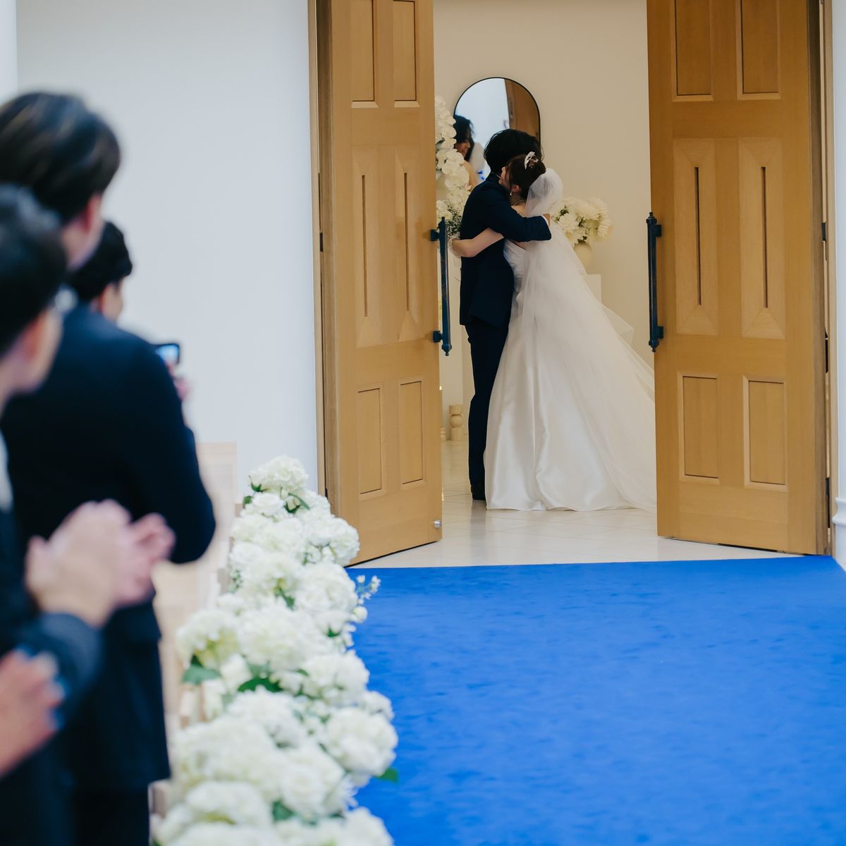 青いバージンロードとステンドグラスが映えるチャペルでは、親御様への感謝の想いをチャペルムービーで伝え、厳かな中にも温かさが漂いました。さらに、表参道を歩くページェントや大都会でのバルーンリリースなど、この式場ならではの演出が叶い、忘れられない体験に。ご新婦の想いを反映したドレスやリボンのモチーフも華やかさを添え、ゲストからも「感動した」と多くの声があがっていました。