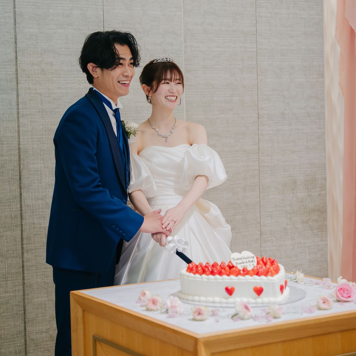 自由度の高いウェルカムスペースを生かし、広い空間でのパーティを実現。リボンやピンクをテーマに装飾し、ドレス色当てクイズや歌の入場など、おふたりらしい演出で大いに盛り上がりました。また、似顔絵リレーやメッセージ入り席札などの工夫で、ゲスト一人ひとりに感謝が伝わる時間に。華やかな装花と可愛いケーキも彩りを添え、心温まる披露宴になりました。